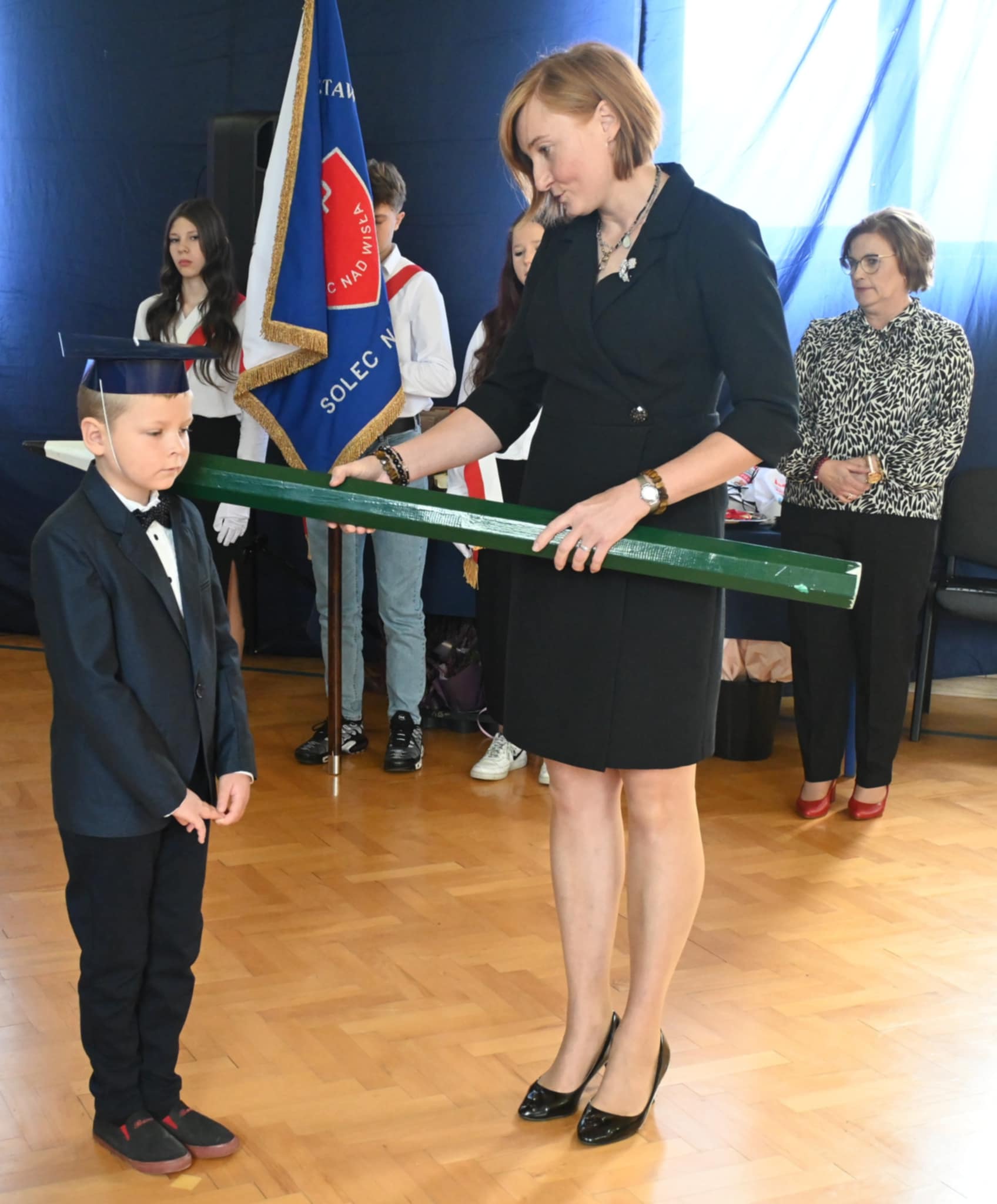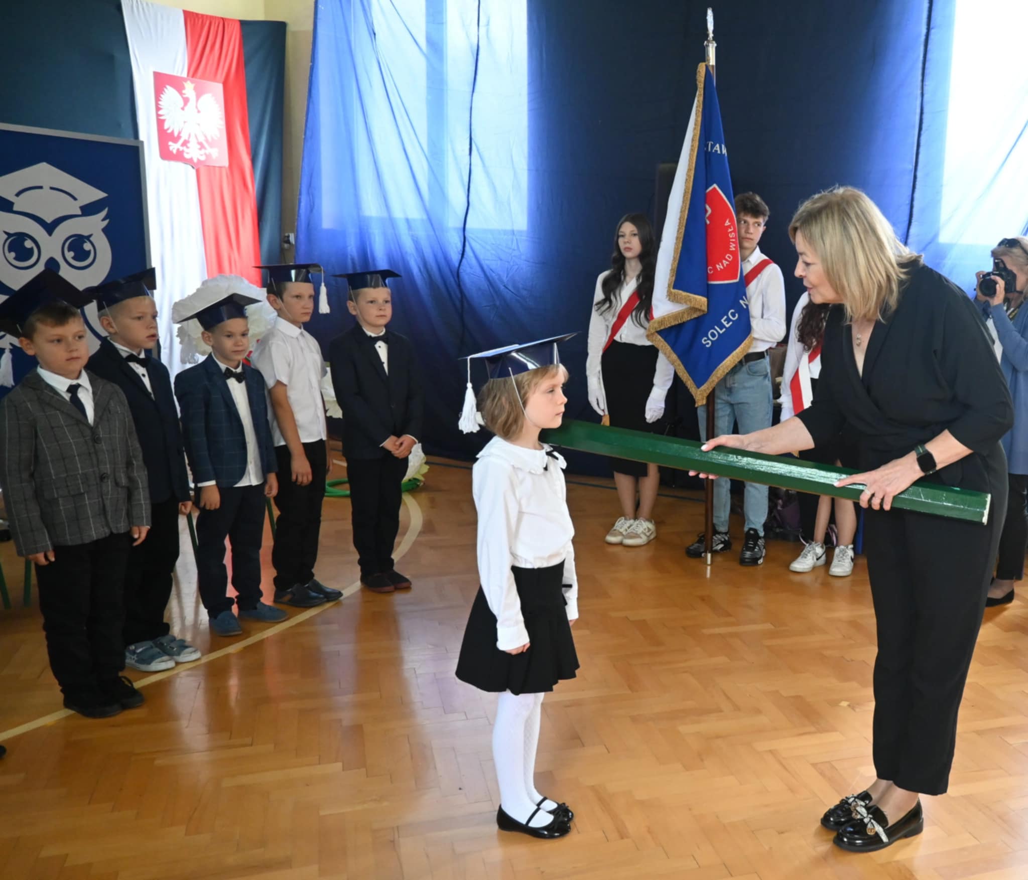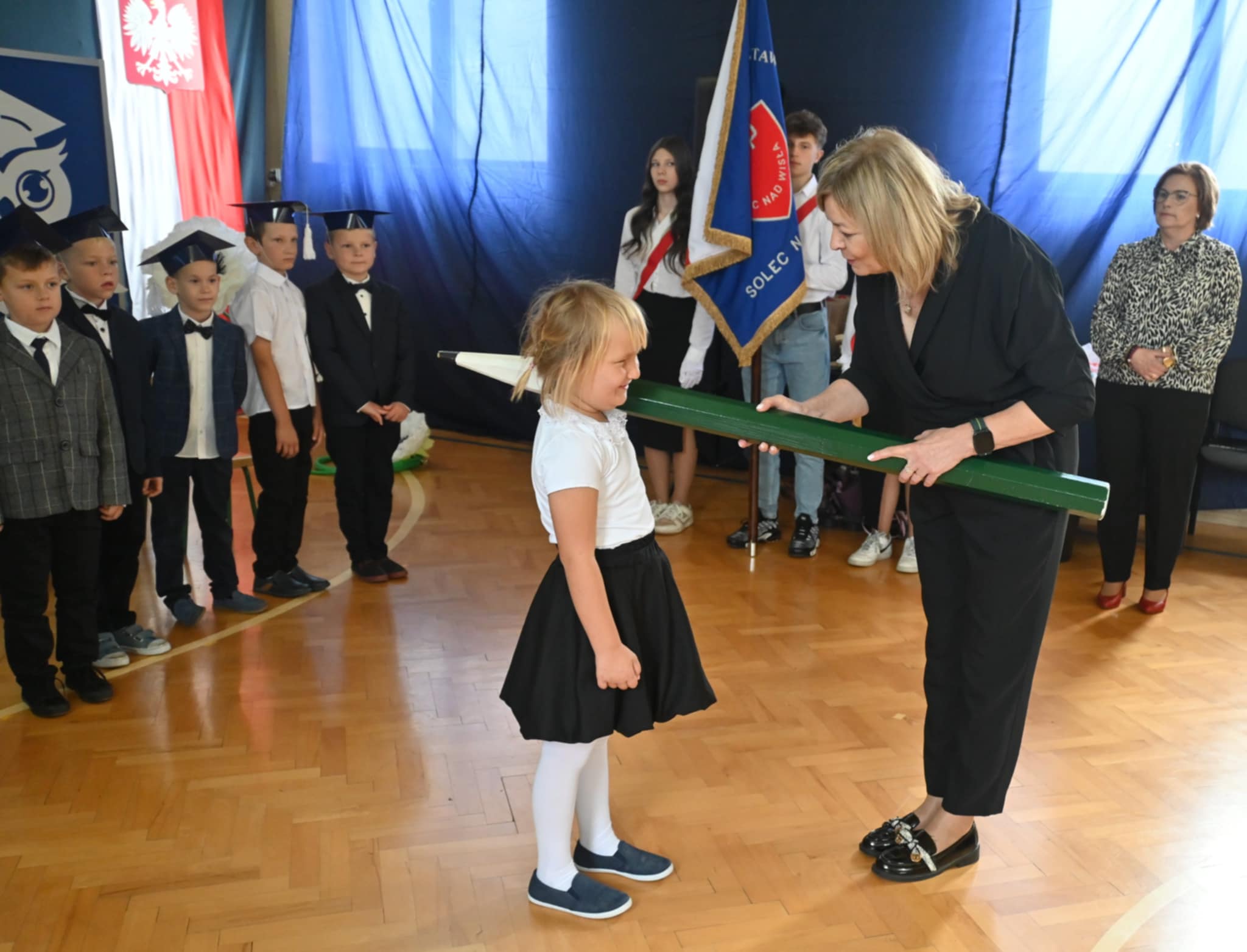 Najważniejszym momentem uroczystości było pasowanie na ucznia, którego dokonały Pani Burmistrz i Pani Dyrektor. Od tej chwili nasi najmłodsi uczniowie stali się pełnoprawnymi członkami szkolnej społeczności.
