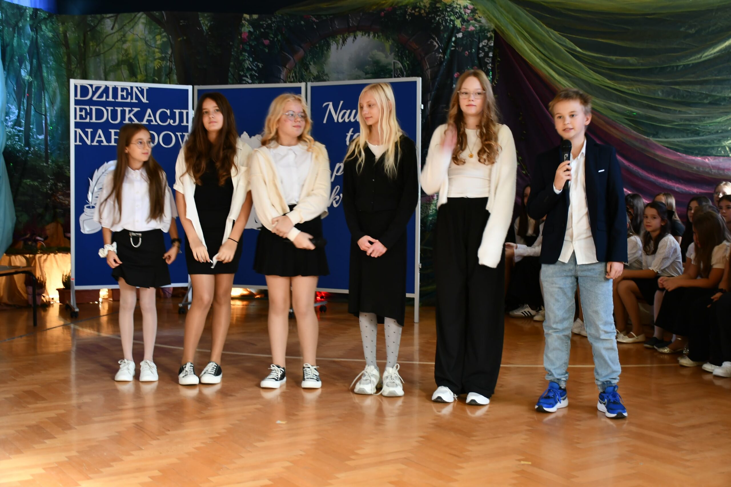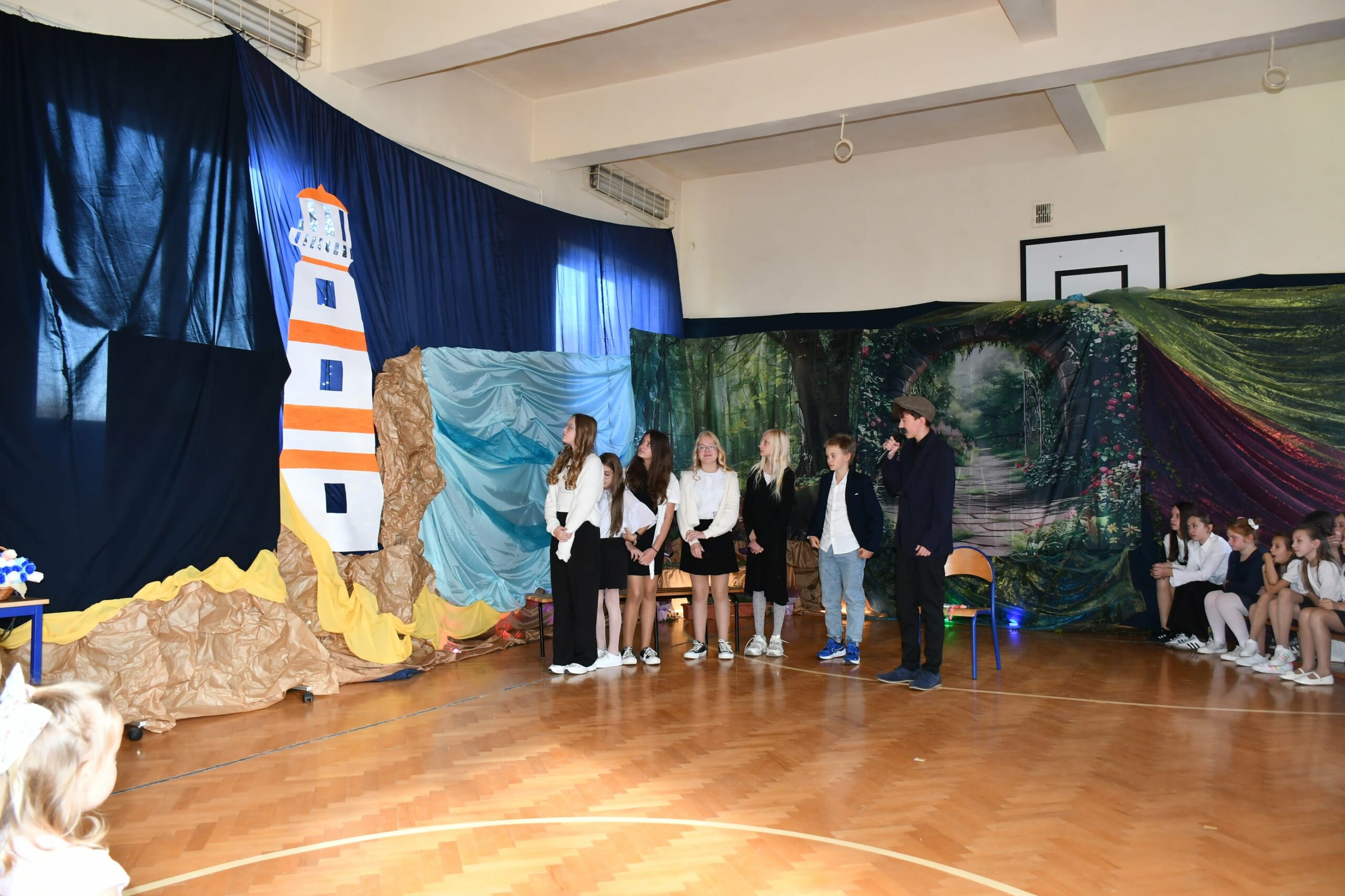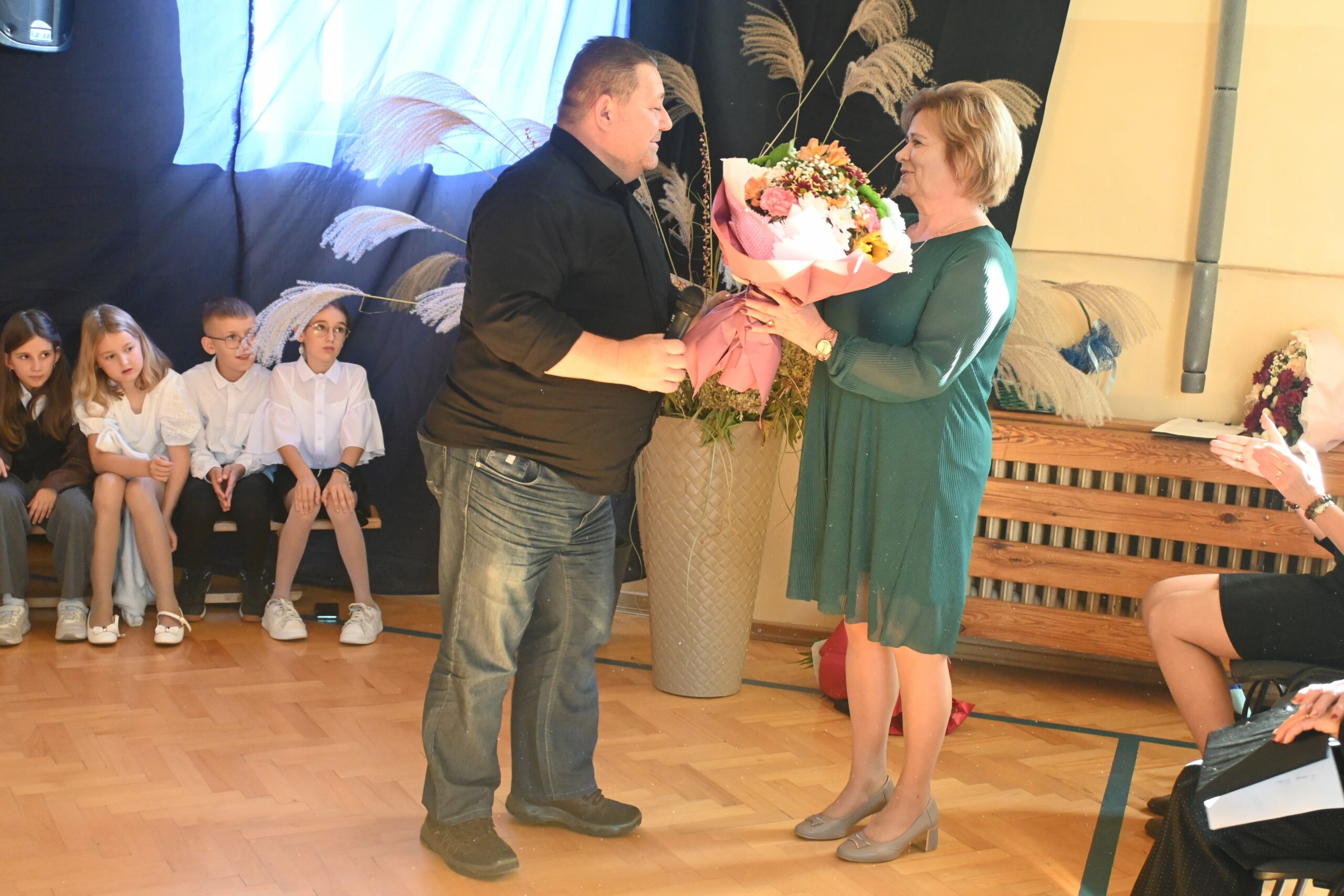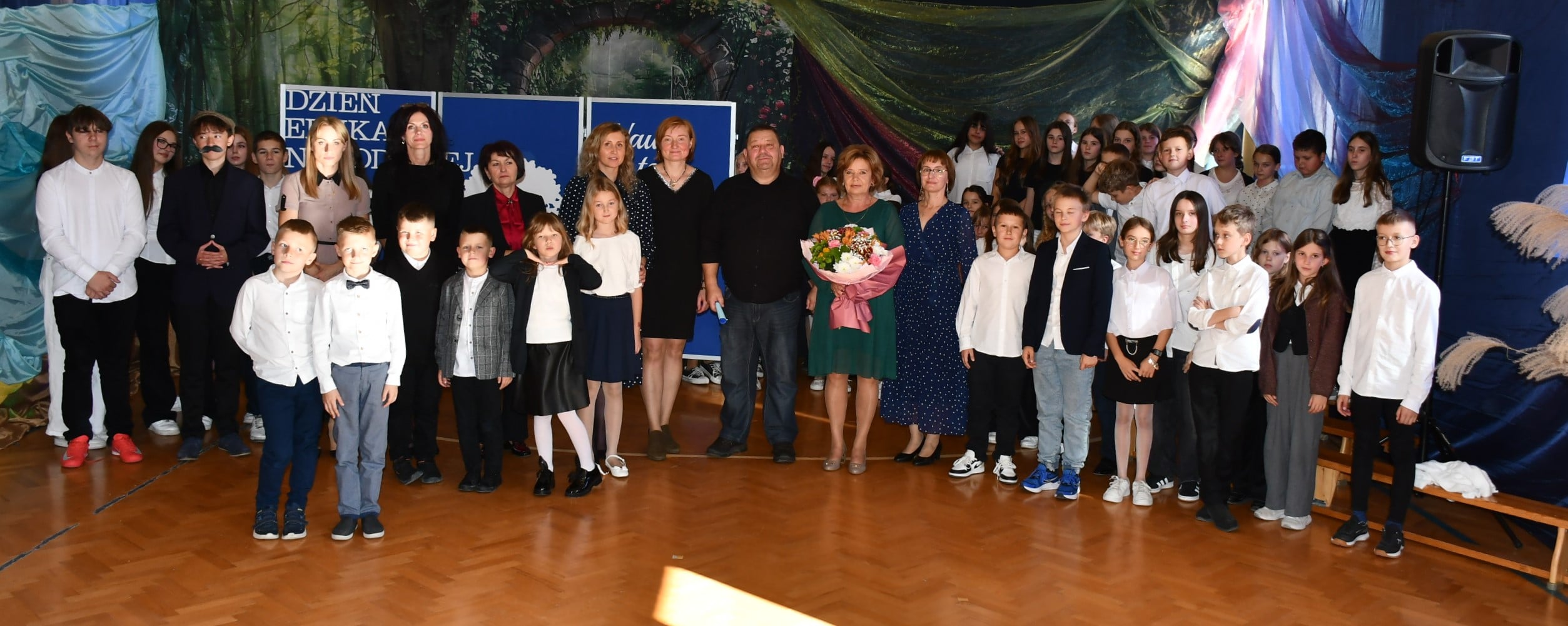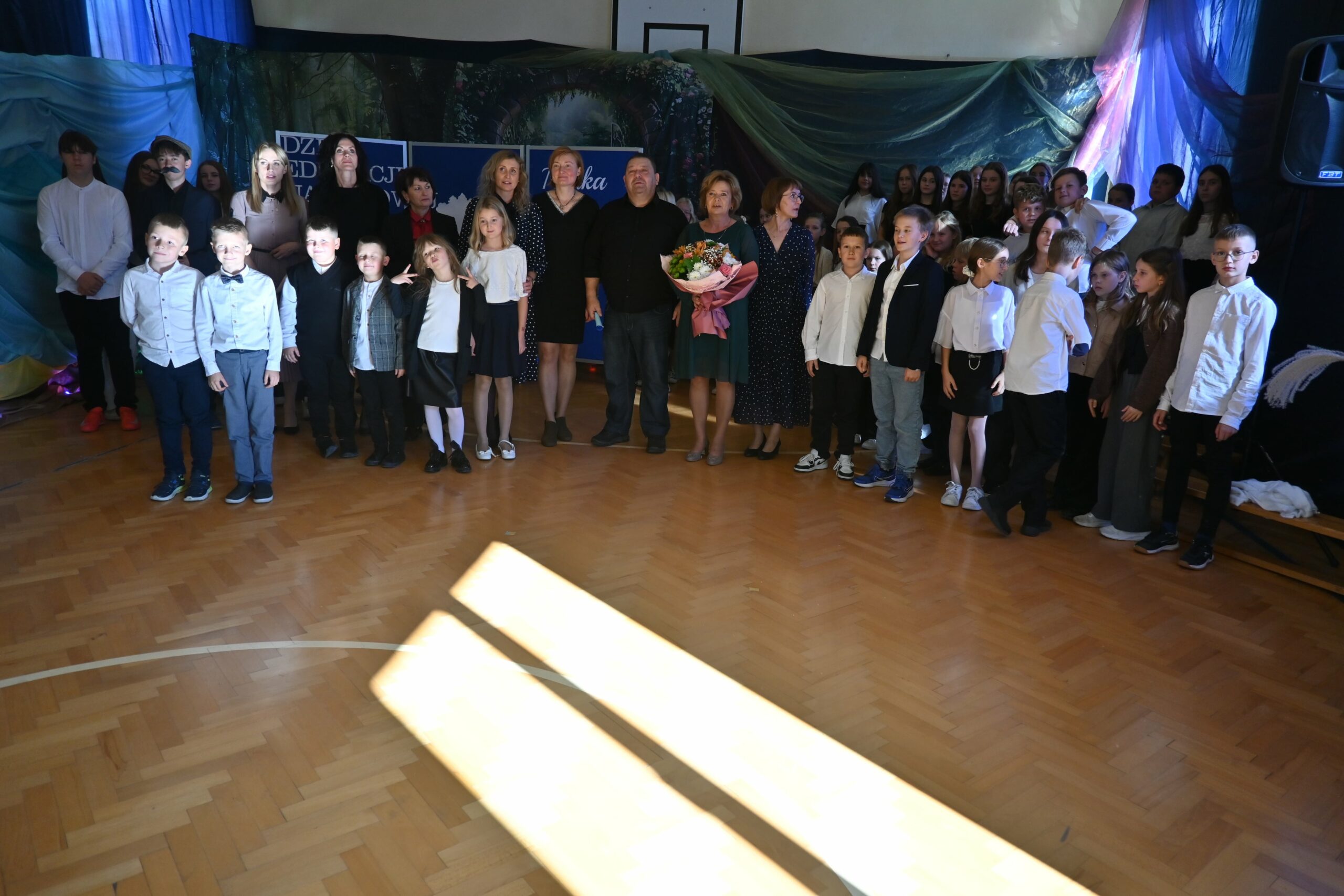 16 października w naszej szkole obchodziliśmy Dzień Edukacji Narodowej – wyjątkowe święto, w którym szczególnie wybrzmiewają słowa wdzięczności i uznania wobec wszystkich, którzy tworzą szkolną wspólnotę. Tego dnia w murach szkoły spotkali się nauczyciele, pracownicy, uczniowie oraz zaproszeni goście, by wspólnie świętować i wyrazić wdzięczność za trud, serce i zaangażowanie w codzienną pracę. Z tej okazji Samorząd Uczniowski przygotował wyjątkowy program artystyczny pt. Zaczarowany pamiętnik. Nasi utalentowani aktorzy z klas 5 i 8 zabrali wszystkich w niezwykłą podróż w czasie – aż do roku 3395. Tam spotkali nauczyciela z przyszłości, który przypomniał im, jak wielką rolę odgrywa pedagog w życiu młodego człowieka – w jego wychowaniu, rozwoju i poszukiwaniu własnej drogi. Poruszeni jego historią, uczniowie powrócili do teraźniejszości, by w imieniu wszystkich uczniów wyrazić wdzięczność tym, którzy każdego dnia z sercem i oddaniem kształtują ich świat. Tego dnia słowo dziękuję nabrało szczególnej mocy i wybrzmiało z głębi serc całej społeczności szkolnej. Wyrazy najwyższego uznania skierowano do nauczycieli – za mądrość, cierpliwość i poświęcenie, z jakim każdego dnia prowadzą uczniów ścieżką wiedzy. Za umiejętność dostrzegania w każdym dziecku jego wyjątkowości, za słowa otuchy, które dodają sił, oraz lekcje, które pozostają w pamięci na całe życie. Szczere podziękowania popłynęły także w stronę dyrekcji szkoły – za roztropne przewodnictwo, serdeczność i zrozumienie, a także za tworzenie atmosfery wzajemnego szacunku, życzliwości i bezpieczeństwa. Nie zapomniano również o pracownikach szkoły, których codzienna, często niedostrzegana praca sprawia, że szkoła jest miejscem pełnym ładu, ciepła i dobra. Całości uroczystości dopełniły pięknie zaśpiewane przez szkolny chór piosenki, które poruszyły serca wszystkich obecnych. Każda nuta niosła ze sobą emocje – od wzruszenia po radość i dumę z przynależności do naszej szkolnej wspólnoty. A gdy zabrzmiało gromkie Sto lat!, jego echo rozbrzmiało w całym budynku, niosąc się aż po ostatnie szkolne korytarze. Nie sposób nie wspomnieć o zachwycającej dekoracji, która idealnie współgrała z tym, co działo się na scenie. Scenografia przeniosła wszystkich w magiczny świat, a las, latarnia morska i kawałek błękitnego morza symbolicznie wskazywały drogę światła, mądrości i wiedzy, jaką nauczyciele roztaczają przed swoimi uczniami. To był dzień pełen wzruszeń, wdzięczności i pięknych emocji – dzień, który na długo pozostanie w pamięci całej szkolnej społeczności. Uroczystość zakończyły gromkie brawa, wspólne zdjęcie oraz rozmowy pełne ciepłych słów i uśmiechu. Wyrazy wdzięczności oraz życzenia skierowali do zebranych nasi zacni goście: Pani dr Małgorzata Szymańska – Burmistrz Miasta i Gminy Solec nad Wisłą, Pani Jadwiga Kandyba – Przewodnicząca Rady Miejskiej oraz Pan Zbigniewa Lasota – Przewodniczący Rady Rodziców, którzy swoją obecnością uświetnili uroczystość. Ich obecność, wsparcie i życzliwość stanowią dowód prawdziwej troski o rozwój i sukcesy szkoły.