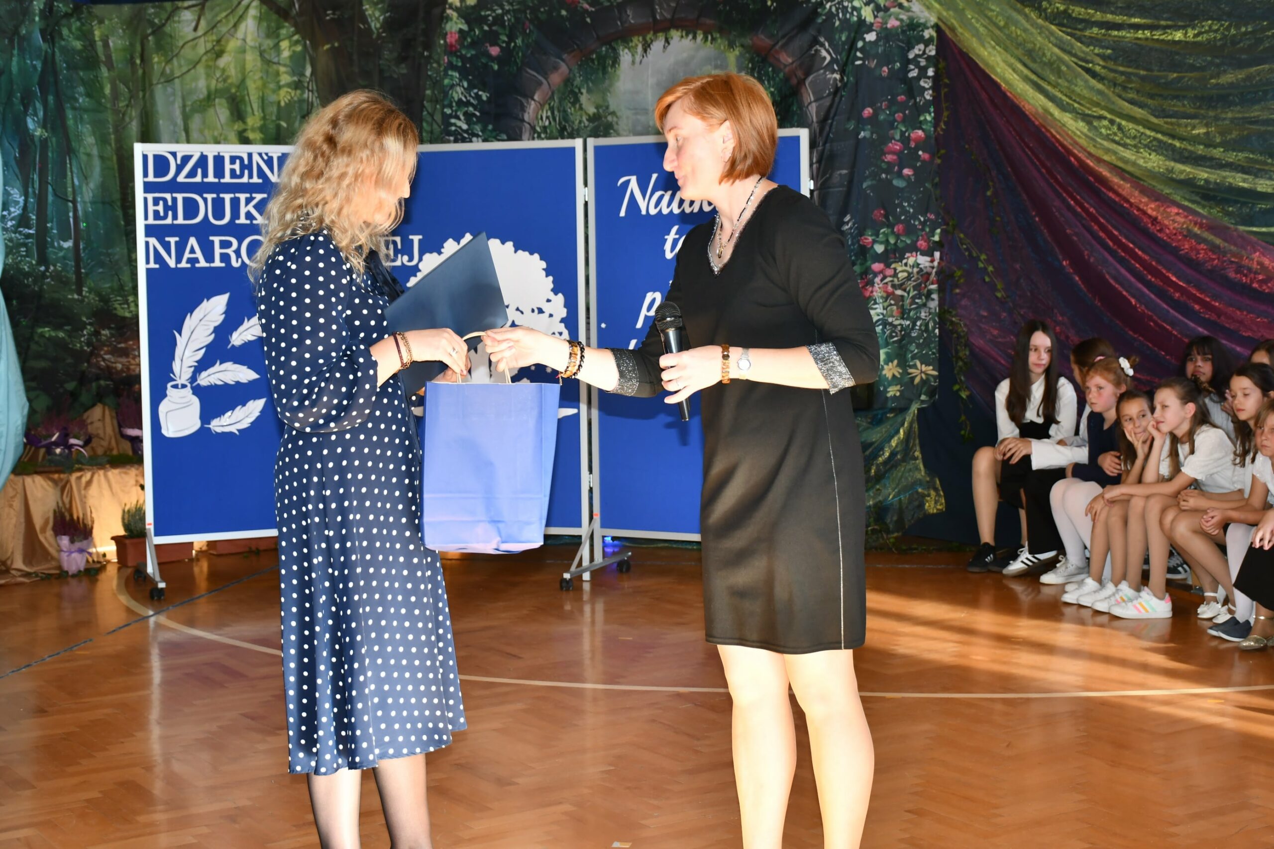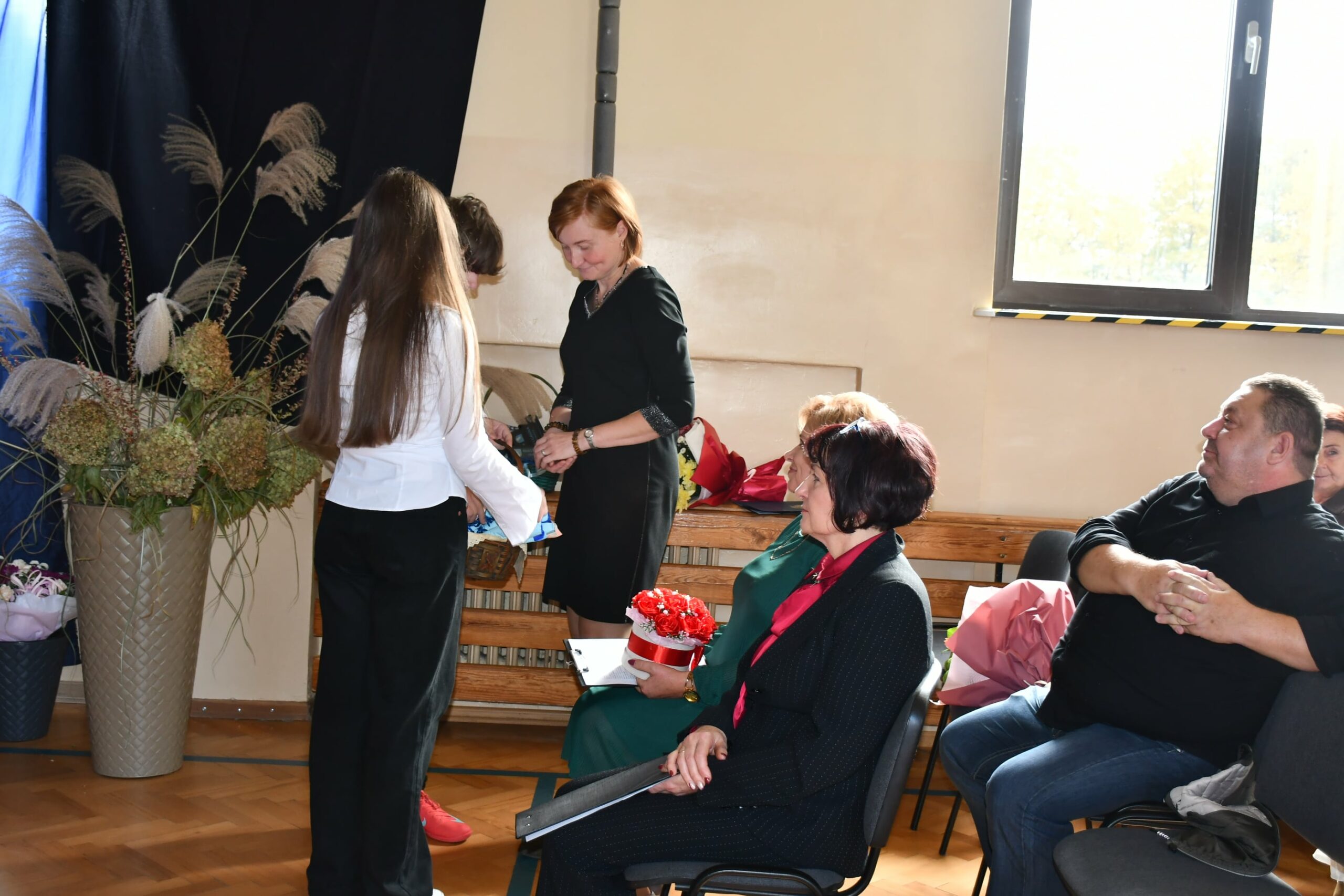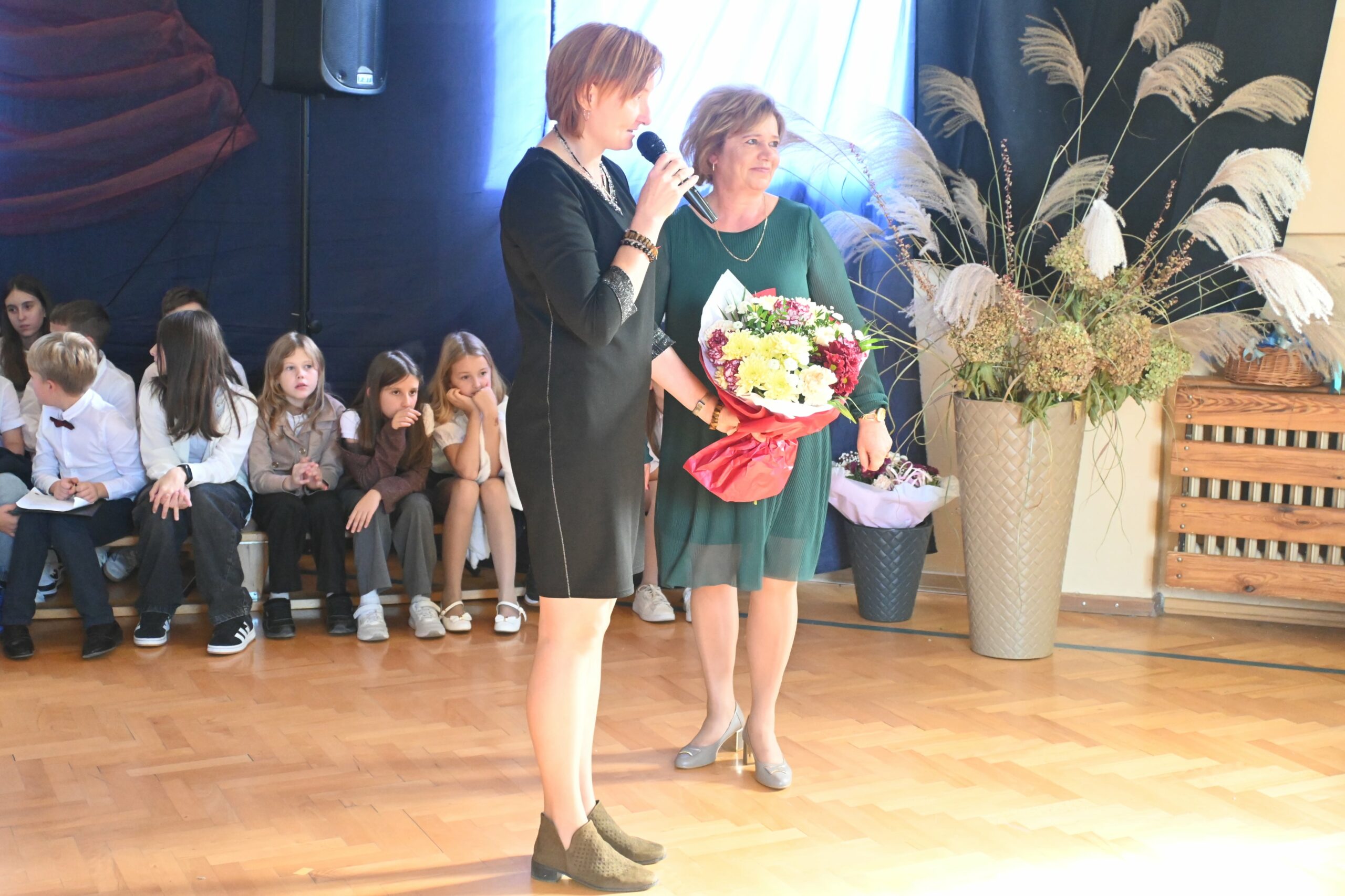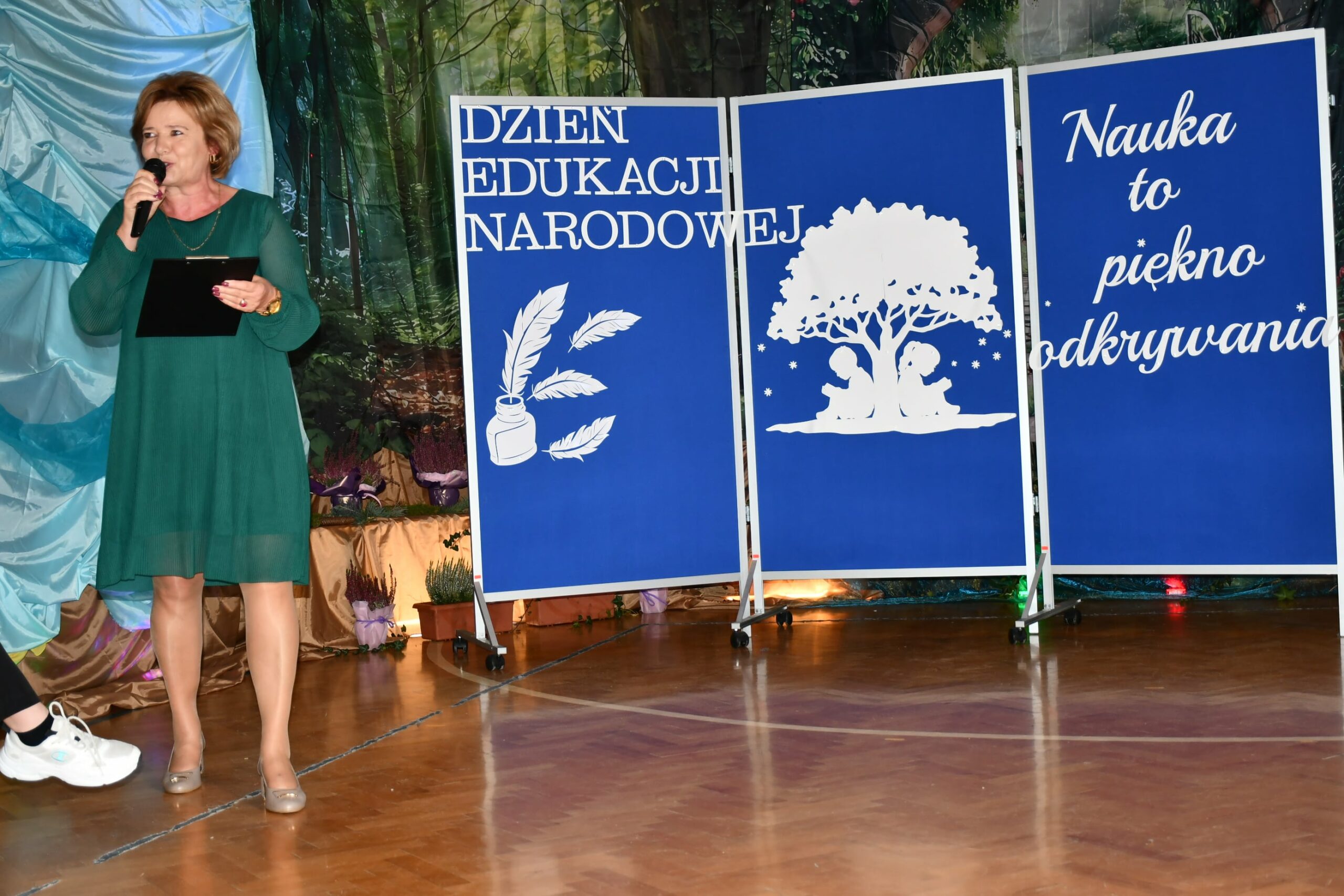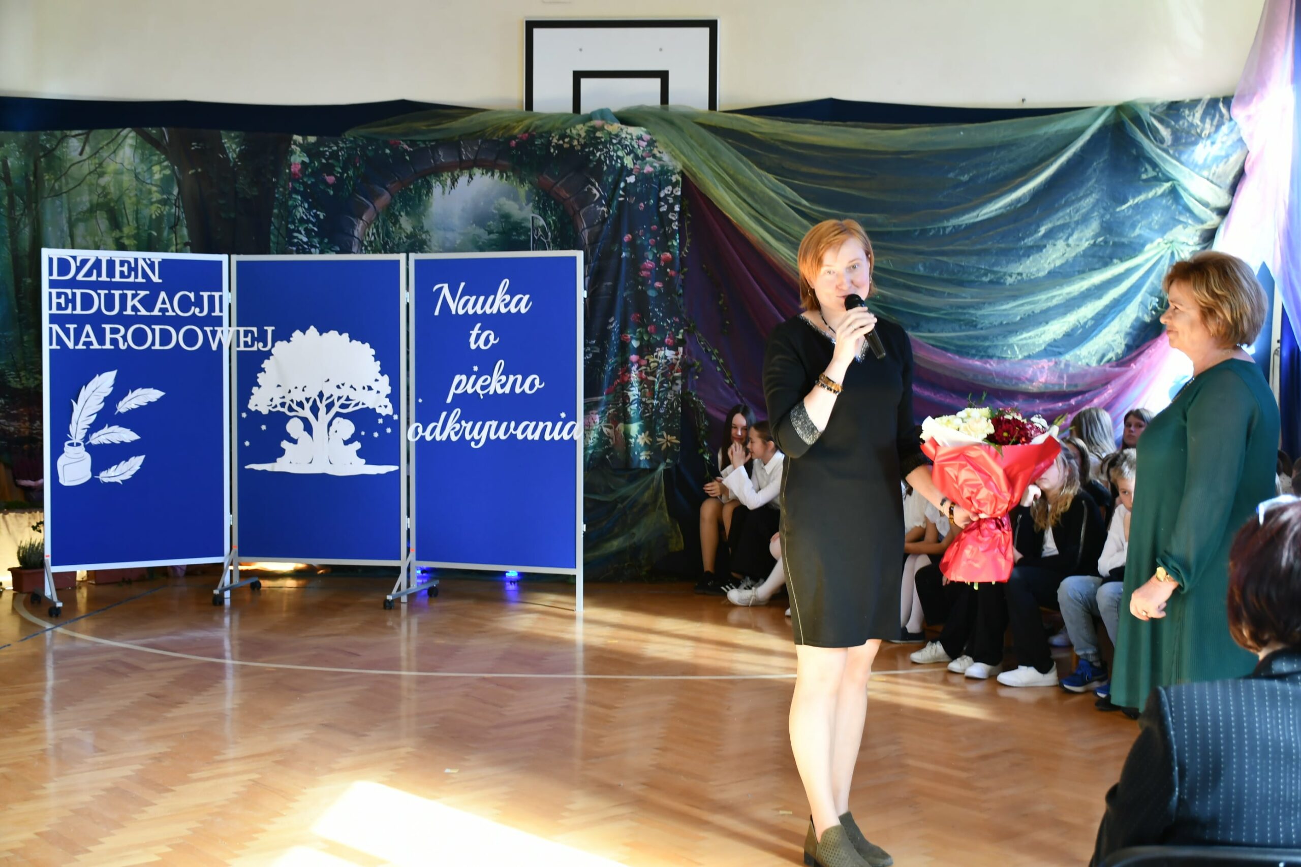 16 października w naszej szkole obchodziliśmy Dzień Edukacji Narodowej – wyjątkowe święto, w którym szczególnie wybrzmiewają słowa wdzięczności i uznania wobec wszystkich, którzy tworzą szkolną wspólnotę. Tego dnia w murach szkoły spotkali się nauczyciele, pracownicy, uczniowie oraz zaproszeni goście, by wspólnie świętować i wyrazić wdzięczność za trud, serce i zaangażowanie w codzienną pracę. Z tej okazji Samorząd Uczniowski przygotował wyjątkowy program artystyczny pt. Zaczarowany pamiętnik. Nasi utalentowani aktorzy z klas 5 i 8 zabrali wszystkich w niezwykłą podróż w czasie – aż do roku 3395. Tam spotkali nauczyciela z przyszłości, który przypomniał im, jak wielką rolę odgrywa pedagog w życiu młodego człowieka – w jego wychowaniu, rozwoju i poszukiwaniu własnej drogi. Poruszeni jego historią, uczniowie powrócili do teraźniejszości, by w imieniu wszystkich uczniów wyrazić wdzięczność tym, którzy każdego dnia z sercem i oddaniem kształtują ich świat. Tego dnia słowo dziękuję nabrało szczególnej mocy i wybrzmiało z głębi serc całej społeczności szkolnej. Wyrazy najwyższego uznania skierowano do nauczycieli – za mądrość, cierpliwość i poświęcenie, z jakim każdego dnia prowadzą uczniów ścieżką wiedzy. Za umiejętność dostrzegania w każdym dziecku jego wyjątkowości, za słowa otuchy, które dodają sił, oraz lekcje, które pozostają w pamięci na całe życie. Szczere podziękowania popłynęły także w stronę dyrekcji szkoły – za roztropne przewodnictwo, serdeczność i zrozumienie, a także za tworzenie atmosfery wzajemnego szacunku, życzliwości i bezpieczeństwa. Nie zapomniano również o pracownikach szkoły, których codzienna, często niedostrzegana praca sprawia, że szkoła jest miejscem pełnym ładu, ciepła i dobra. Całości uroczystości dopełniły pięknie zaśpiewane przez szkolny chór piosenki, które poruszyły serca wszystkich obecnych. Każda nuta niosła ze sobą emocje – od wzruszenia po radość i dumę z przynależności do naszej szkolnej wspólnoty. A gdy zabrzmiało gromkie Sto lat!, jego echo rozbrzmiało w całym budynku, niosąc się aż po ostatnie szkolne korytarze. Nie sposób nie wspomnieć o zachwycającej dekoracji, która idealnie współgrała z tym, co działo się na scenie. Scenografia przeniosła wszystkich w magiczny świat, a las, latarnia morska i kawałek błękitnego morza symbolicznie wskazywały drogę światła, mądrości i wiedzy, jaką nauczyciele roztaczają przed swoimi uczniami. To był dzień pełen wzruszeń, wdzięczności i pięknych emocji – dzień, który na długo pozostanie w pamięci całej szkolnej społeczności. Uroczystość zakończyły gromkie brawa, wspólne zdjęcie oraz rozmowy pełne ciepłych słów i uśmiechu. Wyrazy wdzięczności oraz życzenia skierowali do zebranych nasi zacni goście: Pani dr Małgorzata Szymańska – Burmistrz Miasta i Gminy Solec nad Wisłą, Pani Jadwiga Kandyba – Przewodnicząca Rady Miejskiej oraz Pan Zbigniewa Lasota – Przewodniczący Rady Rodziców, którzy swoją obecnością uświetnili uroczystość. Ich obecność, wsparcie i życzliwość stanowią dowód prawdziwej troski o rozwój i sukcesy szkoły.