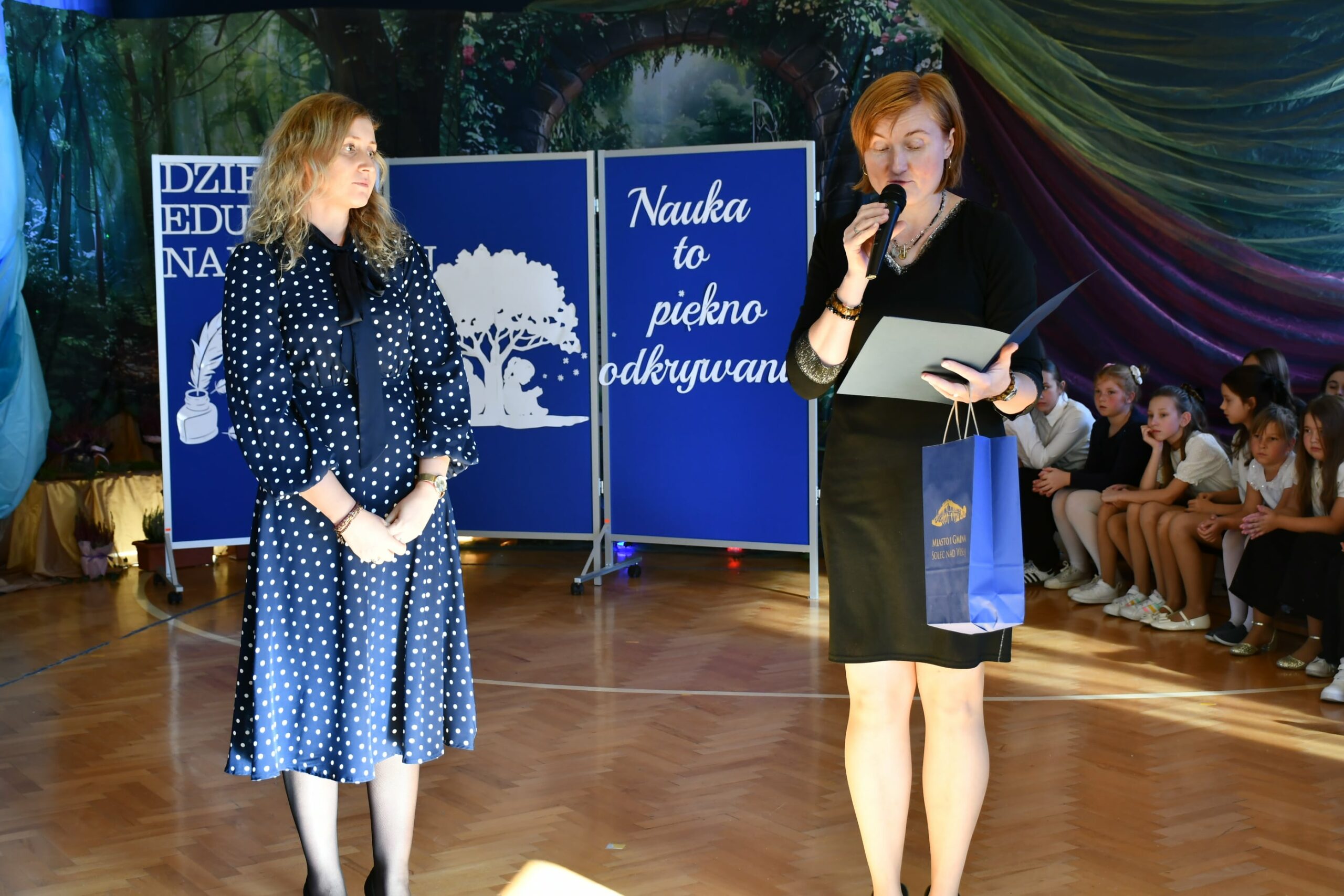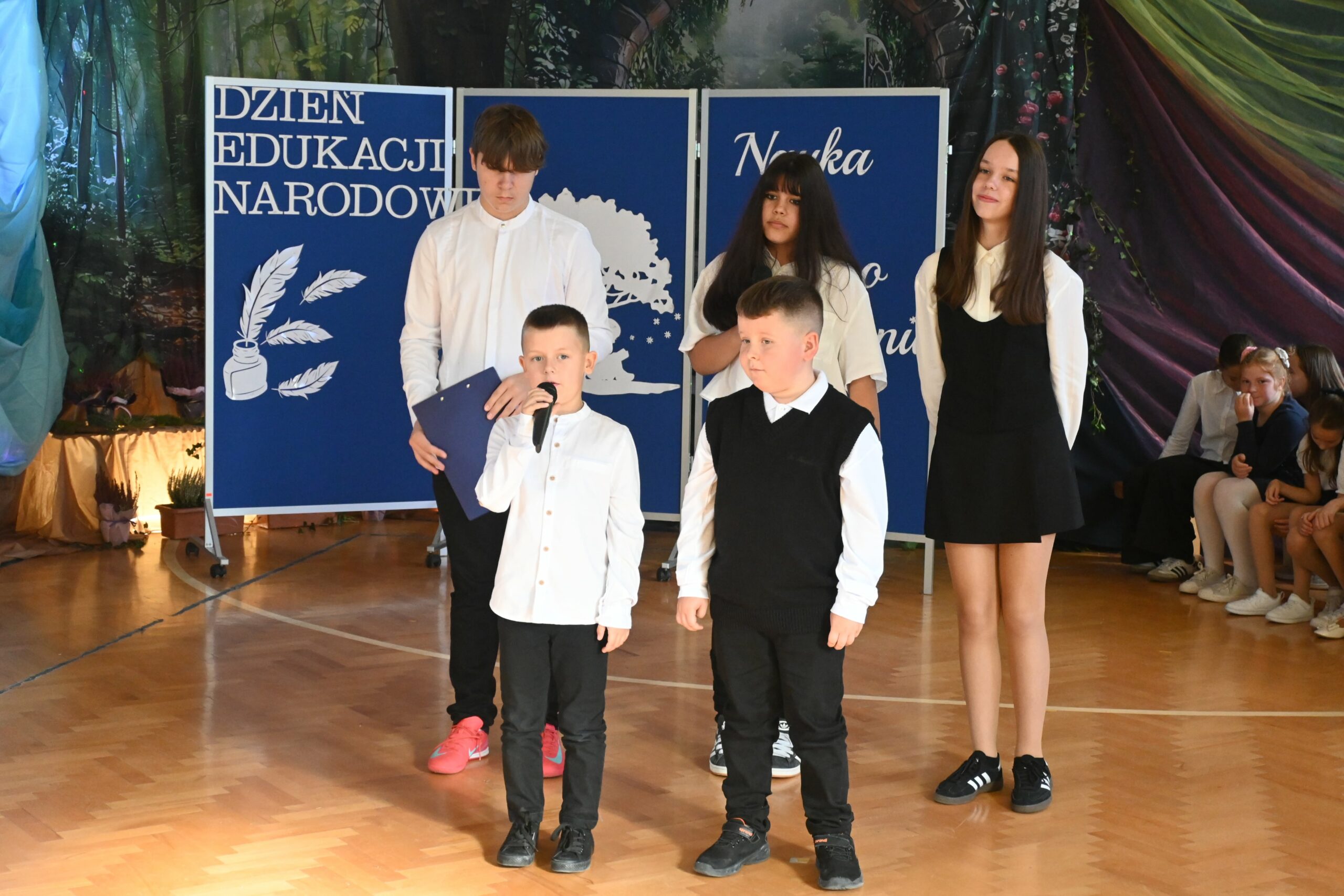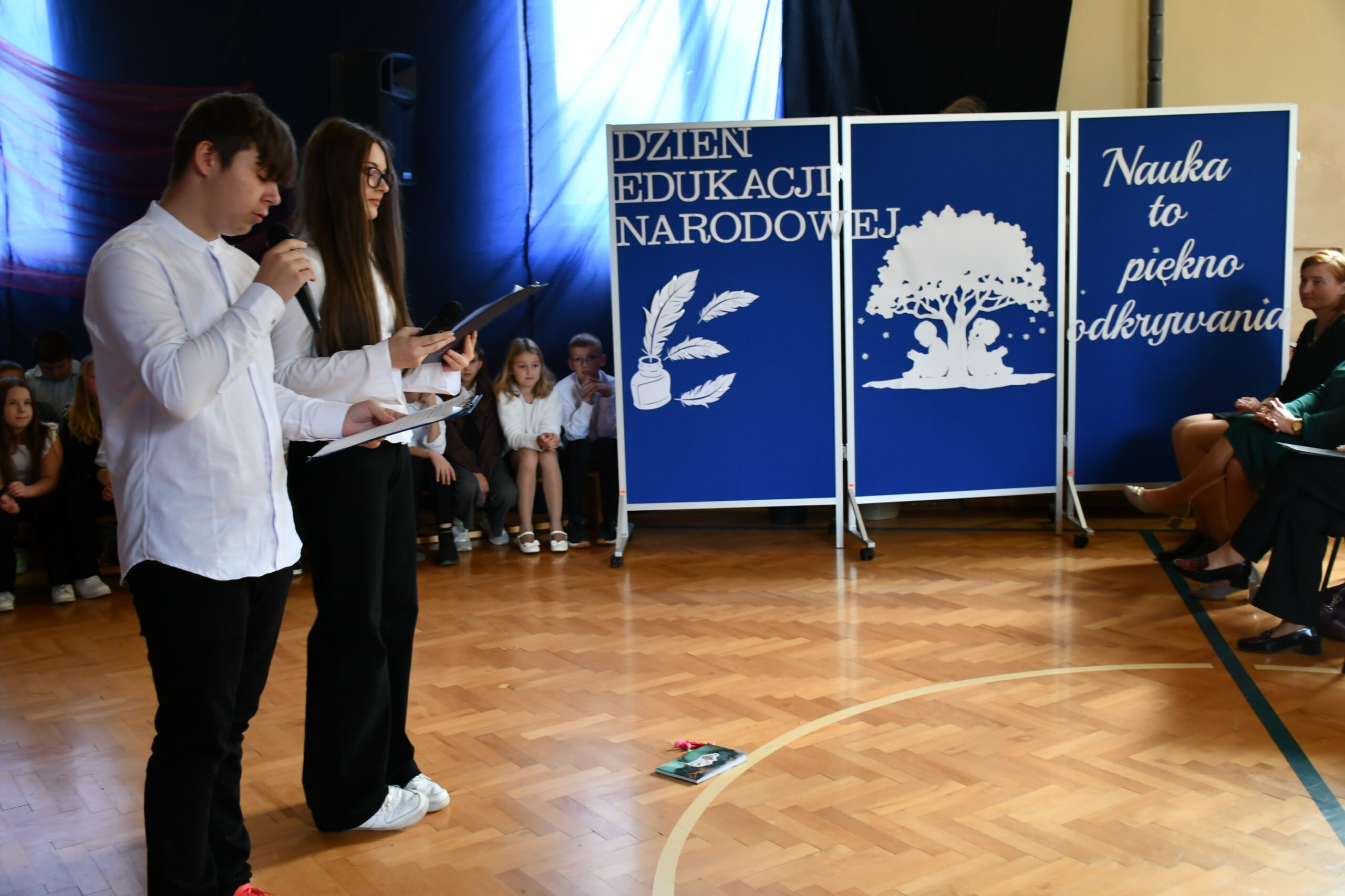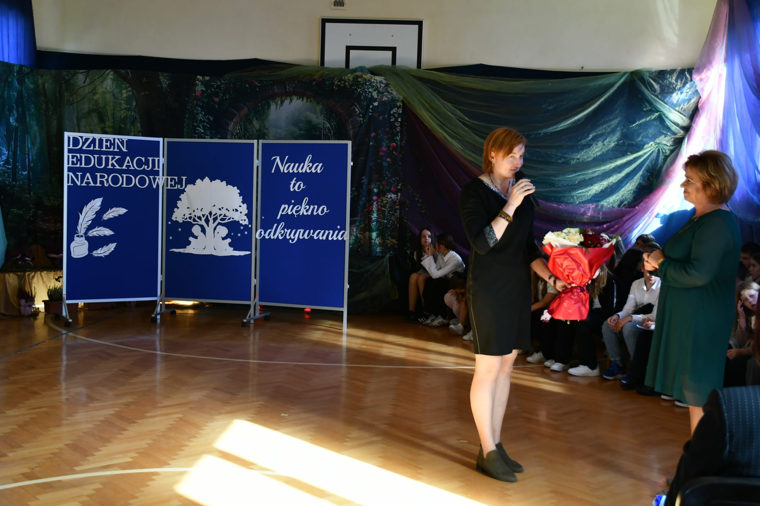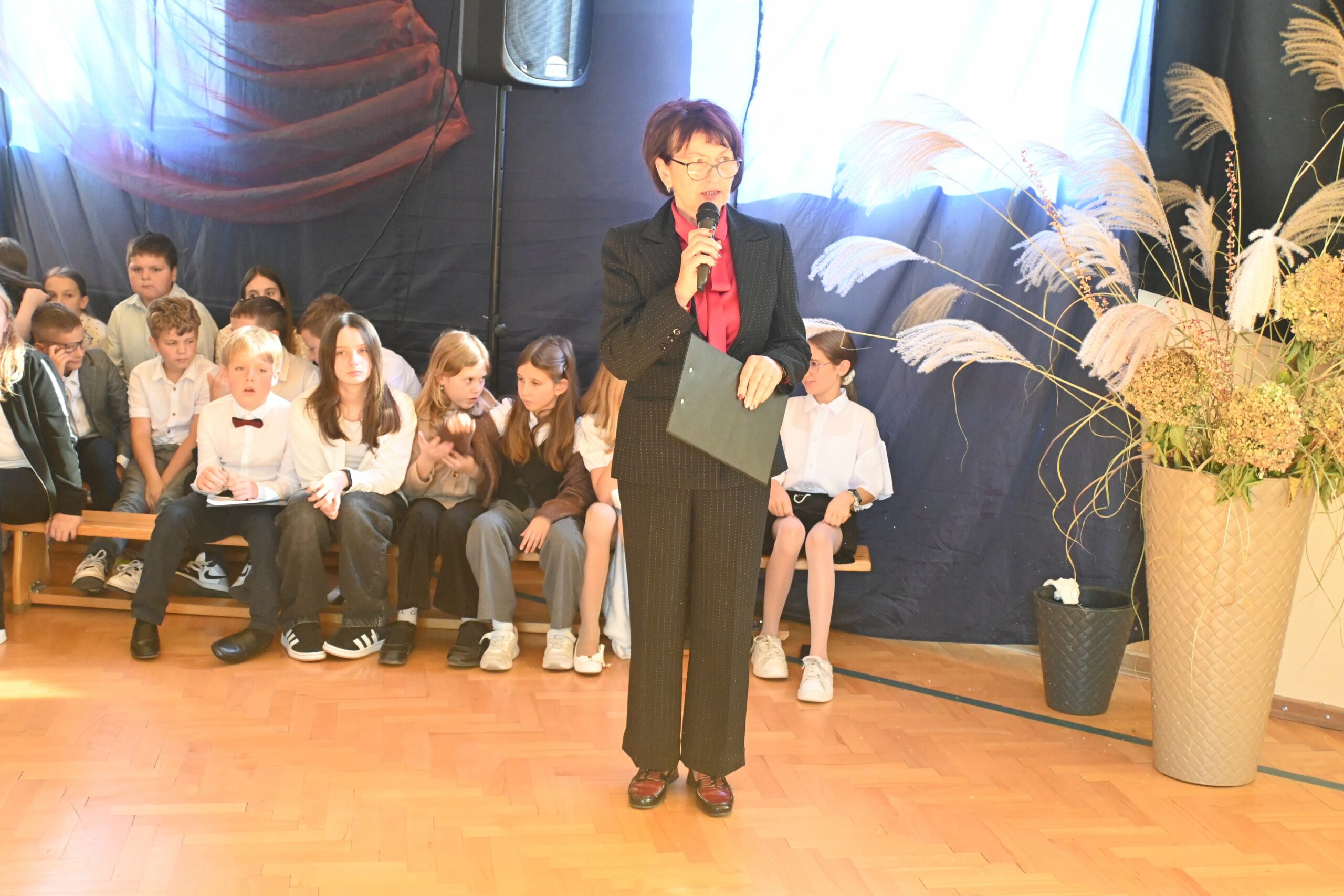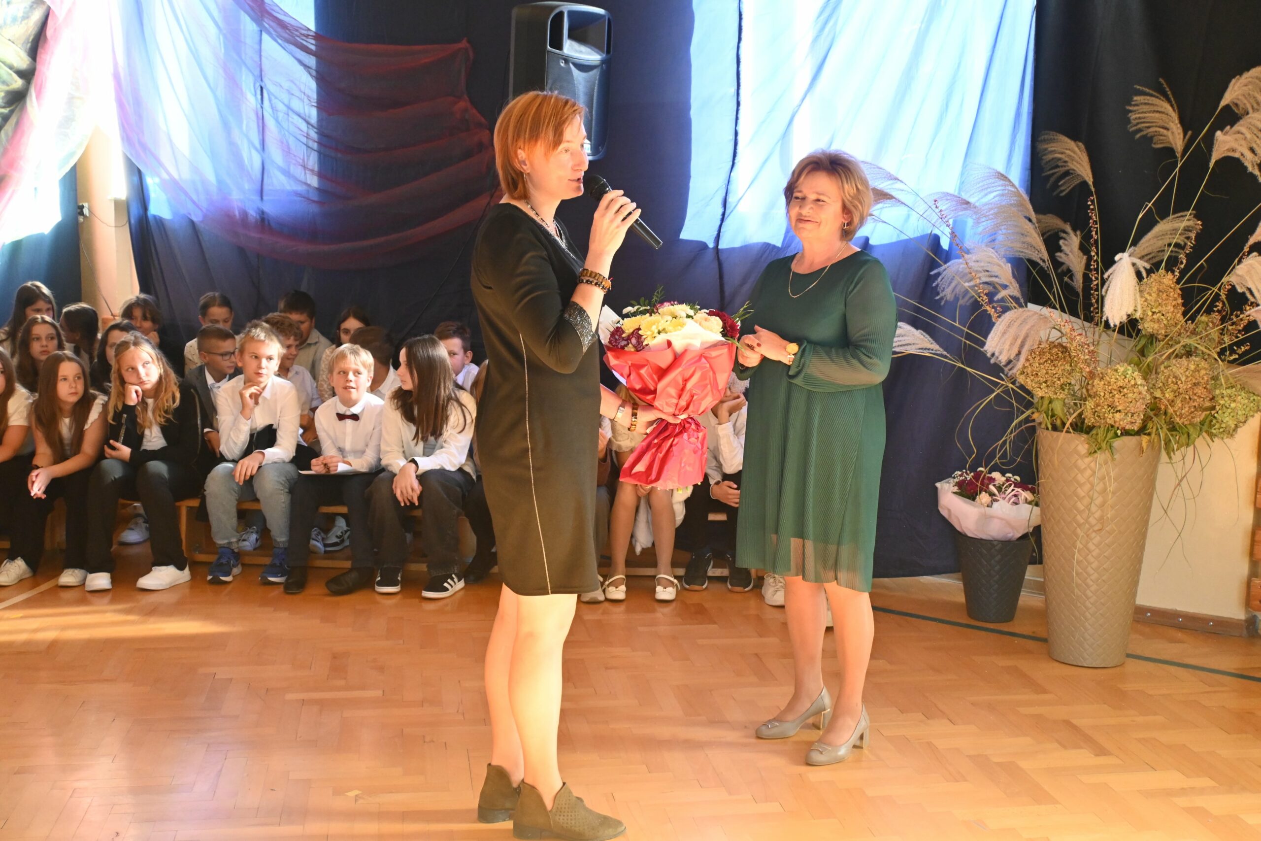 16 października w naszej szkole obchodziliśmy Dzień Edukacji Narodowej – wyjątkowe święto, w którym szczególnie wybrzmiewają słowa wdzięczności i uznania wobec wszystkich, którzy tworzą szkolną wspólnotę. Tego dnia w murach szkoły spotkali się nauczyciele, pracownicy, uczniowie oraz zaproszeni goście, by wspólnie świętować i wyrazić wdzięczność za trud, serce i zaangażowanie w codzienną pracę. Z tej okazji Samorząd Uczniowski przygotował wyjątkowy program artystyczny pt. Zaczarowany pamiętnik. Nasi utalentowani aktorzy z klas 5 i 8 zabrali wszystkich w niezwykłą podróż w czasie – aż do roku 3395. Tam spotkali nauczyciela z przyszłości, który przypomniał im, jak wielką rolę odgrywa pedagog w życiu młodego człowieka – w jego wychowaniu, rozwoju i poszukiwaniu własnej drogi. Poruszeni jego historią, uczniowie powrócili do teraźniejszości, by w imieniu wszystkich uczniów wyrazić wdzięczność tym, którzy każdego dnia z sercem i oddaniem kształtują ich świat. Tego dnia słowo dziękuję nabrało szczególnej mocy i wybrzmiało z głębi serc całej społeczności szkolnej. Wyrazy najwyższego uznania skierowano do nauczycieli – za mądrość, cierpliwość i poświęcenie, z jakim każdego dnia prowadzą uczniów ścieżką wiedzy. Za umiejętność dostrzegania w każdym dziecku jego wyjątkowości, za słowa otuchy, które dodają sił, oraz lekcje, które pozostają w pamięci na całe życie. Szczere podziękowania popłynęły także w stronę dyrekcji szkoły – za roztropne przewodnictwo, serdeczność i zrozumienie, a także za tworzenie atmosfery wzajemnego szacunku, życzliwości i bezpieczeństwa. Nie zapomniano również o pracownikach szkoły, których codzienna, często niedostrzegana praca sprawia, że szkoła jest miejscem pełnym ładu, ciepła i dobra. Całości uroczystości dopełniły pięknie zaśpiewane przez szkolny chór piosenki, które poruszyły serca wszystkich obecnych. Każda nuta niosła ze sobą emocje – od wzruszenia po radość i dumę z przynależności do naszej szkolnej wspólnoty. A gdy zabrzmiało gromkie Sto lat!, jego echo rozbrzmiało w całym budynku, niosąc się aż po ostatnie szkolne korytarze. Nie sposób nie wspomnieć o zachwycającej dekoracji, która idealnie współgrała z tym, co działo się na scenie. Scenografia przeniosła wszystkich w magiczny świat, a las, latarnia morska i kawałek błękitnego morza symbolicznie wskazywały drogę światła, mądrości i wiedzy, jaką nauczyciele roztaczają przed swoimi uczniami. To był dzień pełen wzruszeń, wdzięczności i pięknych emocji – dzień, który na długo pozostanie w pamięci całej szkolnej społeczności. Uroczystość zakończyły gromkie brawa, wspólne zdjęcie oraz rozmowy pełne ciepłych słów i uśmiechu. Wyrazy wdzięczności oraz życzenia skierowali do zebranych nasi zacni goście: Pani dr Małgorzata Szymańska – Burmistrz Miasta i Gminy Solec nad Wisłą, Pani Jadwiga Kandyba – Przewodnicząca Rady Miejskiej oraz Pan Zbigniewa Lasota – Przewodniczący Rady Rodziców, którzy swoją obecnością uświetnili uroczystość. Ich obecność, wsparcie i życzliwość stanowią dowód prawdziwej troski o rozwój i sukcesy szkoły.