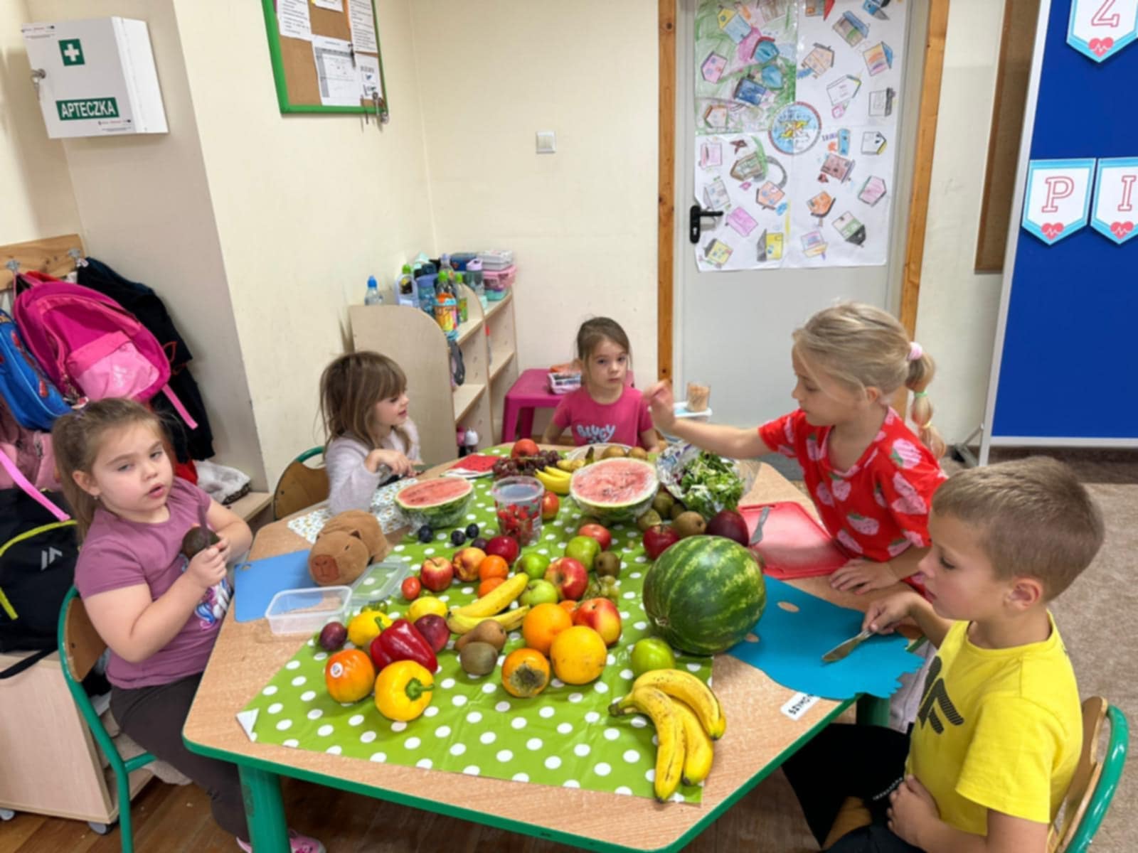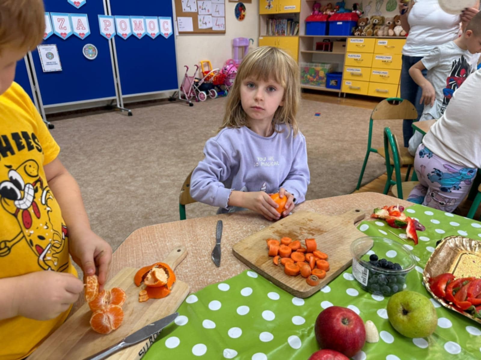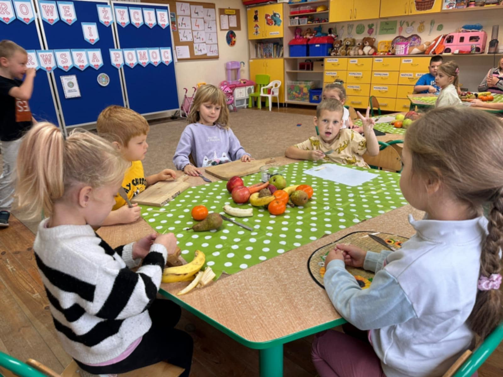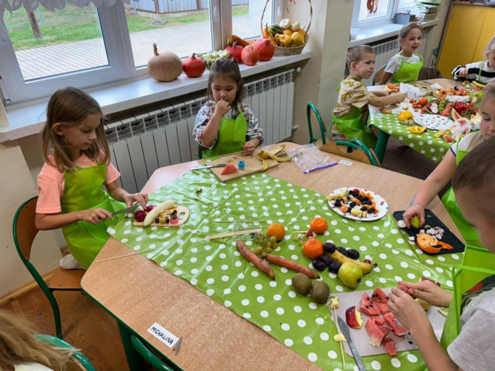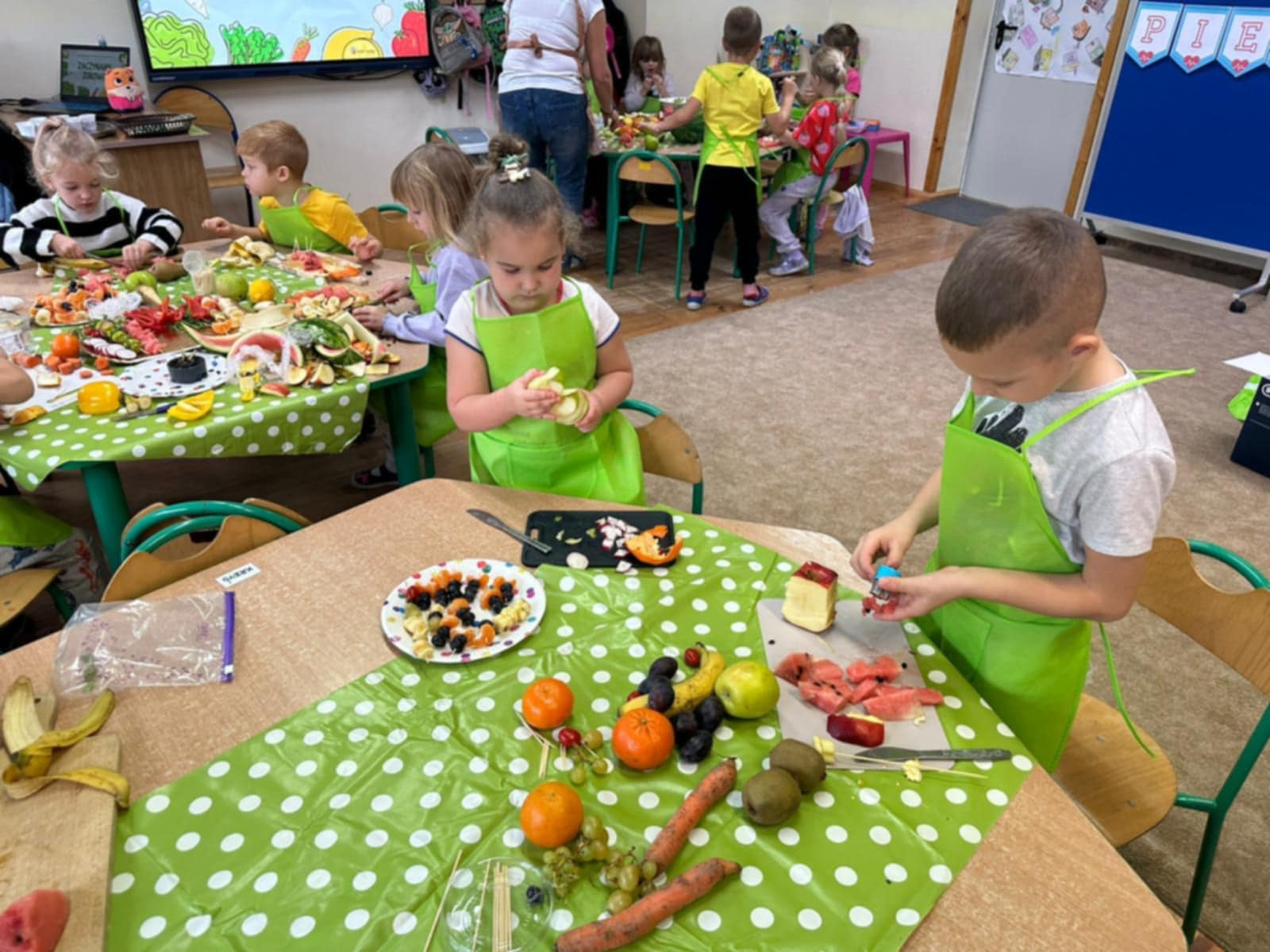 W ramach ogólnopolskiego projektu edukacyjnego „Zdrowe życie i pierwsza pomoc” w grupie przedszkolnej „Jeżyki” odbyły się zajęcia – „Zaczynamy zdrowo”. Spotkanie poświęcone było tematyce zdrowego odżywiania oraz kształtowaniu prawidłowych nawyków żywieniowych już od najmłodszych lat. Celem zajęć było zapoznanie dzieci z zasadami zdrowego stylu życia, a także rozwijanie umiejętności przygotowywania prostych, zdrowych przekąsek. Dzieci poznały piramidę żywieniową, dowiedziały się, które produkty należy jeść najczęściej, a które rzadziej. Podczas prezentacji multimedialnej przedszkolaki uczyły się rozróżniać grupy produktów spożywczych, takie jak owoce, warzywa, produkty zbożowe, nabiał i białka. Następnie przystąpiły do przygotowywania zdrowych przekąsek. Z dużym zaangażowaniem kroiły owoce, układały kolorowe sałatki i dekorowały talerze. W trakcie zajęć przypomniano zasady bezpiecznego posługiwania się nożem i narzędziami kuchennymi. Po zakończeniu pracy zaprezentowano potrawy, opowiadając o użytych składnikach i ich wartościach odżywczych. Najciekawsza była degustacja, podczas której dzieci z radością próbowały przygotowanych przekąsek. Zajęcia w grupie „Jeżyki” przebiegły w radosnej i twórczej atmosferze. Dzieci z entuzjazmem uczestniczyły w każdym etapie, wykazały się dużą wiedzą, pomysłowością i chęcią współpracy.
