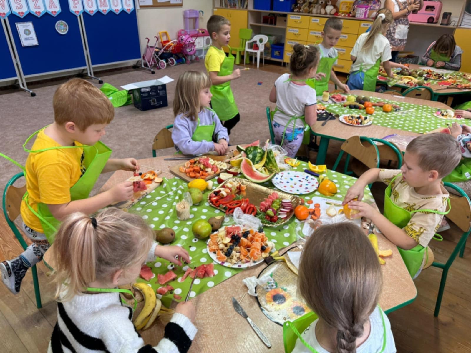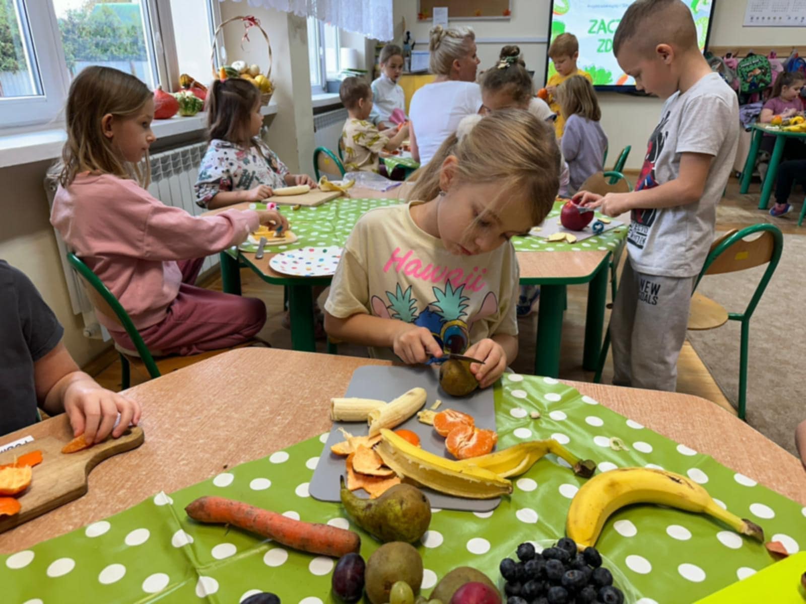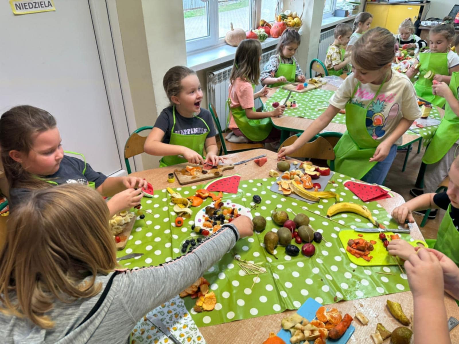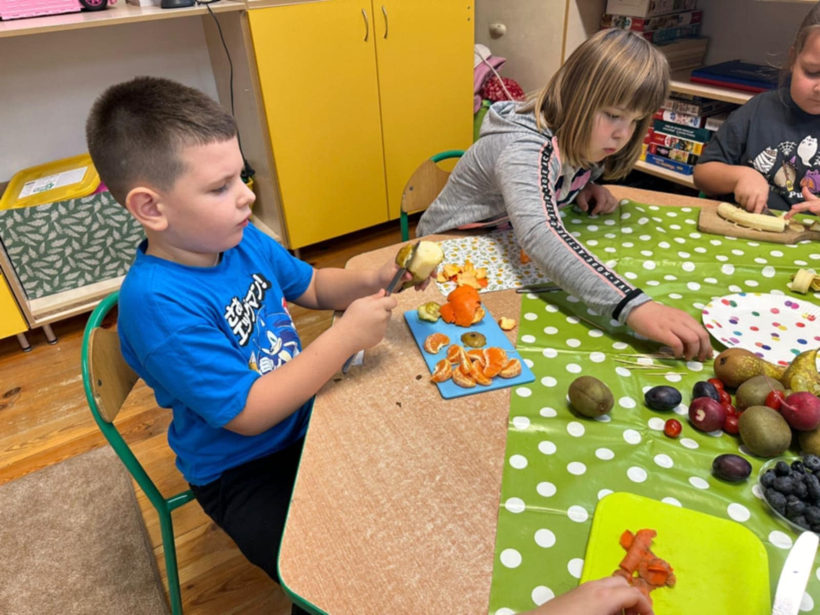 W ramach ogólnopolskiego projektu edukacyjnego „Zdrowe życie i pierwsza pomoc” w grupie przedszkolnej „Jeżyki” odbyły się zajęcia – „Zaczynamy zdrowo”. Spotkanie poświęcone było tematyce zdrowego odżywiania oraz kształtowaniu prawidłowych nawyków żywieniowych już od najmłodszych lat. Celem zajęć było zapoznanie dzieci z zasadami zdrowego stylu życia, a także rozwijanie umiejętności przygotowywania prostych, zdrowych przekąsek. Dzieci poznały piramidę żywieniową, dowiedziały się, które produkty należy jeść najczęściej, a które rzadziej. Podczas prezentacji multimedialnej przedszkolaki uczyły się rozróżniać grupy produktów spożywczych, takie jak owoce, warzywa, produkty zbożowe, nabiał i białka. Następnie przystąpiły do przygotowywania zdrowych przekąsek. Z dużym zaangażowaniem kroiły owoce, układały kolorowe sałatki i dekorowały talerze. W trakcie zajęć przypomniano zasady bezpiecznego posługiwania się nożem i narzędziami kuchennymi. Po zakończeniu pracy zaprezentowano potrawy, opowiadając o użytych składnikach i ich wartościach odżywczych. Najciekawsza była degustacja, podczas której dzieci z radością próbowały przygotowanych przekąsek. Zajęcia w grupie „Jeżyki” przebiegły w radosnej i twórczej atmosferze. Dzieci z entuzjazmem uczestniczyły w każdym etapie, wykazały się dużą wiedzą, pomysłowością i chęcią współpracy.
