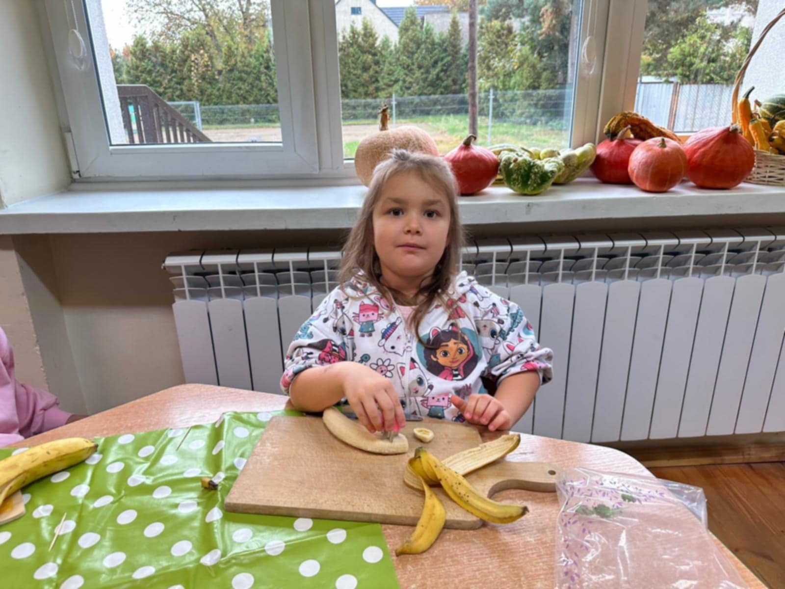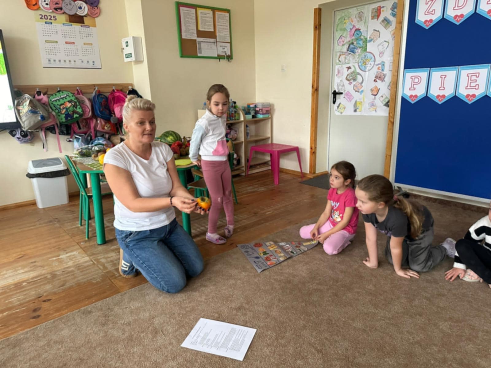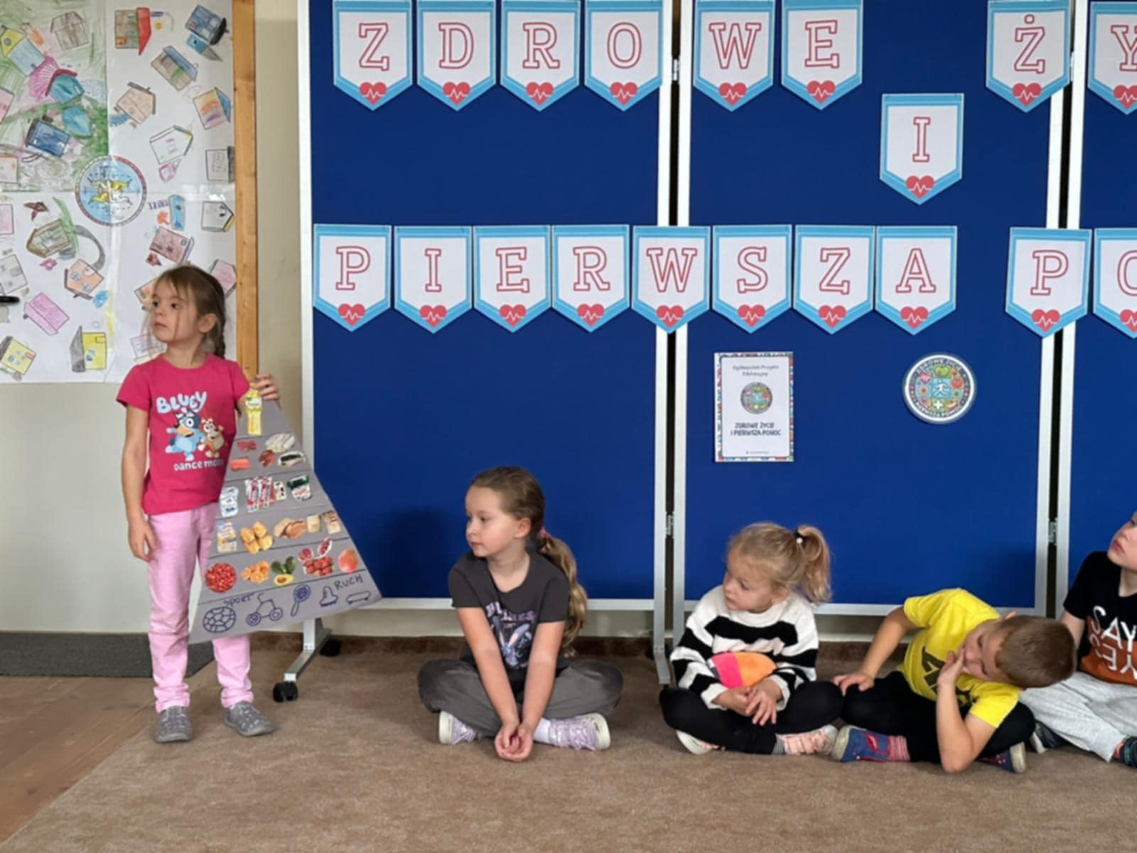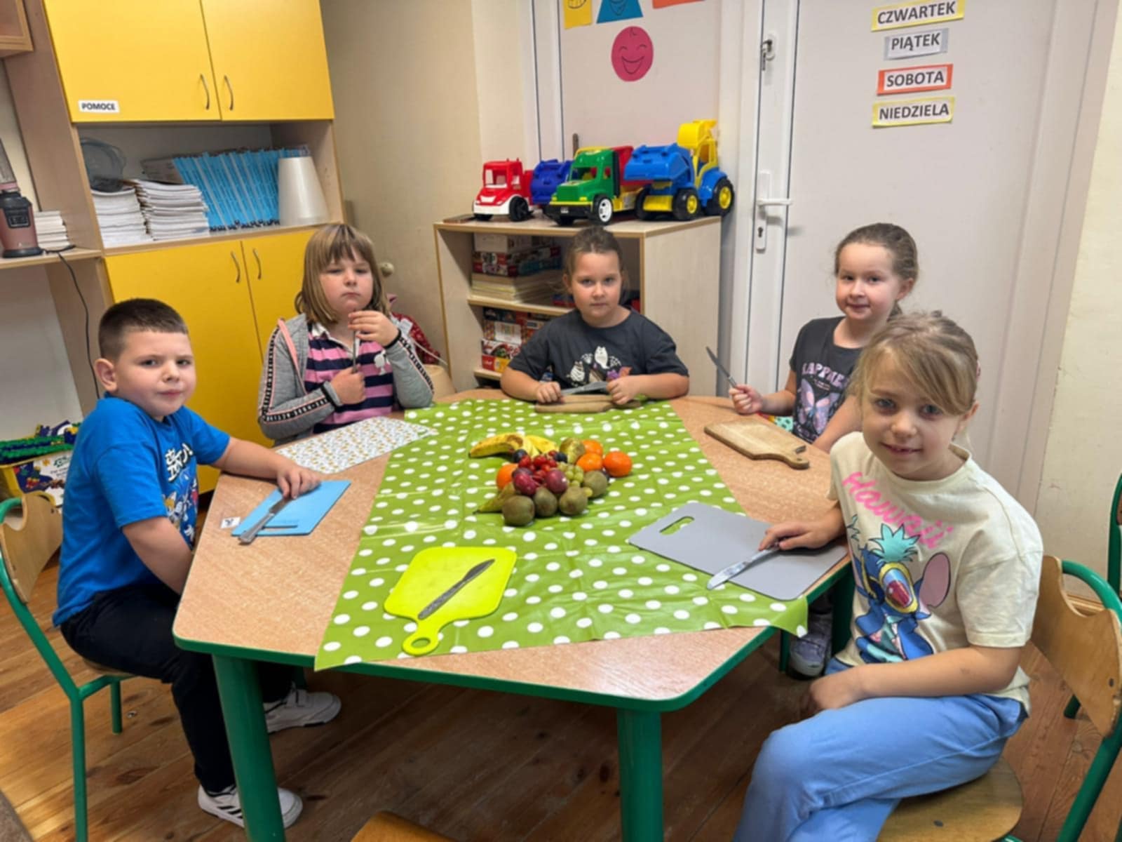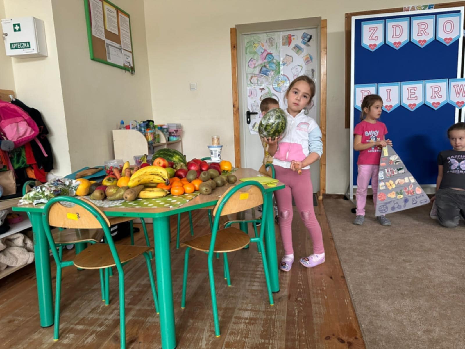 W ramach ogólnopolskiego projektu edukacyjnego „Zdrowe życie i pierwsza pomoc” w grupie przedszkolnej „Jeżyki” odbyły się zajęcia – „Zaczynamy zdrowo”. Spotkanie poświęcone było tematyce zdrowego odżywiania oraz kształtowaniu prawidłowych nawyków żywieniowych już od najmłodszych lat. Celem zajęć było zapoznanie dzieci z zasadami zdrowego stylu życia, a także rozwijanie umiejętności przygotowywania prostych, zdrowych przekąsek. Dzieci poznały piramidę żywieniową, dowiedziały się, które produkty należy jeść najczęściej, a które rzadziej. Podczas prezentacji multimedialnej przedszkolaki uczyły się rozróżniać grupy produktów spożywczych, takie jak owoce, warzywa, produkty zbożowe, nabiał i białka. Następnie przystąpiły do przygotowywania zdrowych przekąsek. Z dużym zaangażowaniem kroiły owoce, układały kolorowe sałatki i dekorowały talerze. W trakcie zajęć przypomniano zasady bezpiecznego posługiwania się nożem i narzędziami kuchennymi. Po zakończeniu pracy zaprezentowano potrawy, opowiadając o użytych składnikach i ich wartościach odżywczych. Najciekawsza była degustacja, podczas której dzieci z radością próbowały przygotowanych przekąsek. Zajęcia w grupie „Jeżyki” przebiegły w radosnej i twórczej atmosferze. Dzieci z entuzjazmem uczestniczyły w każdym etapie, wykazały się dużą wiedzą, pomysłowością i chęcią współpracy.
