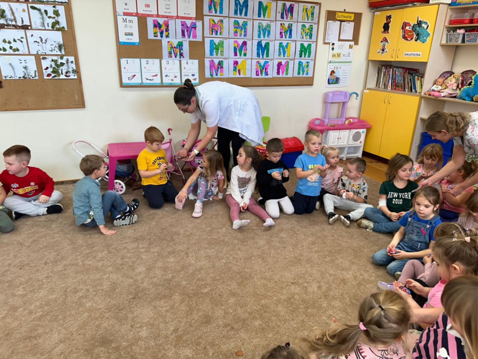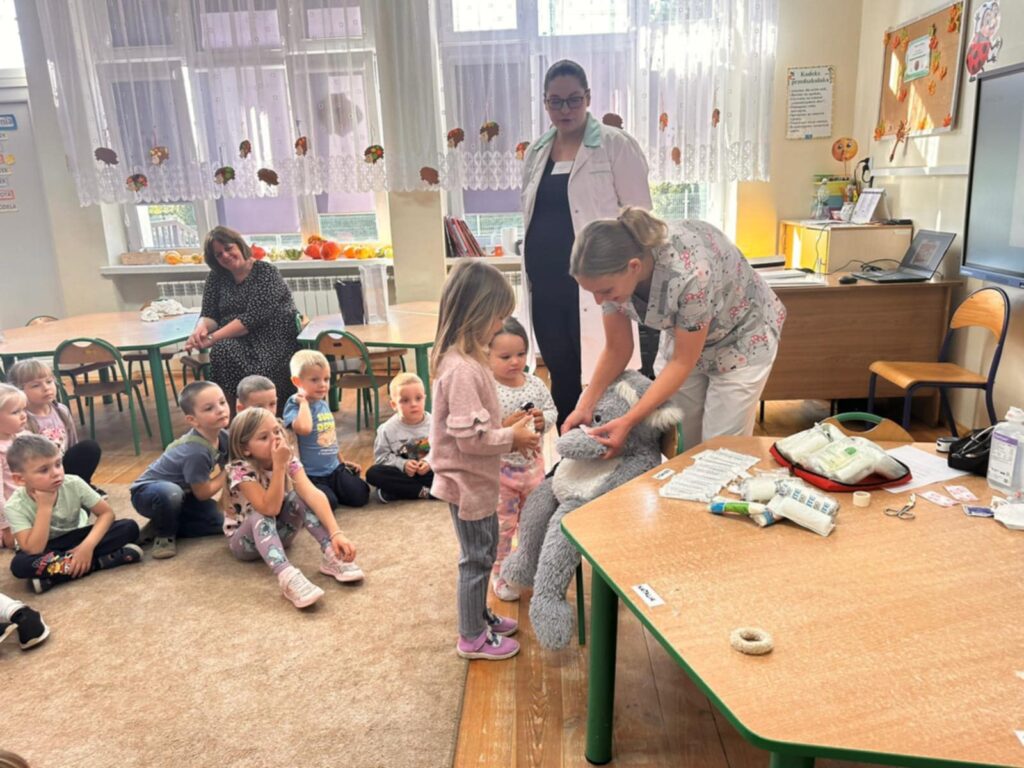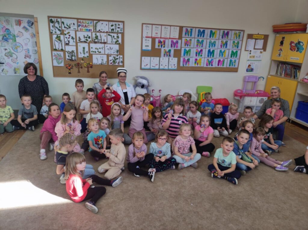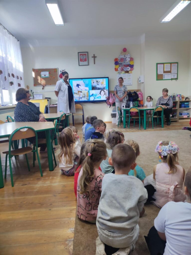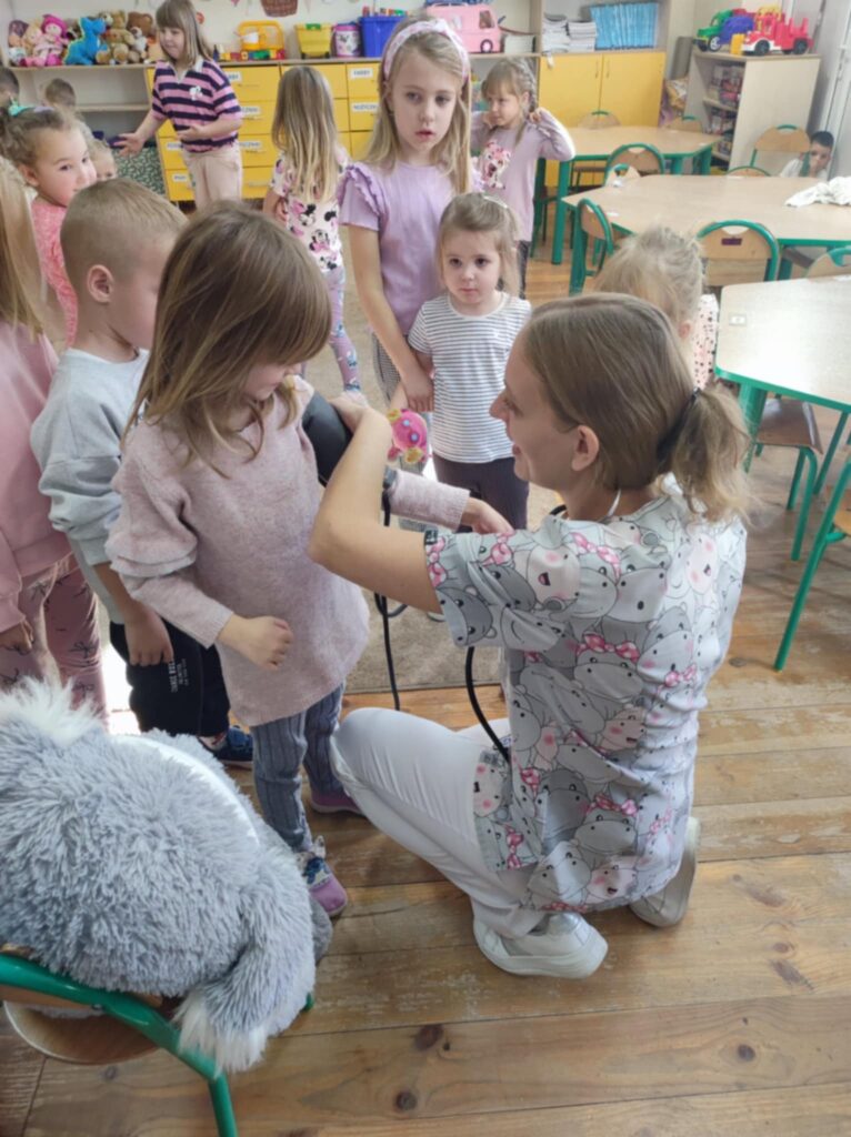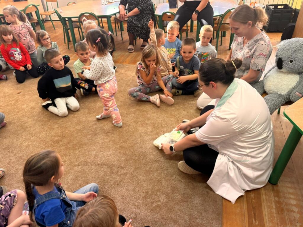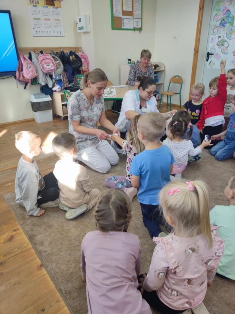 Dnia 23.10.2025 r. odwiedziły nas niezwykli Goście. Były to Panie, które z zawodu są pielęgniarkami i pracują w pobliskim szpitalu. Panie pielęgniarki opowiedziały dzieciom, na czym polega ich praca. Zaprezentowały atrybuty, jakimi posługują się w codziennej pracy. Przekazały też informację – jak dbać o zdrowie i higienę. Przy pomocy doświadczenia zobrazowały jak ważne jest dokładne i częste myciem rąk. Przedszkolaki uczyły się, jak opatrzyć ranę, założyć opaskę uciskową, przykleić plaster, zmierzyć ciśnienie oraz zrobić zastrzyk. Przy pomocy stetoskopu wsłuchiwały się w bicie serca. Utrwalone zostały numery telefonów: straży, policji, pogotowia oraz ogólnego numeru alarmowego – 112. Ogromną frajdę sprawiło im, charakteryzowanie się na pielęgniarza, pielęgniarkę i lekarza. Dzieci mogły zakładać: czepek, maski, rękawiczki. Na pamiątkę dostały odznakę „Dzielonego Pacjenta”. Serdecznie dziękujemy naszym niecodziennym Gościom za praktyczną, a zarazem tak atrakcyjną lekcję, którą dzieci z pewnością zapamiętają na długo.