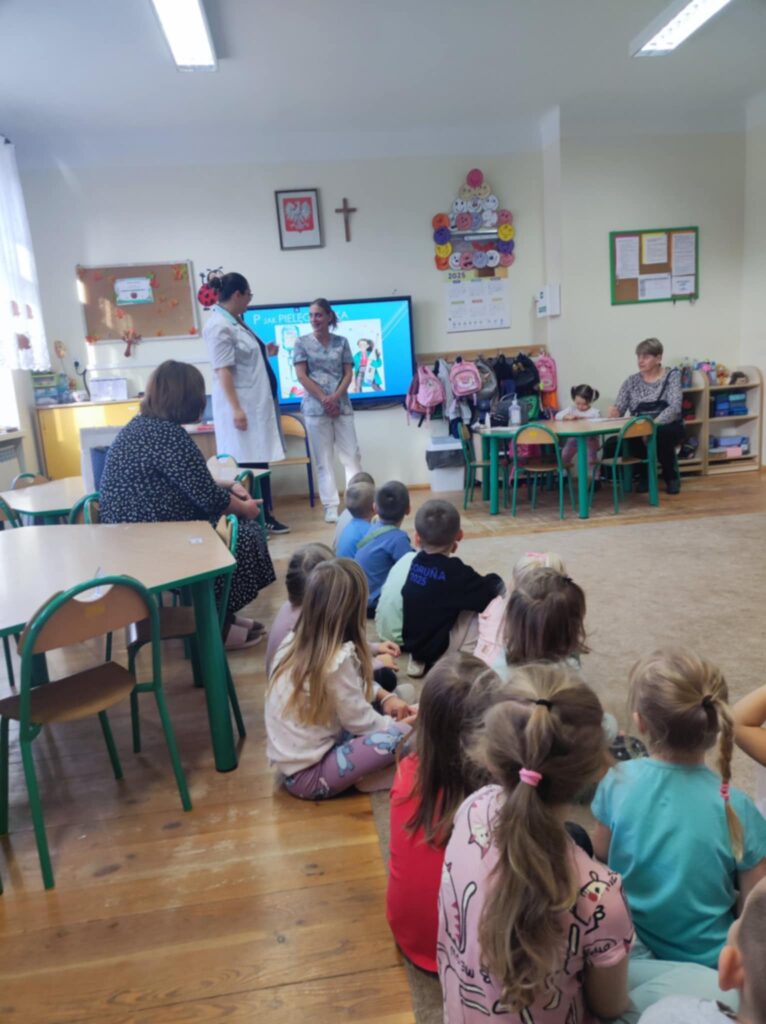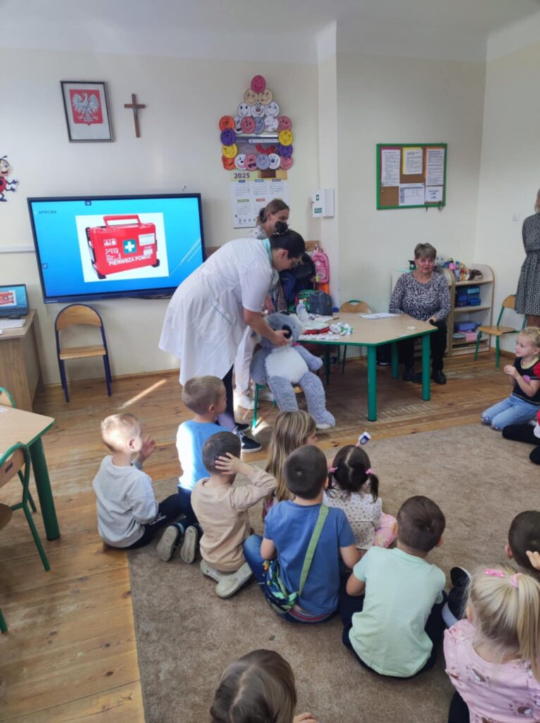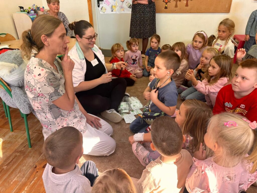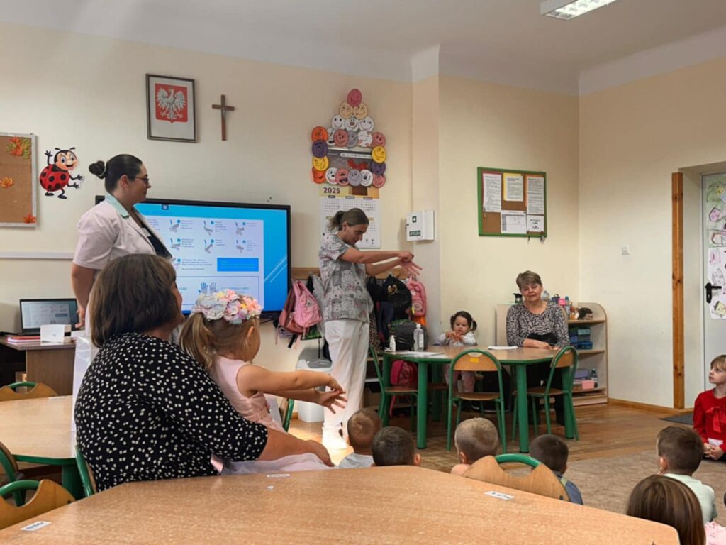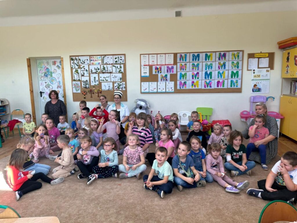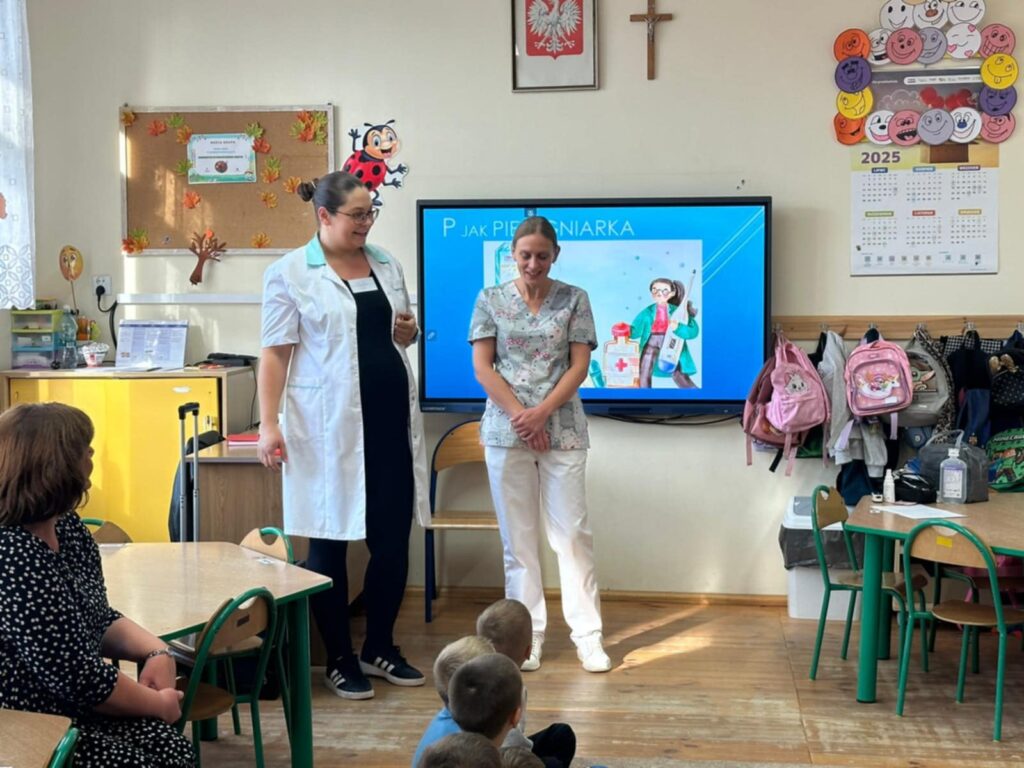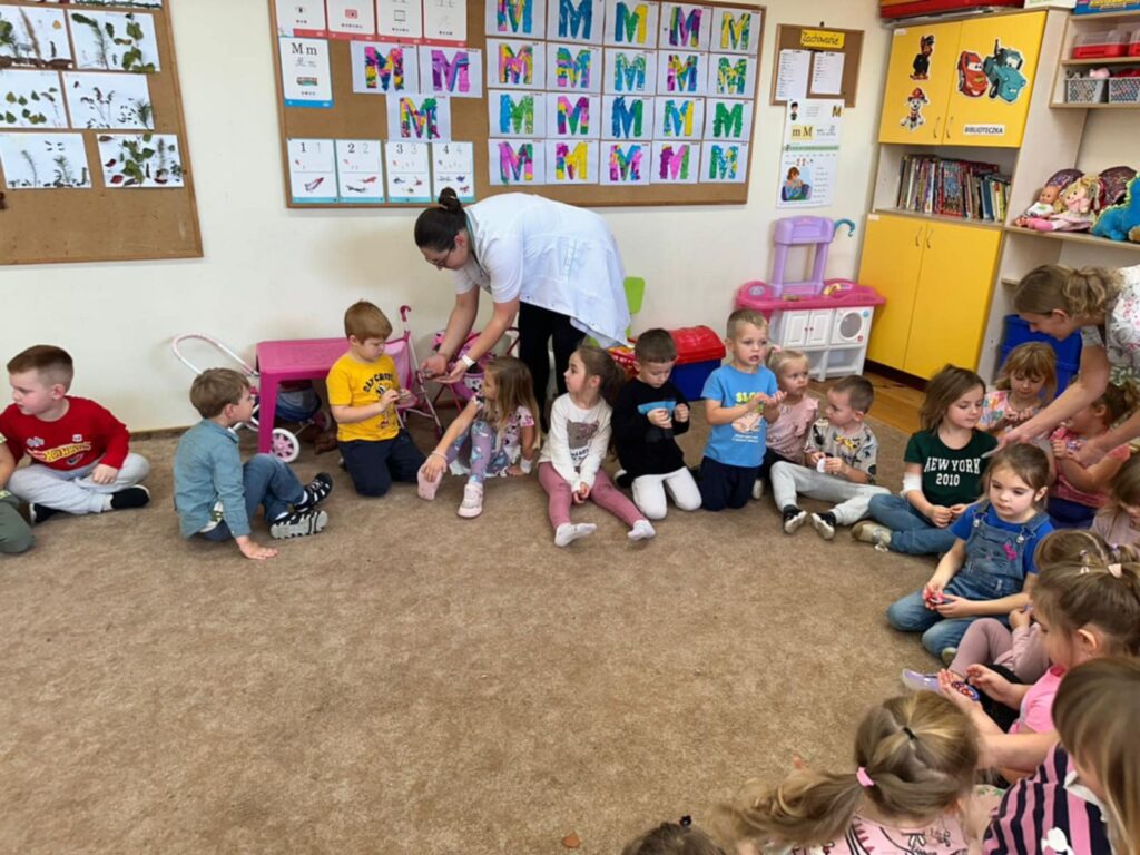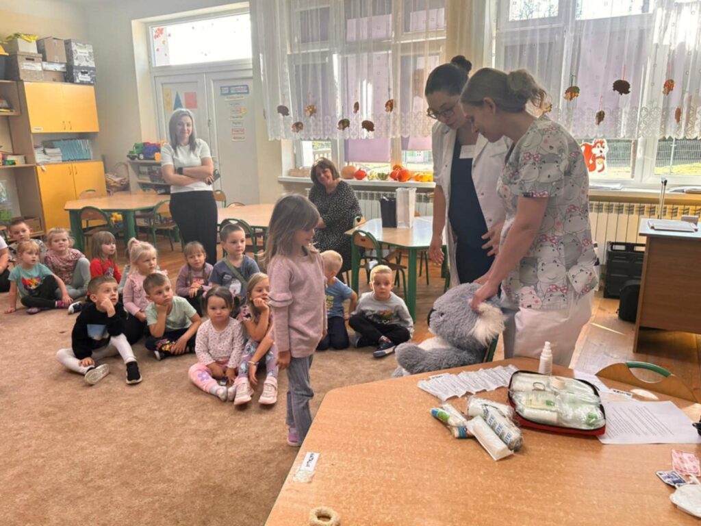 Dnia 23.10.2025 r. odwiedziły nas niezwykli Goście. Były to Panie, które z zawodu są pielęgniarkami i pracują w pobliskim szpitalu. Panie pielęgniarki opowiedziały dzieciom, na czym polega ich praca. Zaprezentowały atrybuty, jakimi posługują się w codziennej pracy. Przekazały też informację – jak dbać o zdrowie i higienę. Przy pomocy doświadczenia zobrazowały jak ważne jest dokładne i częste myciem rąk. Przedszkolaki uczyły się, jak opatrzyć ranę, założyć opaskę uciskową, przykleić plaster, zmierzyć ciśnienie oraz zrobić zastrzyk. Przy pomocy stetoskopu wsłuchiwały się w bicie serca. Utrwalone zostały numery telefonów: straży, policji, pogotowia oraz ogólnego numeru alarmowego – 112. Ogromną frajdę sprawiło im, charakteryzowanie się na pielęgniarza, pielęgniarkę i lekarza. Dzieci mogły zakładać: czepek, maski, rękawiczki. Na pamiątkę dostały odznakę „Dzielonego Pacjenta”. Serdecznie dziękujemy naszym niecodziennym Gościom za praktyczną, a zarazem tak atrakcyjną lekcję, którą dzieci z pewnością zapamiętają na długo.