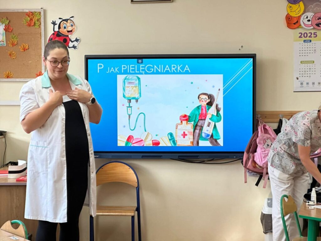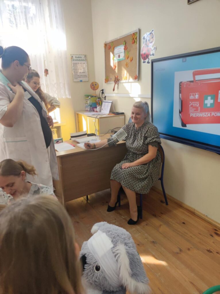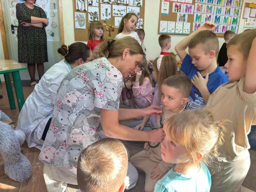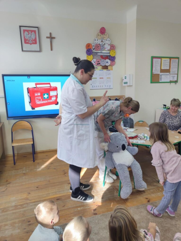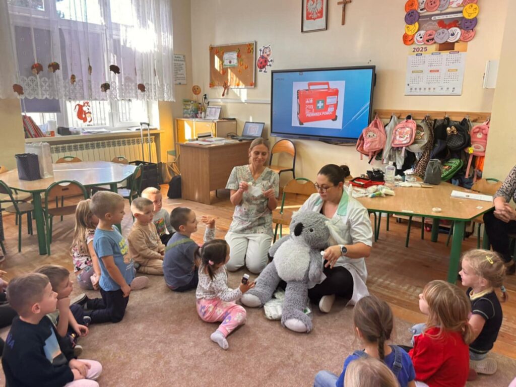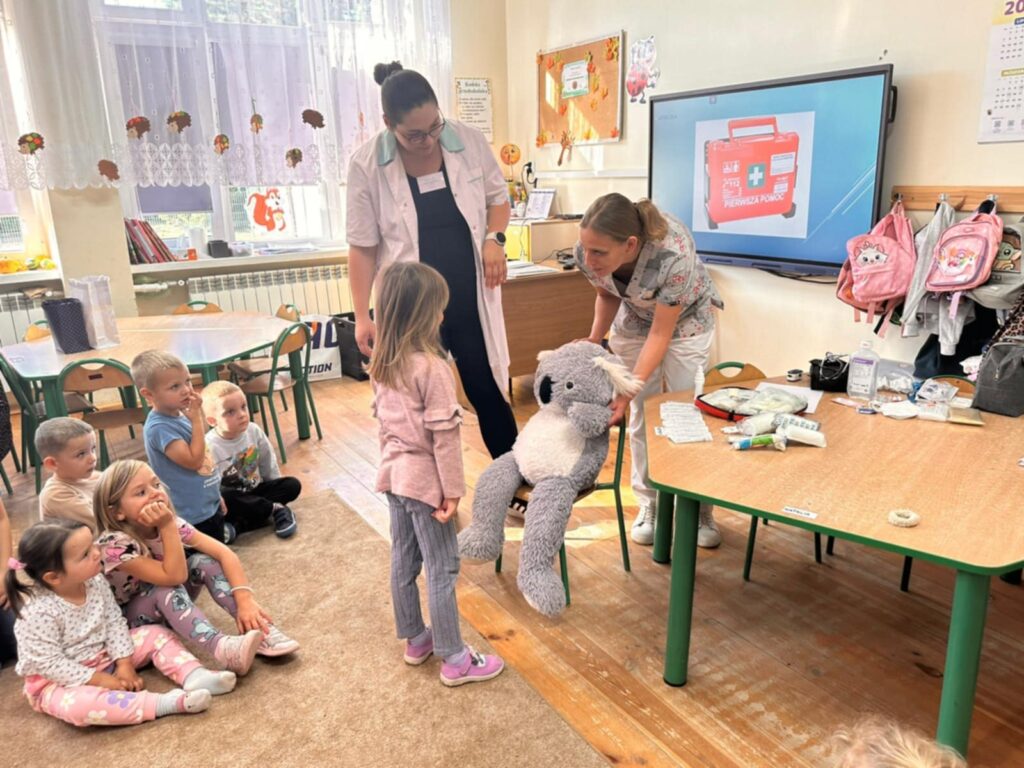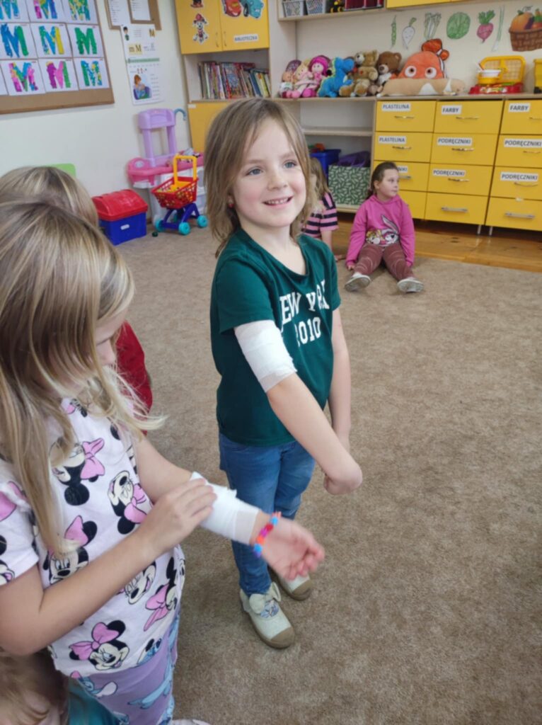 Dnia 23.10.2025 r. odwiedziły nas niezwykli Goście. Były to Panie, które z zawodu są pielęgniarkami i pracują w pobliskim szpitalu. Panie pielęgniarki opowiedziały dzieciom, na czym polega ich praca. Zaprezentowały atrybuty, jakimi posługują się w codziennej pracy. Przekazały też informację – jak dbać o zdrowie i higienę. Przy pomocy doświadczenia zobrazowały jak ważne jest dokładne i częste myciem rąk. Przedszkolaki uczyły się, jak opatrzyć ranę, założyć opaskę uciskową, przykleić plaster, zmierzyć ciśnienie oraz zrobić zastrzyk. Przy pomocy stetoskopu wsłuchiwały się w bicie serca. Utrwalone zostały numery telefonów: straży, policji, pogotowia oraz ogólnego numeru alarmowego – 112. Ogromną frajdę sprawiło im, charakteryzowanie się na pielęgniarza, pielęgniarkę i lekarza. Dzieci mogły zakładać: czepek, maski, rękawiczki. Na pamiątkę dostały odznakę „Dzielonego Pacjenta”. Serdecznie dziękujemy naszym niecodziennym Gościom za praktyczną, a zarazem tak atrakcyjną lekcję, którą dzieci z pewnością zapamiętają na długo.