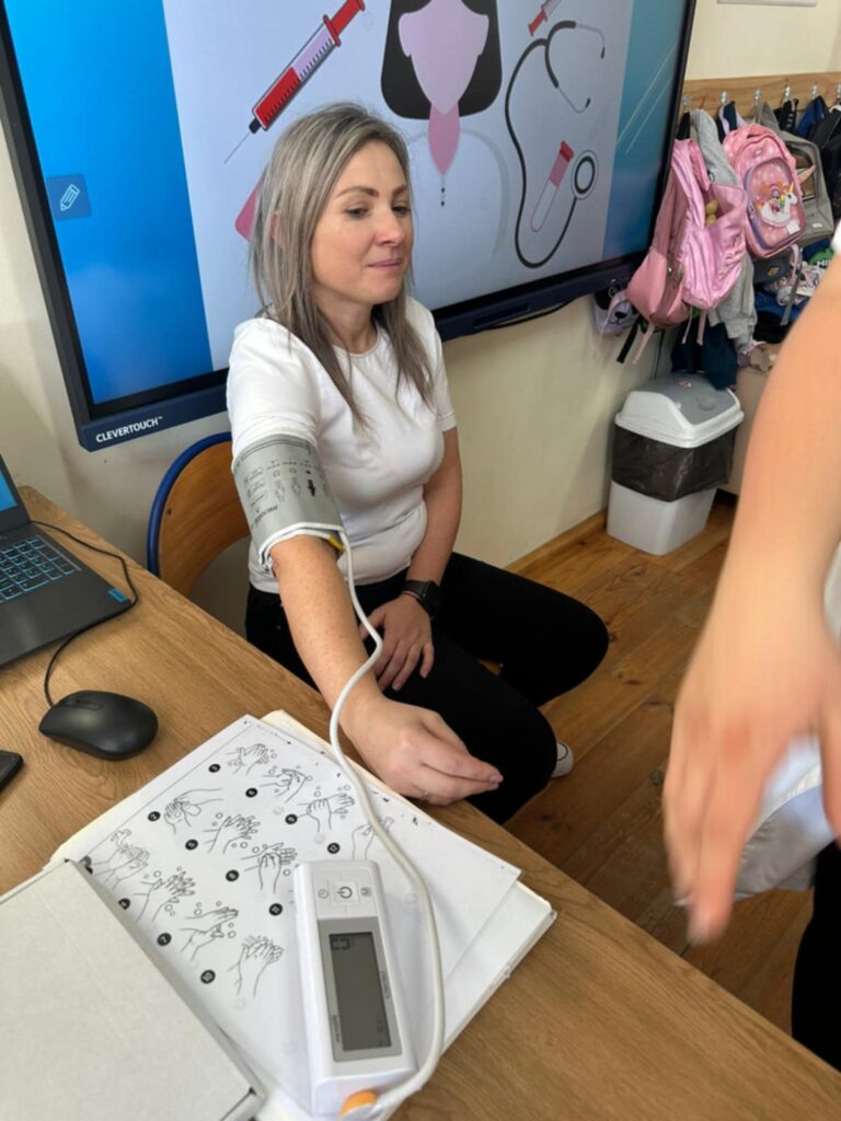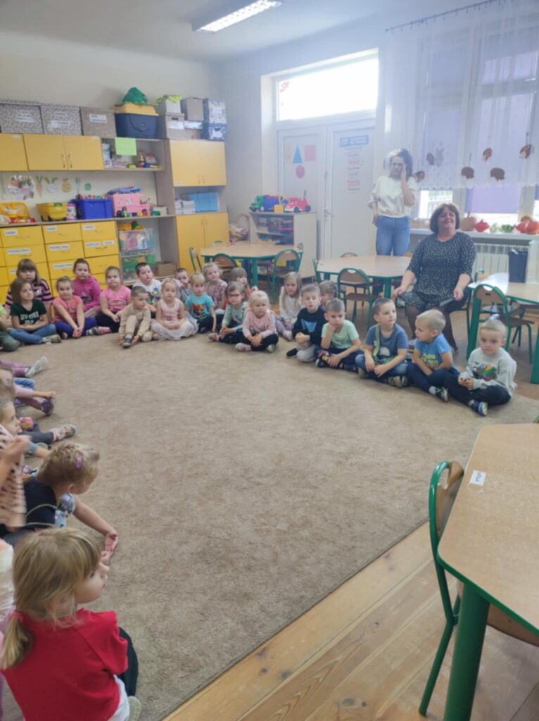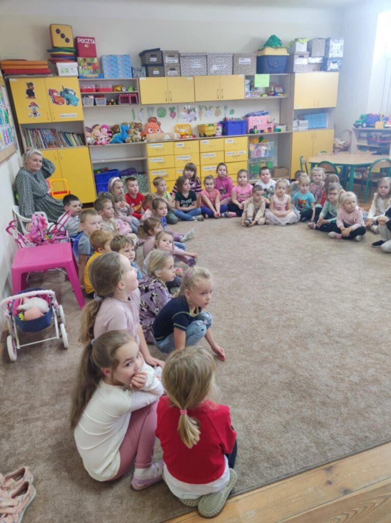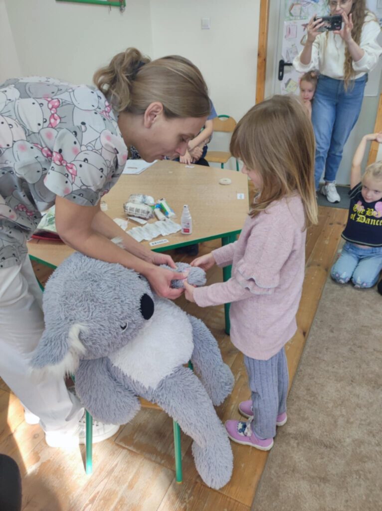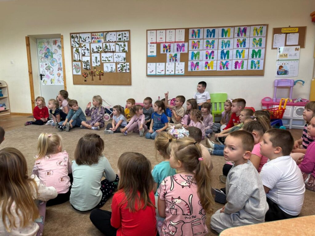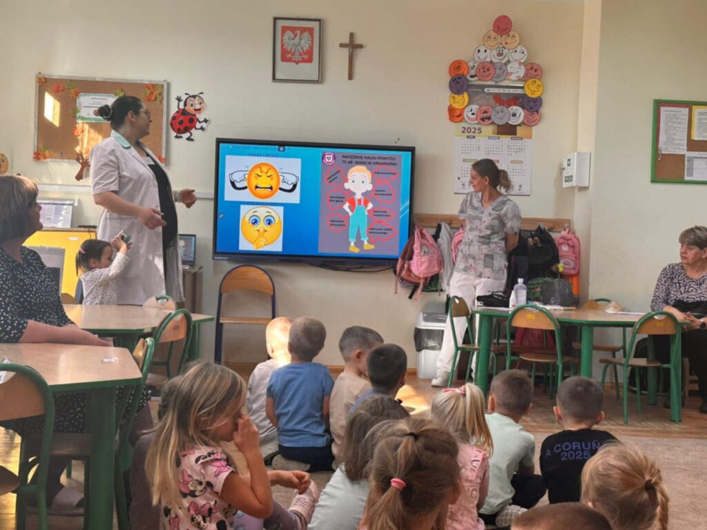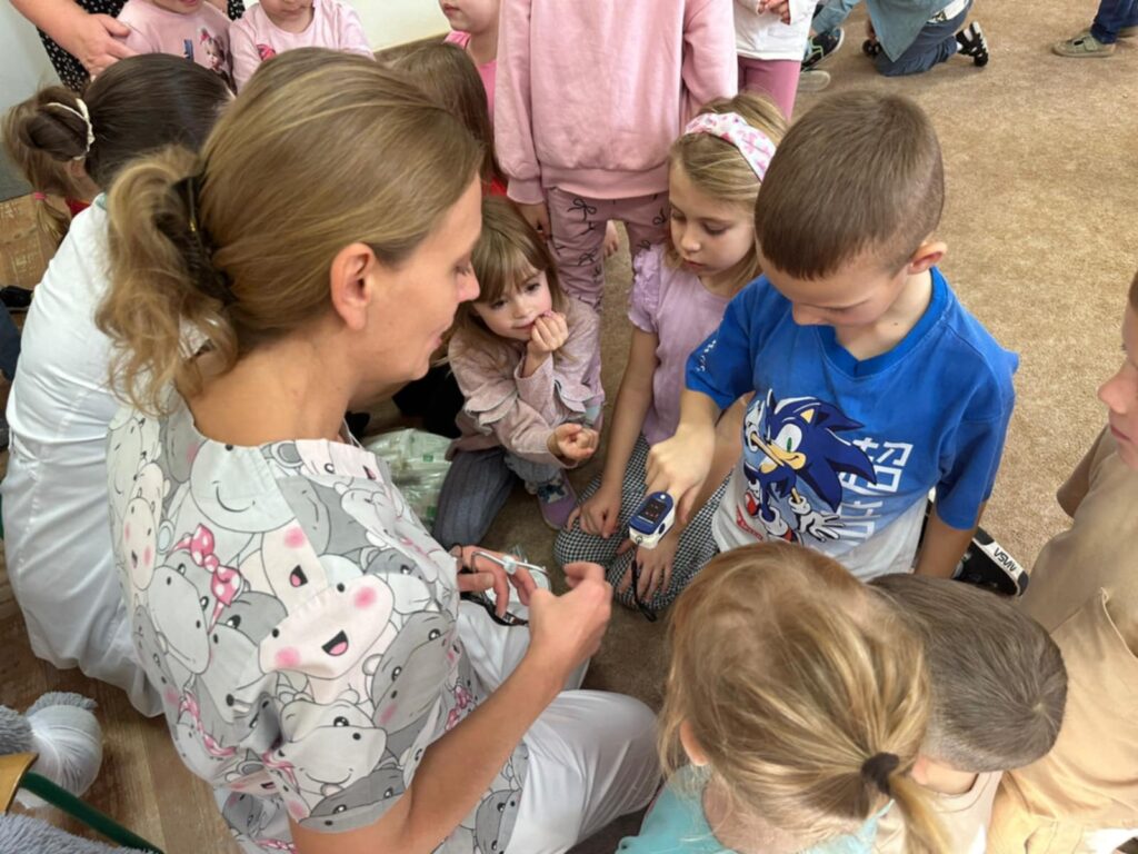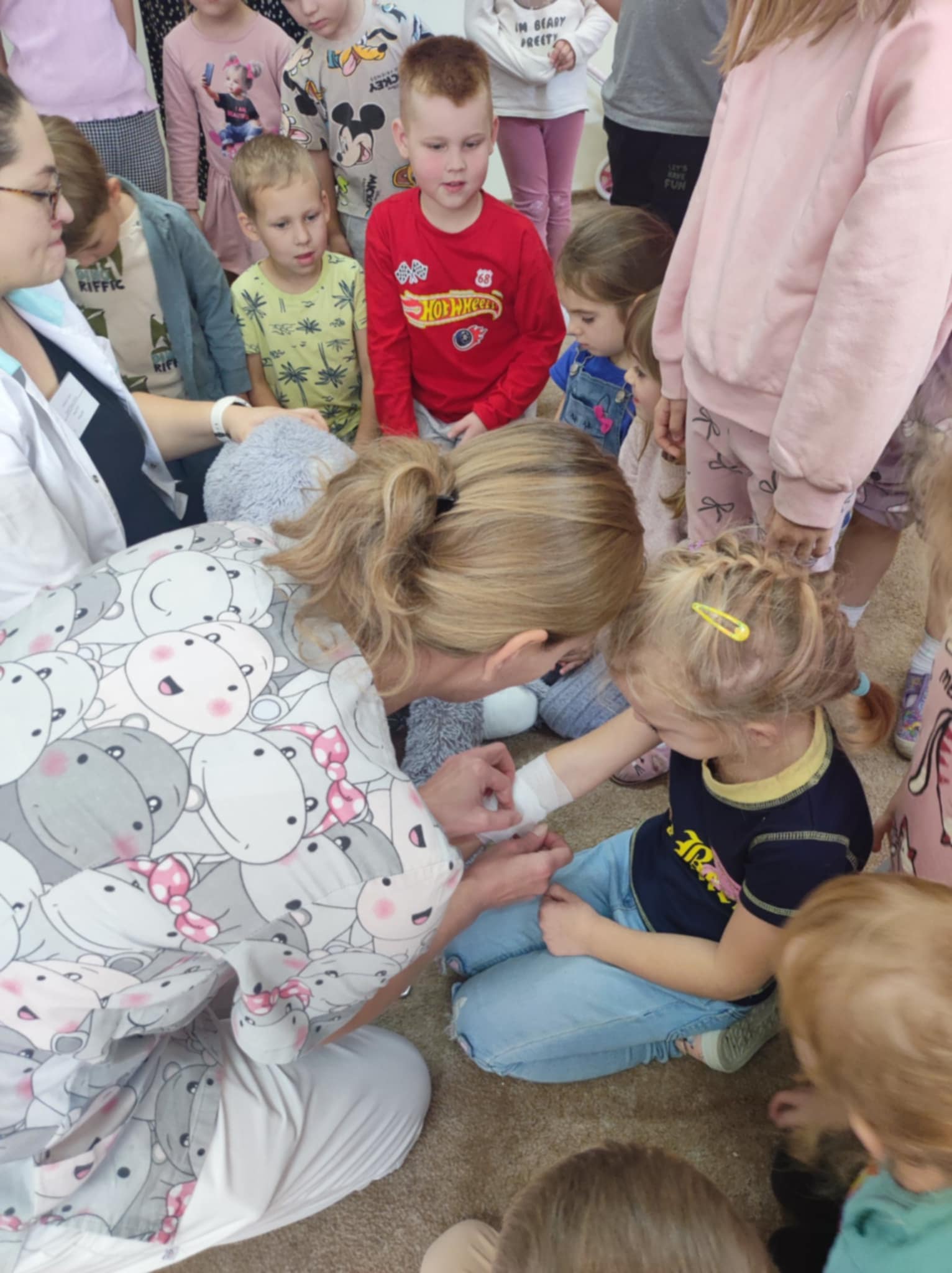 Dnia 23.10.2025 r. odwiedziły nas niezwykli Goście. Były to Panie, które z zawodu są pielęgniarkami i pracują w pobliskim szpitalu. Panie pielęgniarki opowiedziały dzieciom, na czym polega ich praca. Zaprezentowały atrybuty, jakimi posługują się w codziennej pracy. Przekazały też informację – jak dbać o zdrowie i higienę. Przy pomocy doświadczenia zobrazowały jak ważne jest dokładne i częste myciem rąk. Przedszkolaki uczyły się, jak opatrzyć ranę, założyć opaskę uciskową, przykleić plaster, zmierzyć ciśnienie oraz zrobić zastrzyk. Przy pomocy stetoskopu wsłuchiwały się w bicie serca. Utrwalone zostały numery telefonów: straży, policji, pogotowia oraz ogólnego numeru alarmowego – 112. Ogromną frajdę sprawiło im, charakteryzowanie się na pielęgniarza, pielęgniarkę i lekarza. Dzieci mogły zakładać: czepek, maski, rękawiczki. Na pamiątkę dostały odznakę „Dzielonego Pacjenta”. Serdecznie dziękujemy naszym niecodziennym Gościom za praktyczną, a zarazem tak atrakcyjną lekcję, którą dzieci z pewnością zapamiętają na długo.
