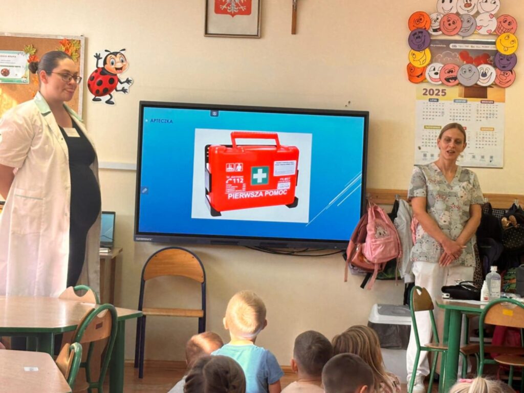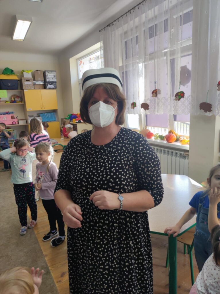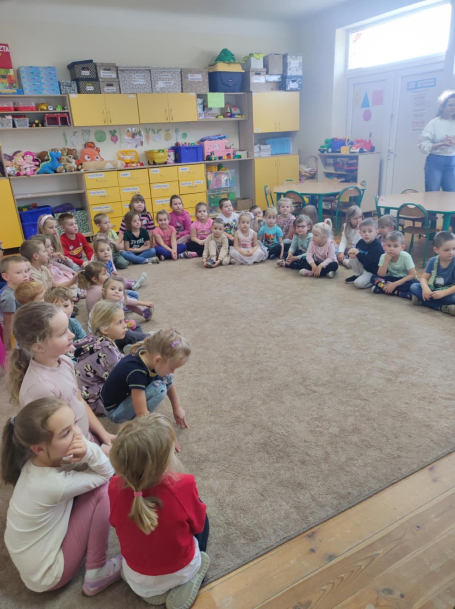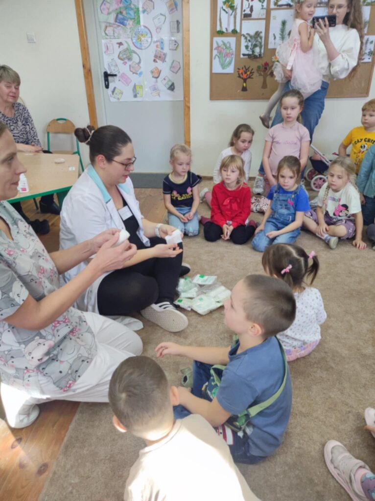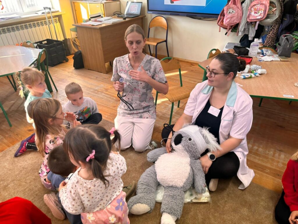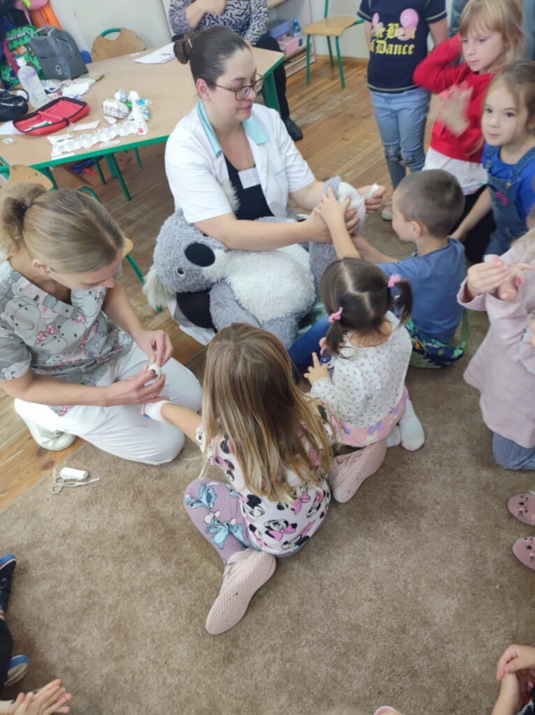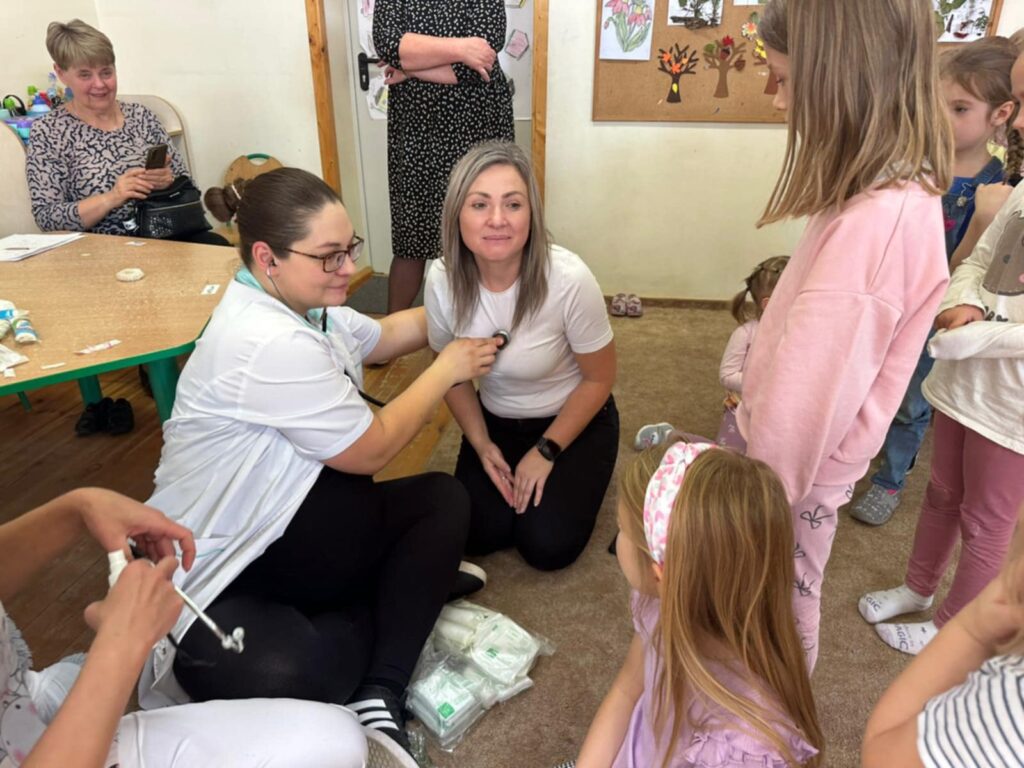 Dnia 23.10.2025 r. odwiedziły nas niezwykli Goście. Były to Panie, które z zawodu są pielęgniarkami i pracują w pobliskim szpitalu. Panie pielęgniarki opowiedziały dzieciom, na czym polega ich praca. Zaprezentowały atrybuty, jakimi posługują się w codziennej pracy. Przekazały też informację – jak dbać o zdrowie i higienę. Przy pomocy doświadczenia zobrazowały jak ważne jest dokładne i częste myciem rąk. Przedszkolaki uczyły się, jak opatrzyć ranę, założyć opaskę uciskową, przykleić plaster, zmierzyć ciśnienie oraz zrobić zastrzyk. Przy pomocy stetoskopu wsłuchiwały się w bicie serca. Utrwalone zostały numery telefonów: straży, policji, pogotowia oraz ogólnego numeru alarmowego – 112. Ogromną frajdę sprawiło im, charakteryzowanie się na pielęgniarza, pielęgniarkę i lekarza. Dzieci mogły zakładać: czepek, maski, rękawiczki. Na pamiątkę dostały odznakę „Dzielonego Pacjenta”. Serdecznie dziękujemy naszym niecodziennym Gościom za praktyczną, a zarazem tak atrakcyjną lekcję, którą dzieci z pewnością zapamiętają na długo.