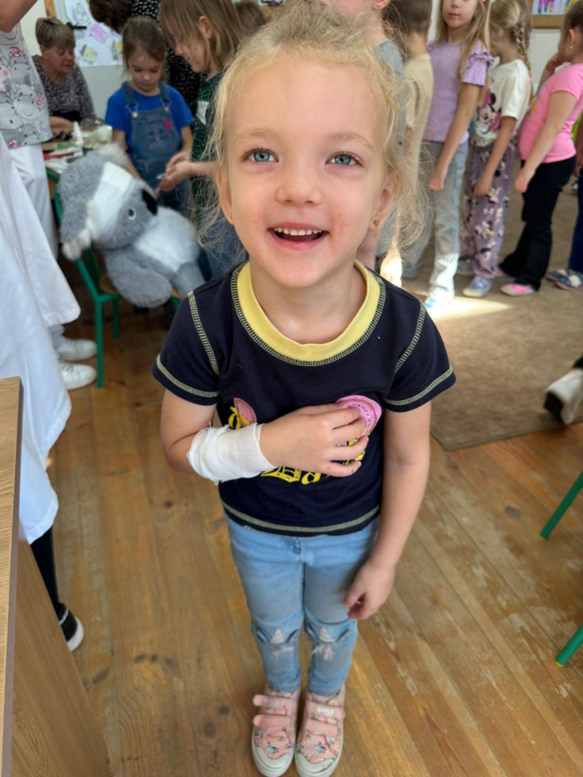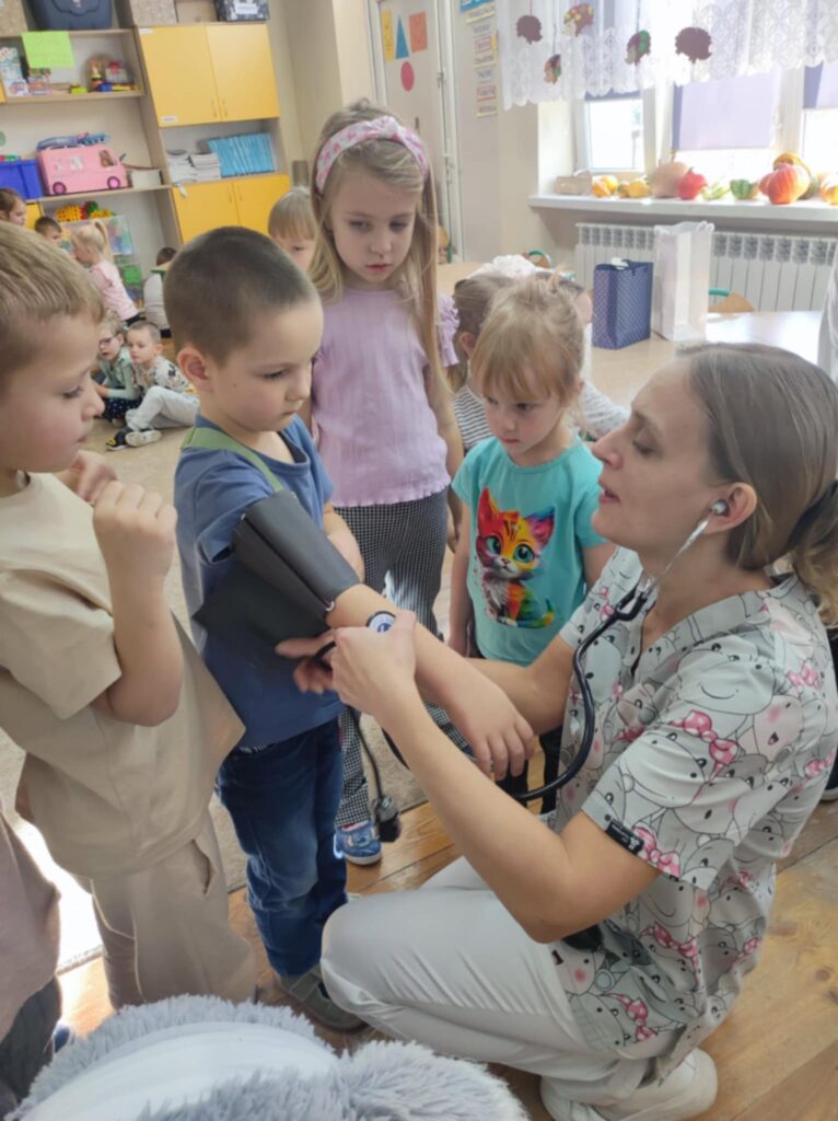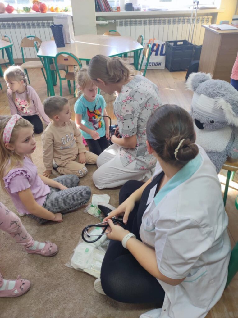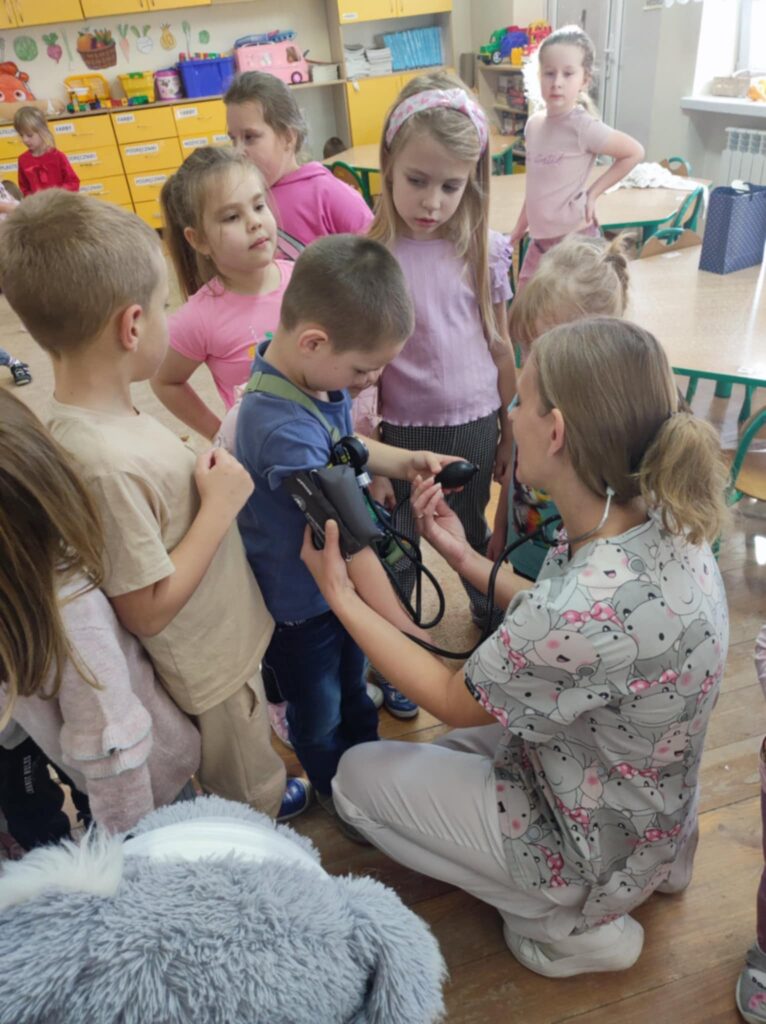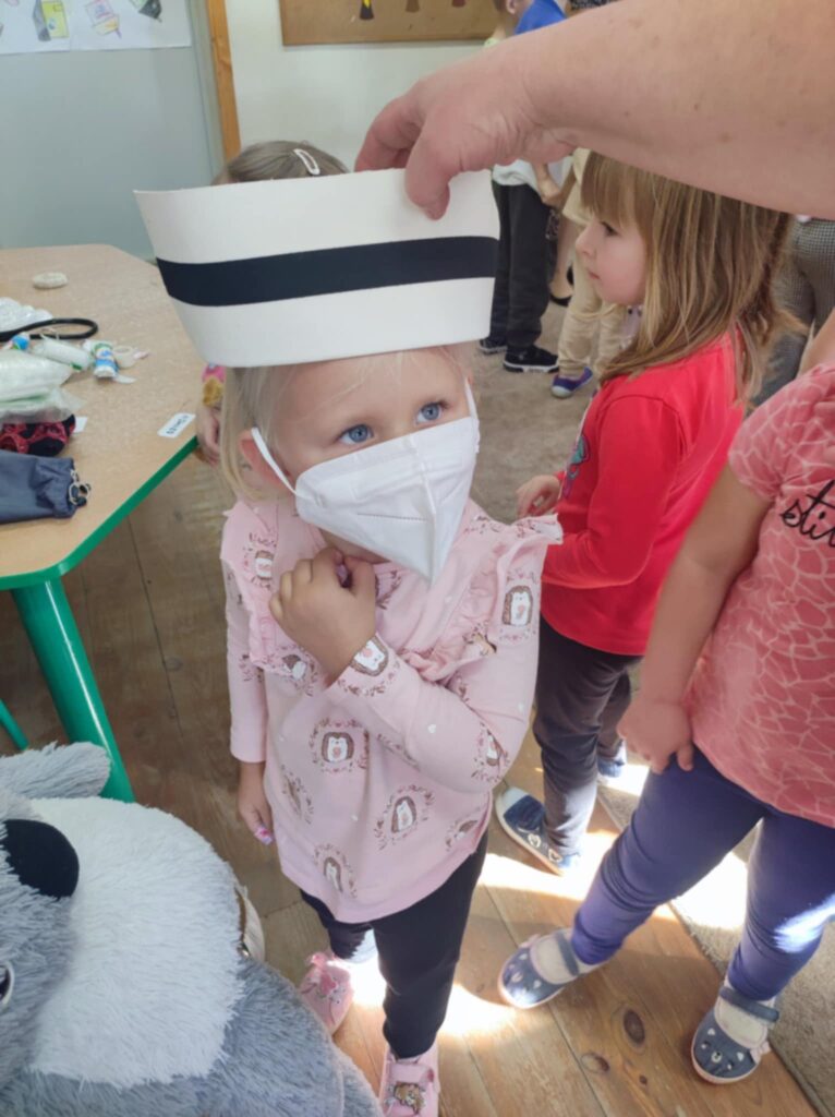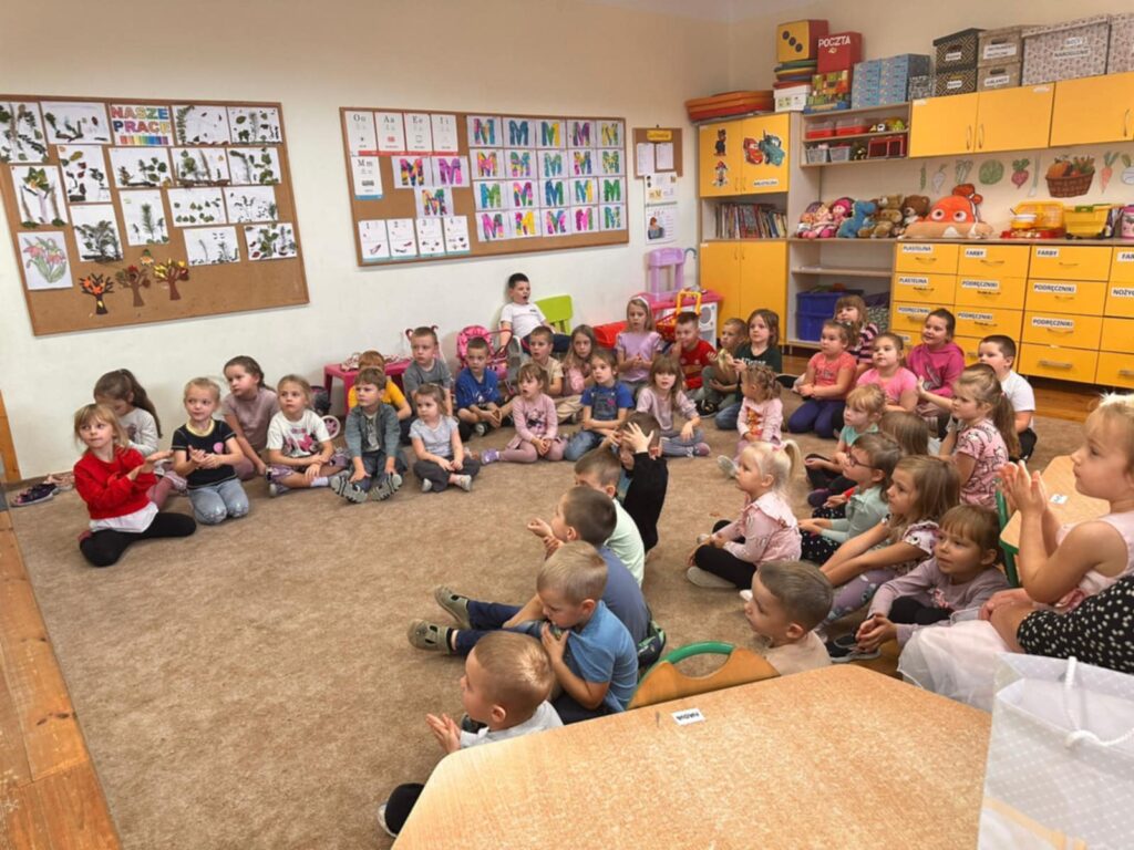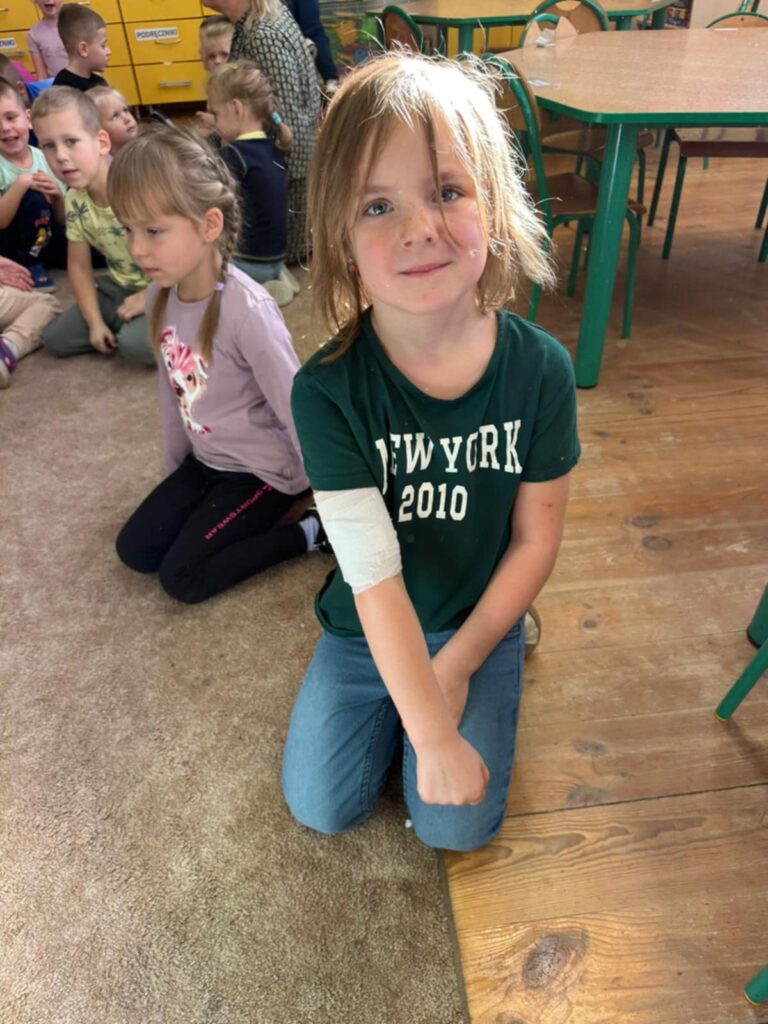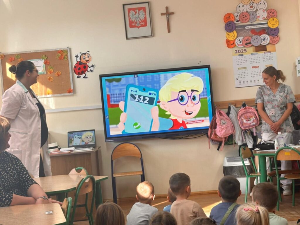 Dnia 23.10.2025 r. odwiedziły nas niezwykli Goście. Były to Panie, które z zawodu są pielęgniarkami i pracują w pobliskim szpitalu. Panie pielęgniarki opowiedziały dzieciom, na czym polega ich praca. Zaprezentowały atrybuty, jakimi posługują się w codziennej pracy. Przekazały też informację – jak dbać o zdrowie i higienę. Przy pomocy doświadczenia zobrazowały jak ważne jest dokładne i częste myciem rąk. Przedszkolaki uczyły się, jak opatrzyć ranę, założyć opaskę uciskową, przykleić plaster, zmierzyć ciśnienie oraz zrobić zastrzyk. Przy pomocy stetoskopu wsłuchiwały się w bicie serca. Utrwalone zostały numery telefonów: straży, policji, pogotowia oraz ogólnego numeru alarmowego – 112. Ogromną frajdę sprawiło im, charakteryzowanie się na pielęgniarza, pielęgniarkę i lekarza. Dzieci mogły zakładać: czepek, maski, rękawiczki. Na pamiątkę dostały odznakę „Dzielonego Pacjenta”. Serdecznie dziękujemy naszym niecodziennym Gościom za praktyczną, a zarazem tak atrakcyjną lekcję, którą dzieci z pewnością zapamiętają na długo.