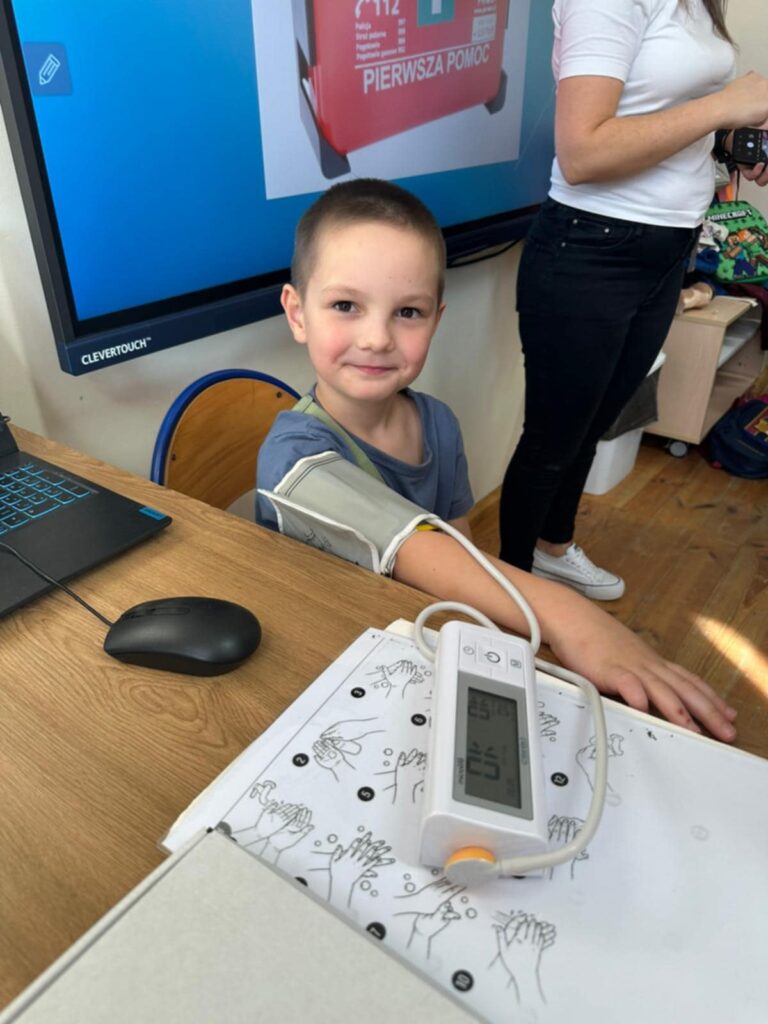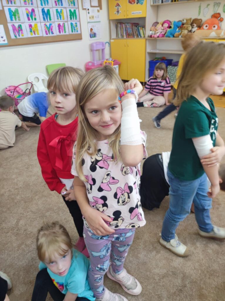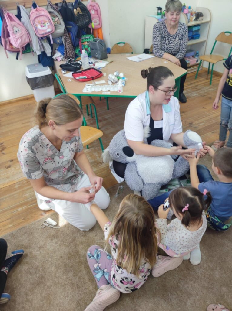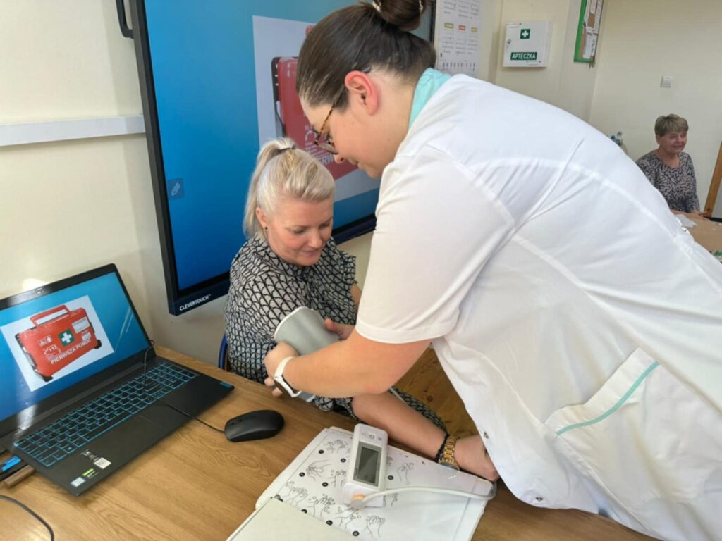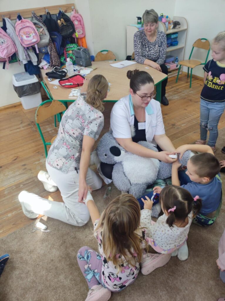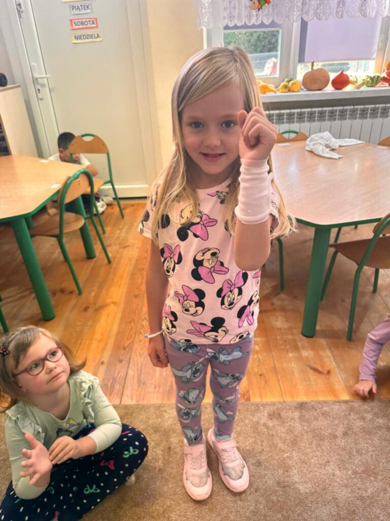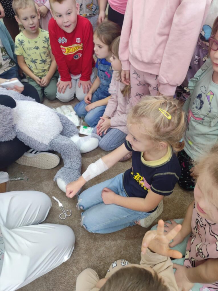 Dnia 23.10.2025 r. odwiedziły nas niezwykli Goście. Były to Panie, które z zawodu są pielęgniarkami i pracują w pobliskim szpitalu. Panie pielęgniarki opowiedziały dzieciom, na czym polega ich praca. Zaprezentowały atrybuty, jakimi posługują się w codziennej pracy. Przekazały też informację – jak dbać o zdrowie i higienę. Przy pomocy doświadczenia zobrazowały jak ważne jest dokładne i częste myciem rąk. Przedszkolaki uczyły się, jak opatrzyć ranę, założyć opaskę uciskową, przykleić plaster, zmierzyć ciśnienie oraz zrobić zastrzyk. Przy pomocy stetoskopu wsłuchiwały się w bicie serca. Utrwalone zostały numery telefonów: straży, policji, pogotowia oraz ogólnego numeru alarmowego – 112. Ogromną frajdę sprawiło im, charakteryzowanie się na pielęgniarza, pielęgniarkę i lekarza. Dzieci mogły zakładać: czepek, maski, rękawiczki. Na pamiątkę dostały odznakę „Dzielonego Pacjenta”. Serdecznie dziękujemy naszym niecodziennym Gościom za praktyczną, a zarazem tak atrakcyjną lekcję, którą dzieci z pewnością zapamiętają na długo.