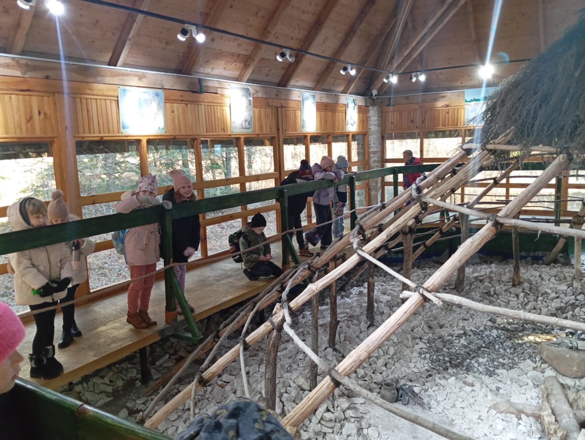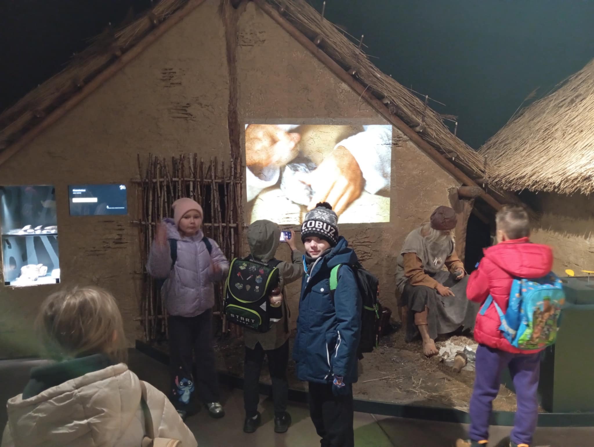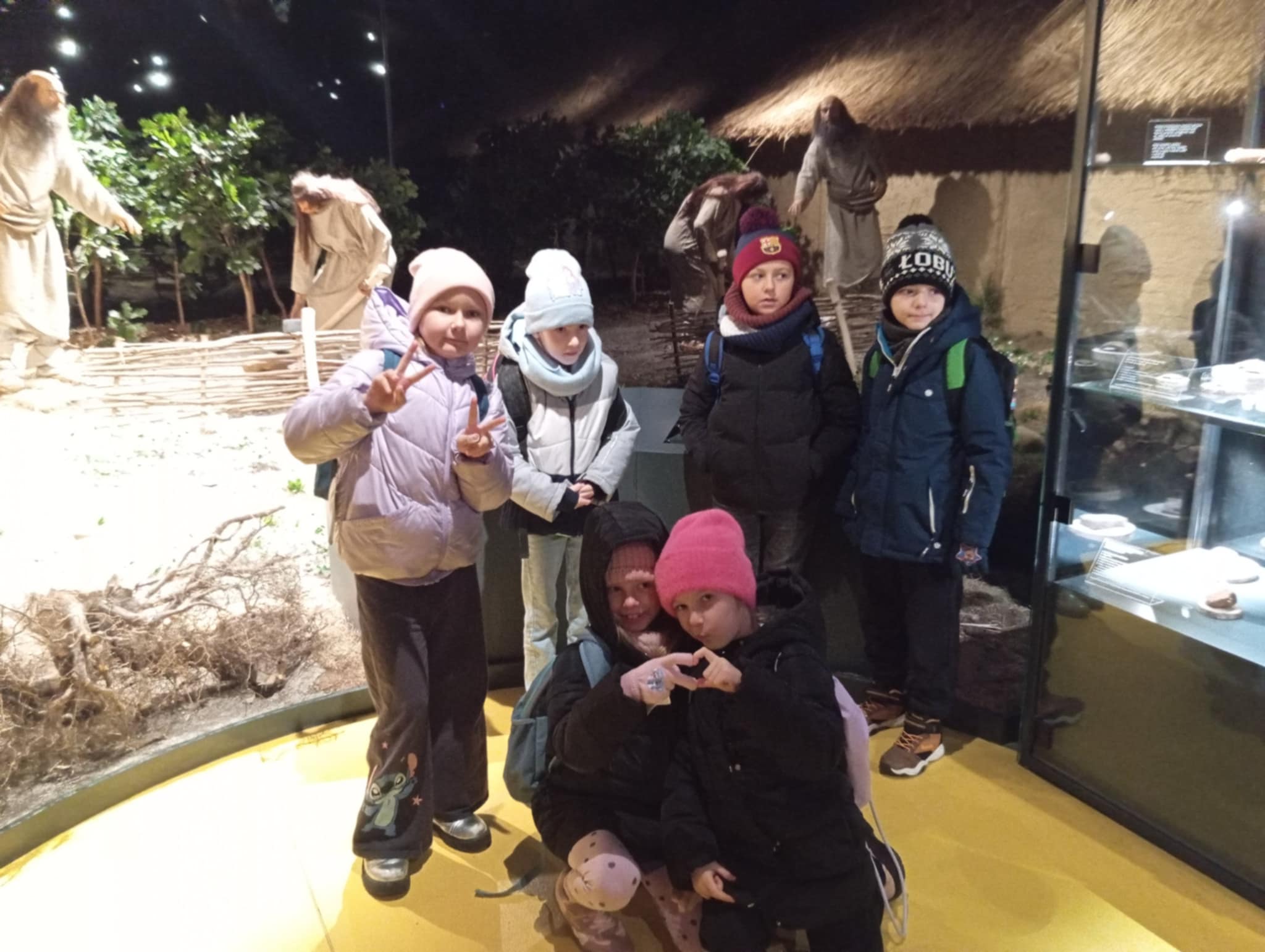 Dnia 19 listopada 2025 roku uczniowie klasy II udali się do Muzeum Archeologicznego w Krzemionkach Opatowskich. Zwiedzanie rozpoczęli od obejrzenia makiet ukazujących życie ludzi w młodszej epoce kamienia- neolicie. Obejrzeli też filmy przybliżające życie ludzi w tak odległych czasach. Pani przewodnik opowiedziała dzieciom o początkach zainteresowania terenem Krzemionek Opatowskich, które rozpoczął archeolog prof. Jan Samsonowicz w 1922 roku.