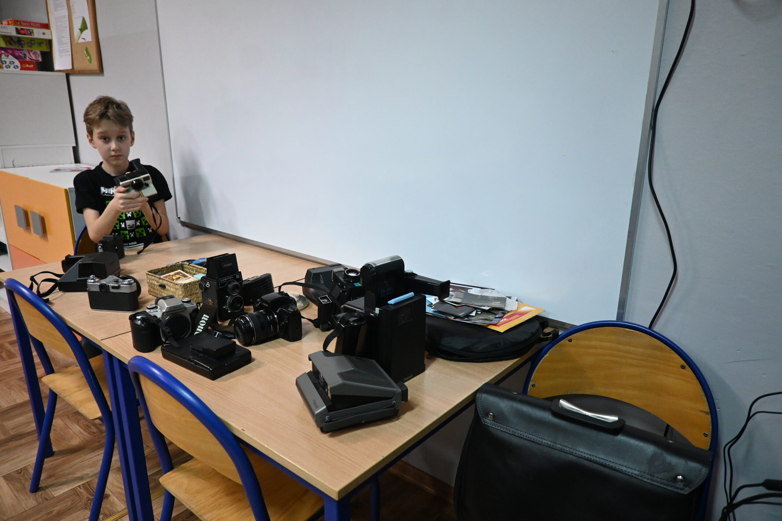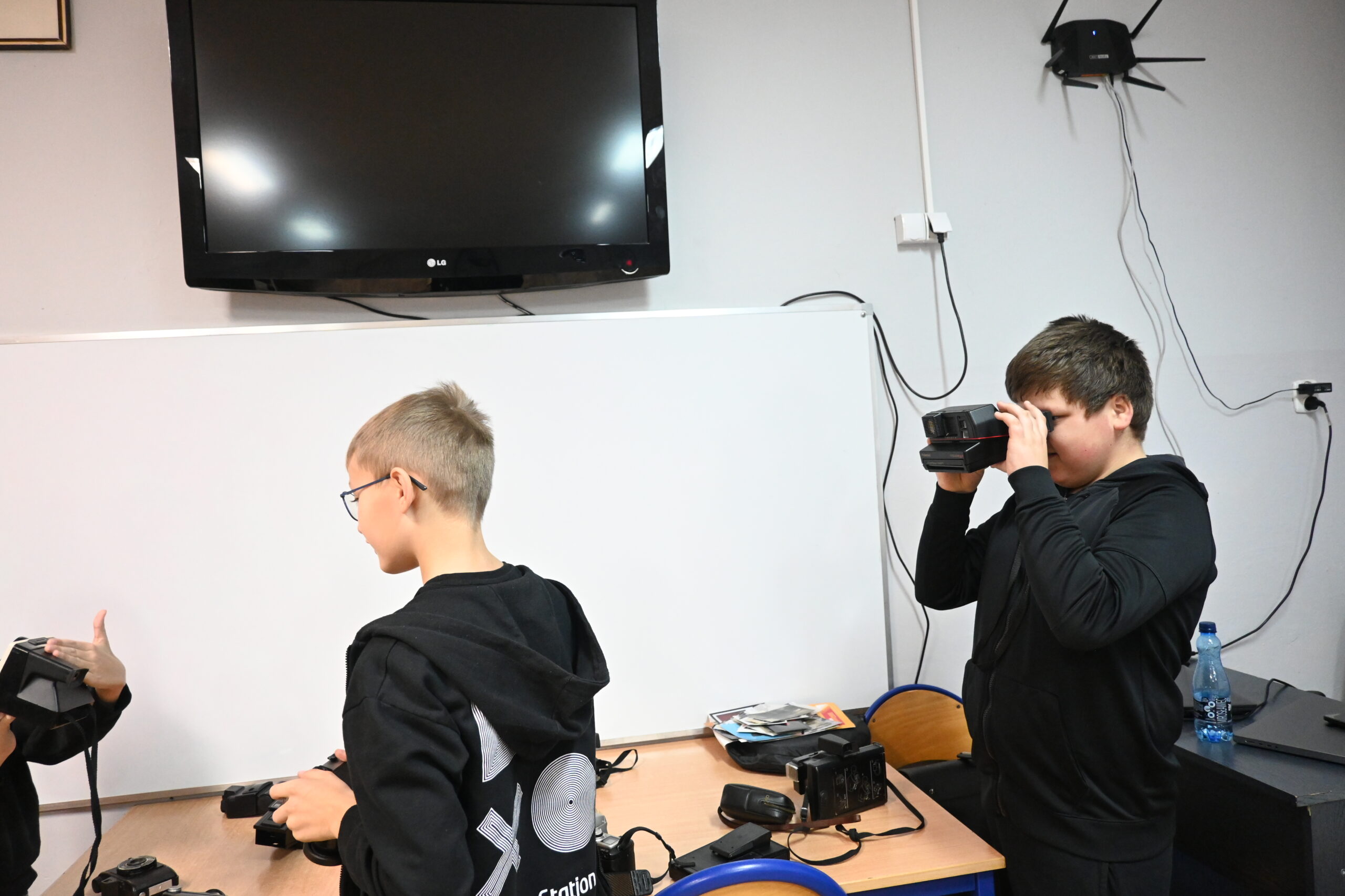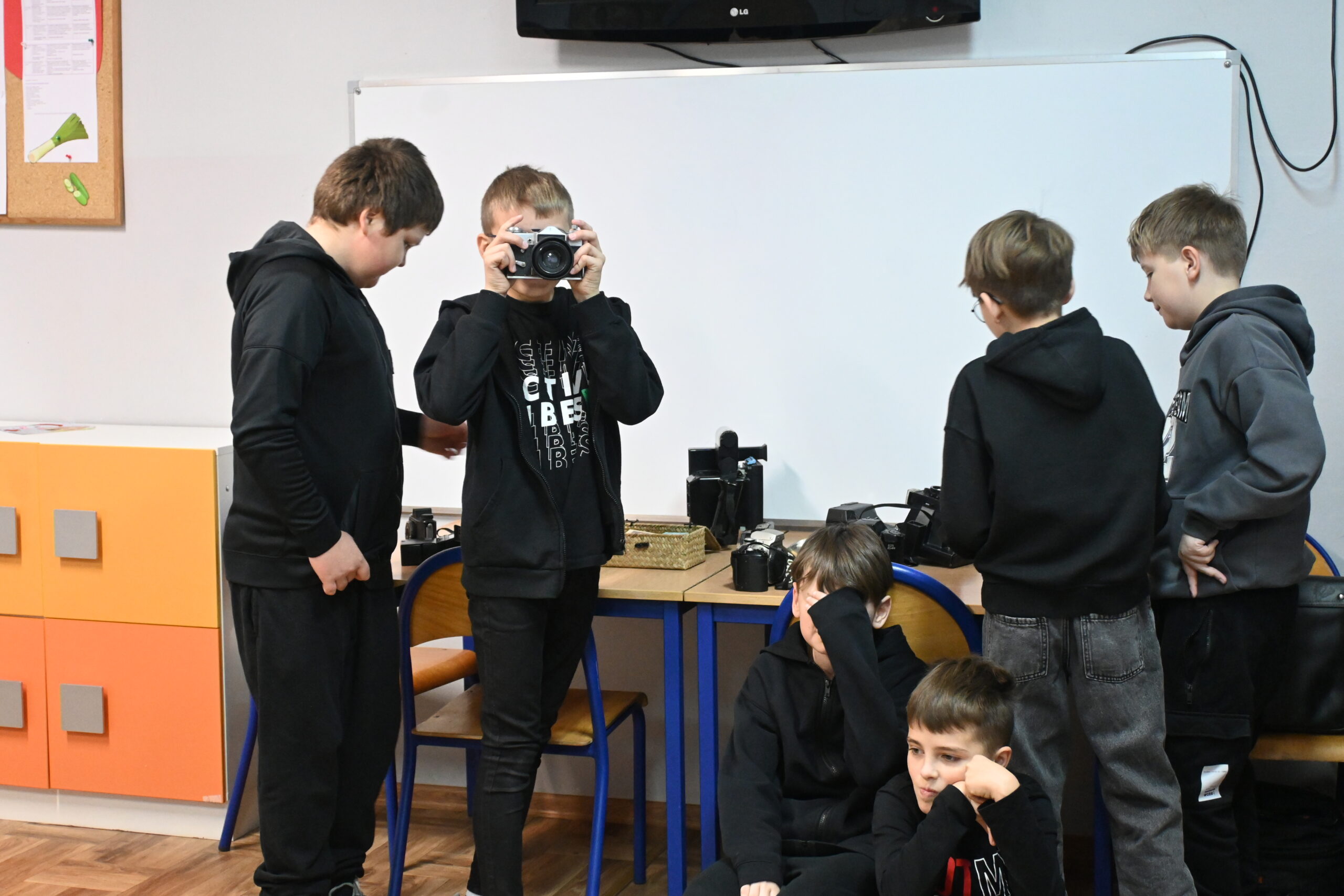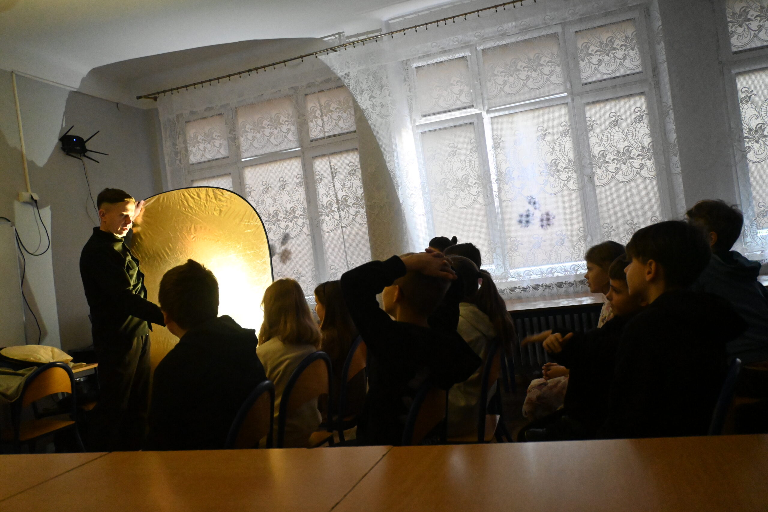Pan Chudkiewicz rozpoczął warsztaty krótką prezentacją na temat podstaw fotografii. Podczas spotkania uczniowie dowiedzieli się: jak prawidłowo kadrować, jak wykorzystać światło, jak uchwycić emocje na fotografii.