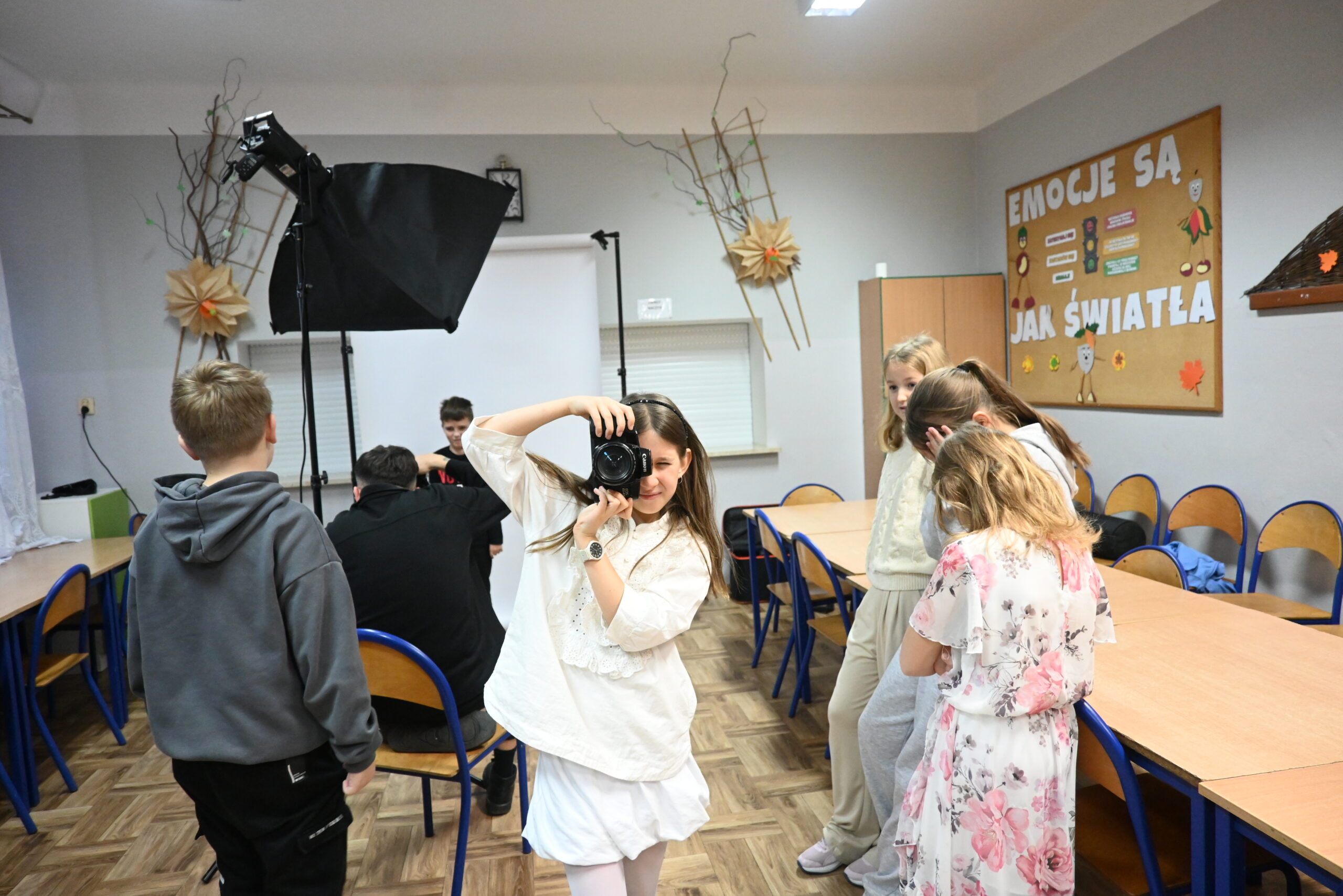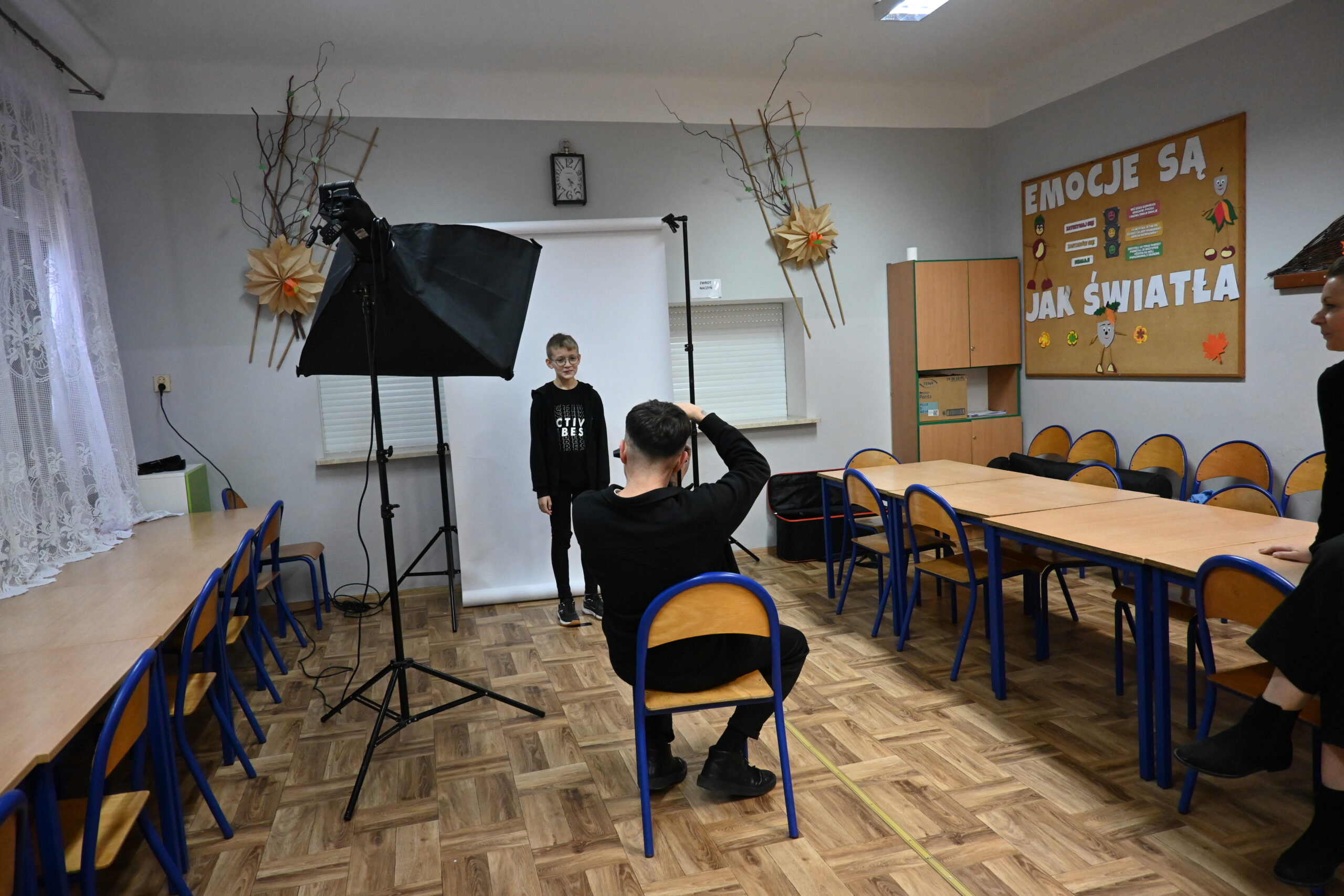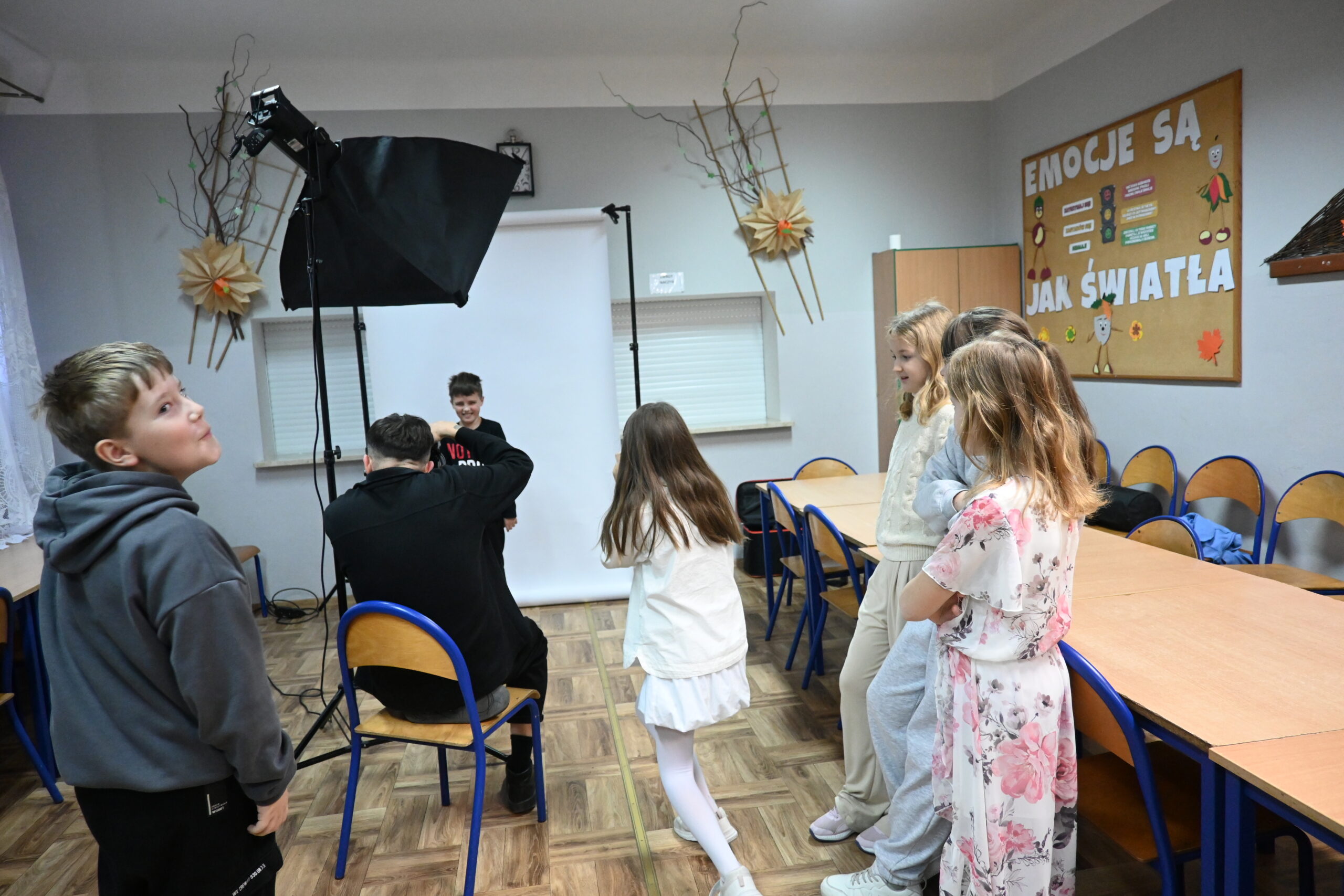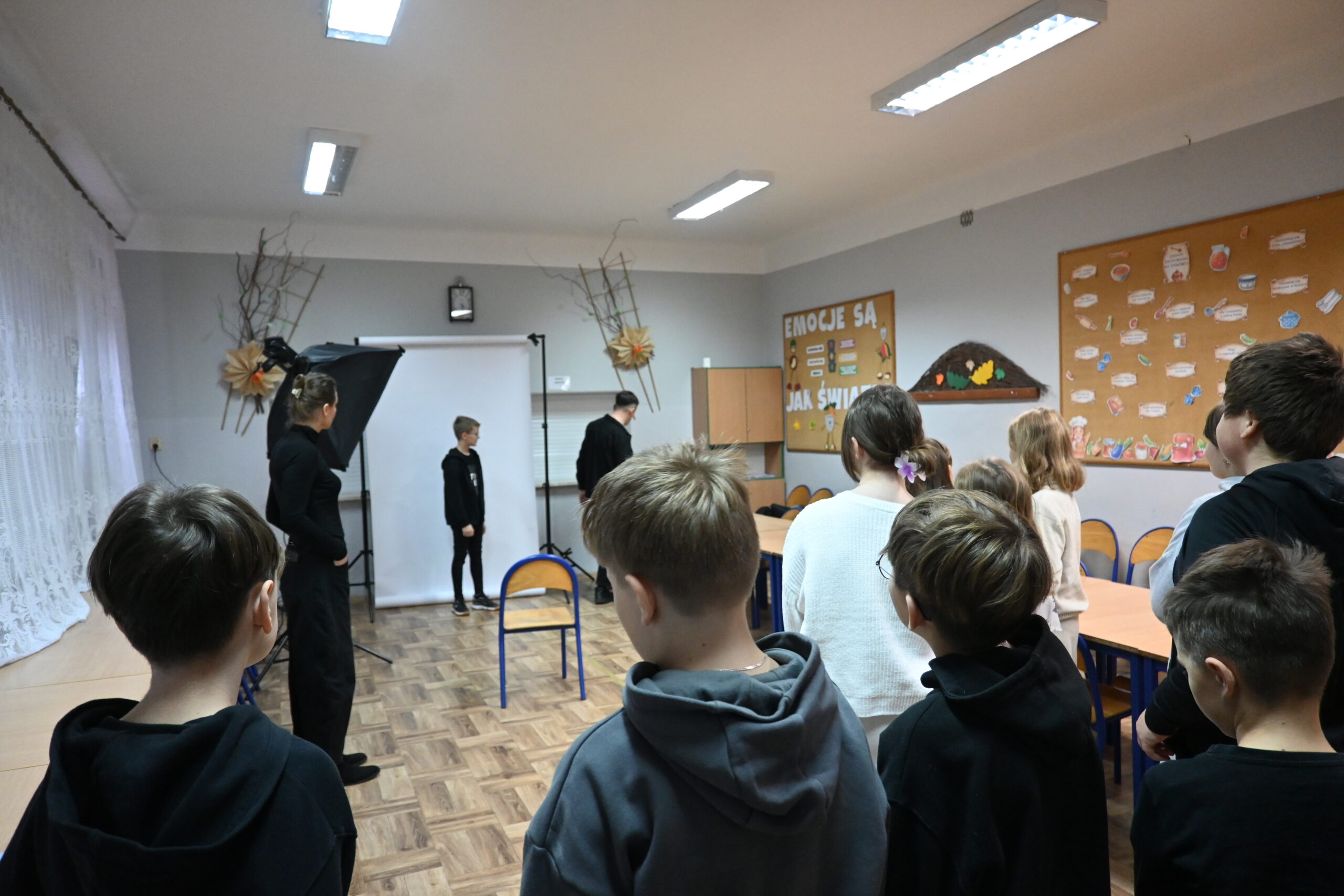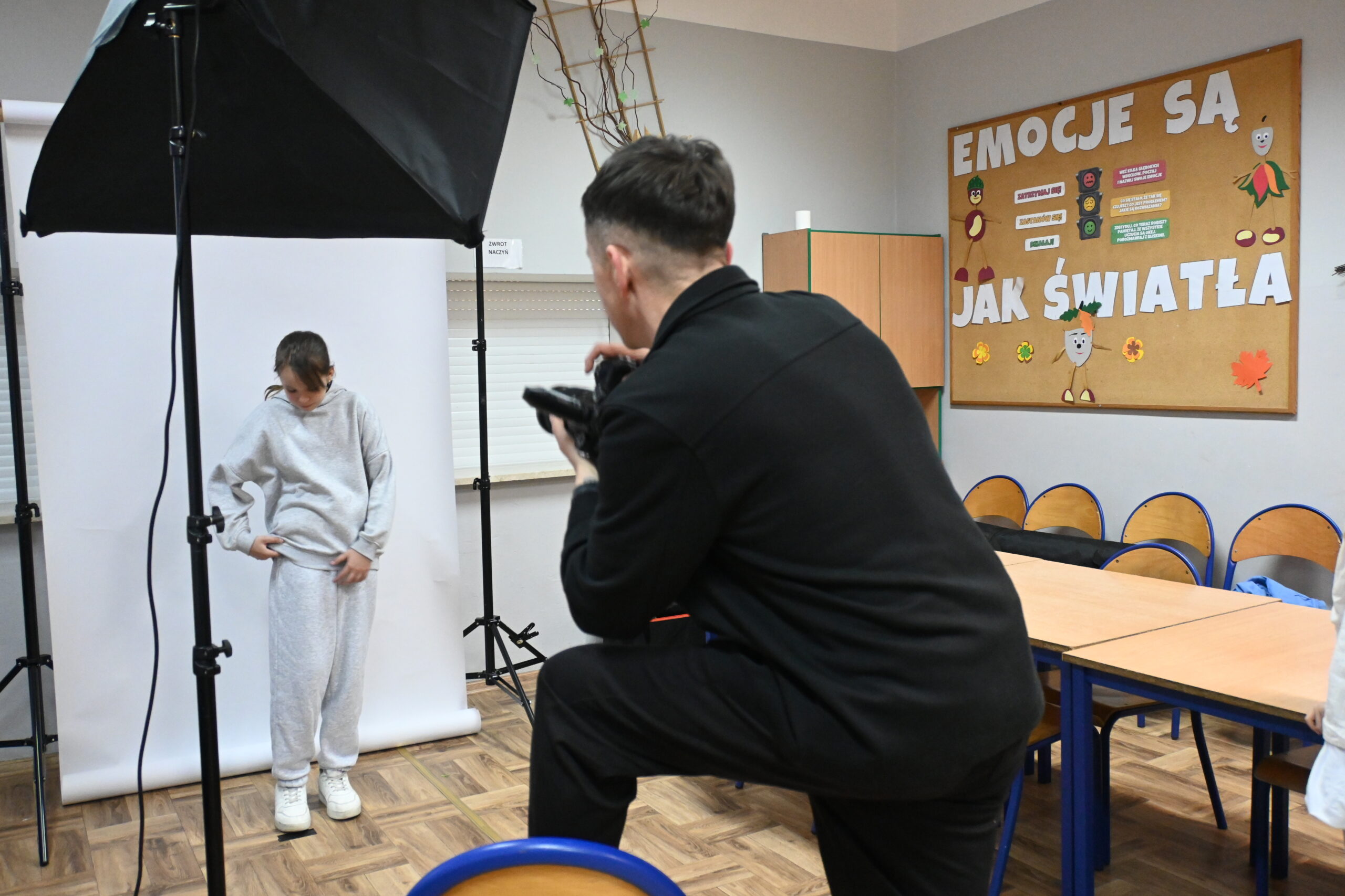 Pan Przemek nie tylko ciekawie opowiadał o swojej pracy i pasji, ale również przygotował indywidualną sesję fotograficzną dla każdego ucznia. Dzieci mogły poczuć się jak w profesjonalnym studio. Serdecznie dziękujemy Panu Przemysławowi za poprowadzenie inspirujących warsztatów.