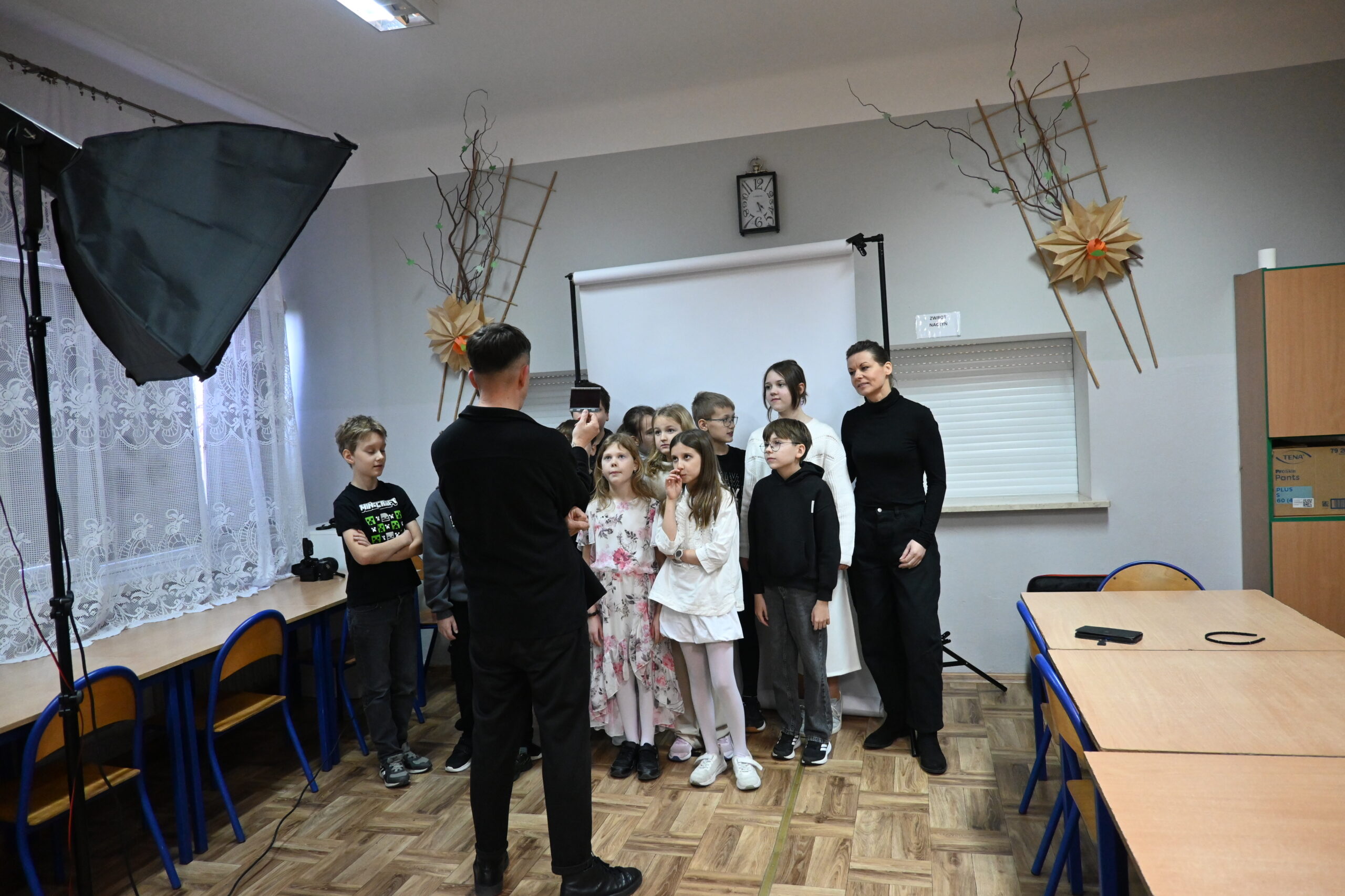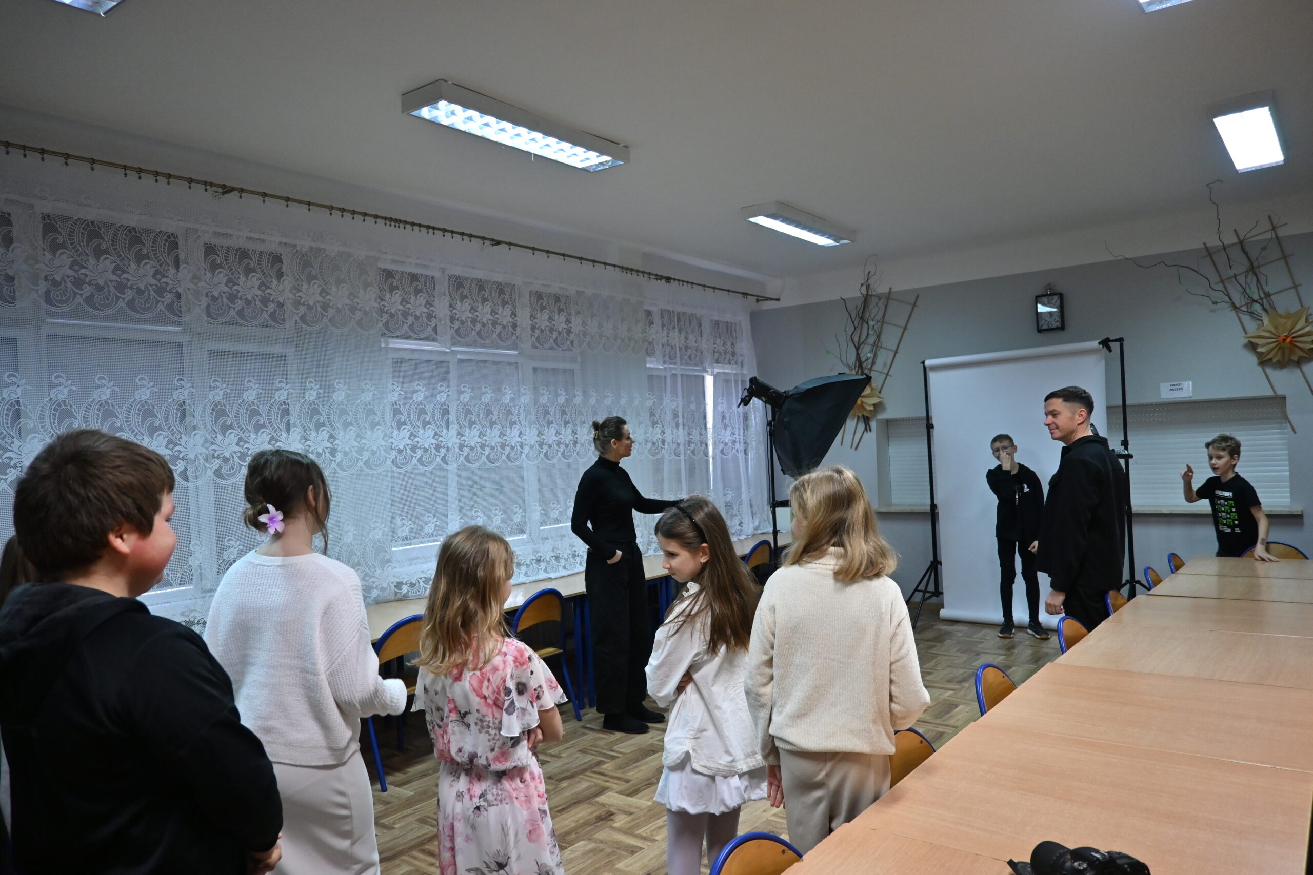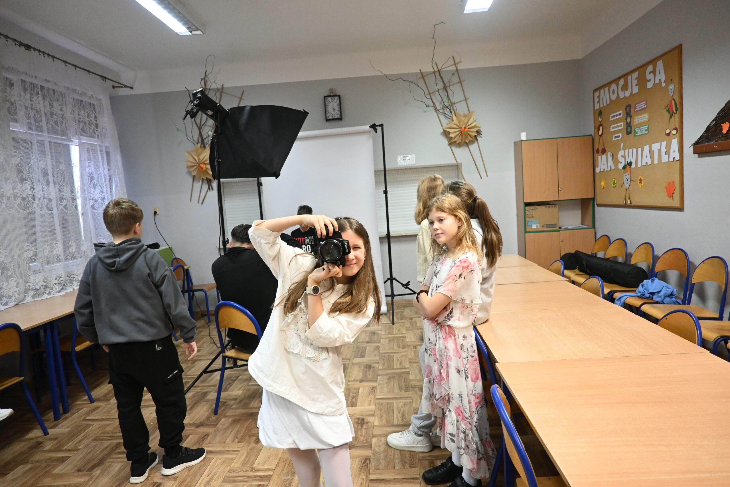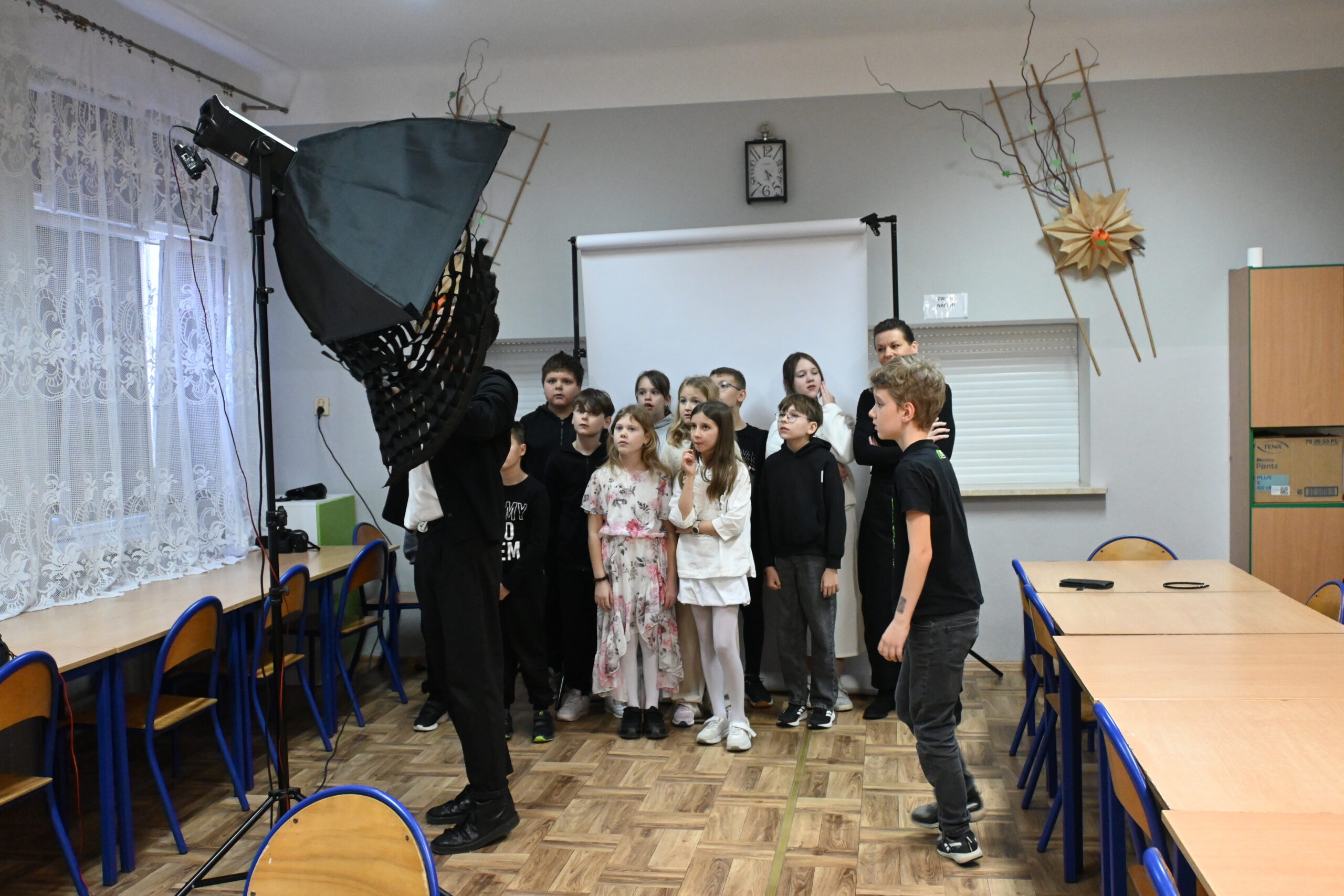 Pan Przemek nie tylko ciekawie opowiadał o swojej pracy i pasji, ale również przygotował indywidualną sesję fotograficzną dla każdego ucznia. Dzieci mogły poczuć się jak w profesjonalnym studio. Serdecznie dziękujemy Panu Przemysławowi za poprowadzenie inspirujących warsztatów.