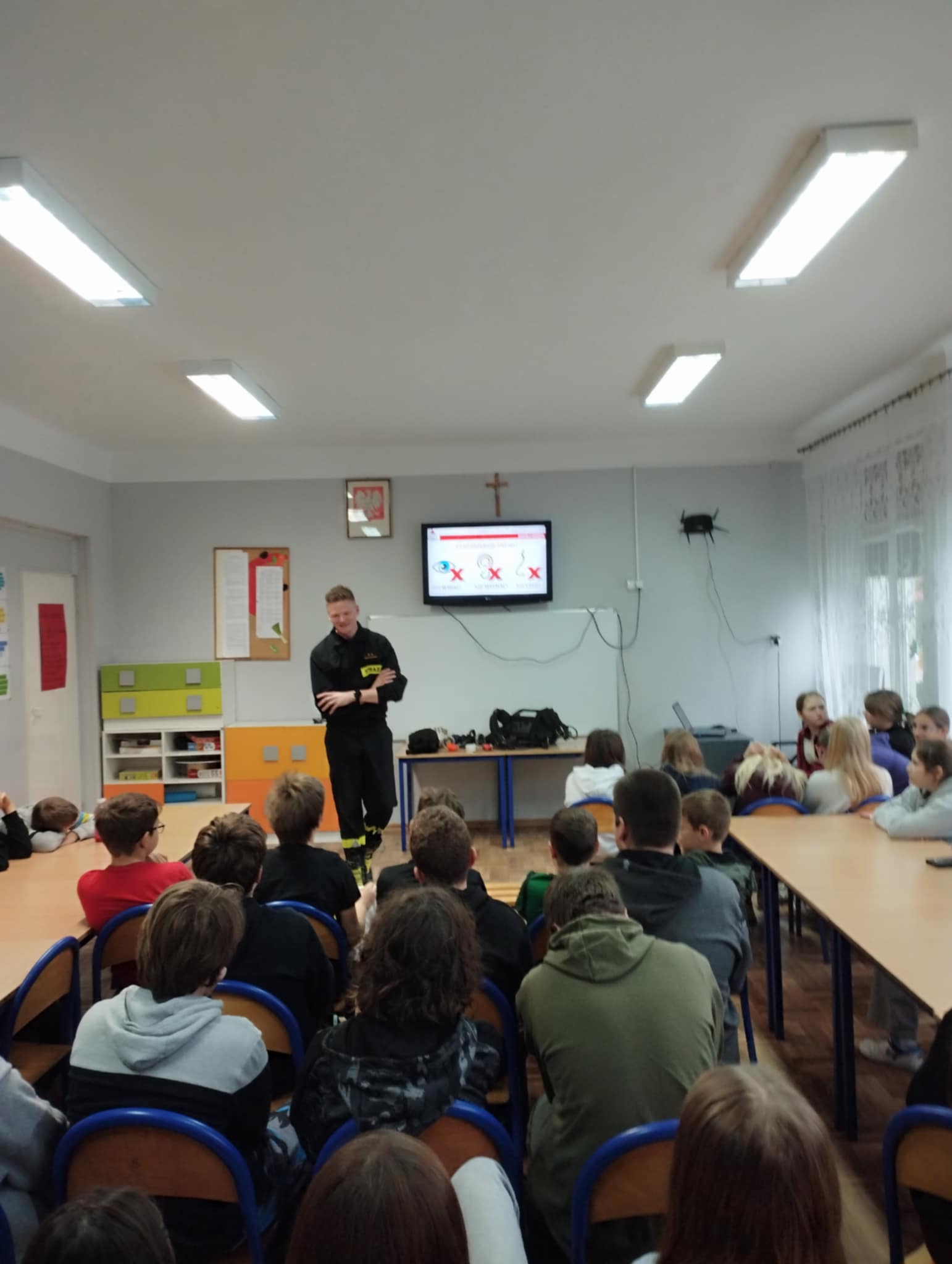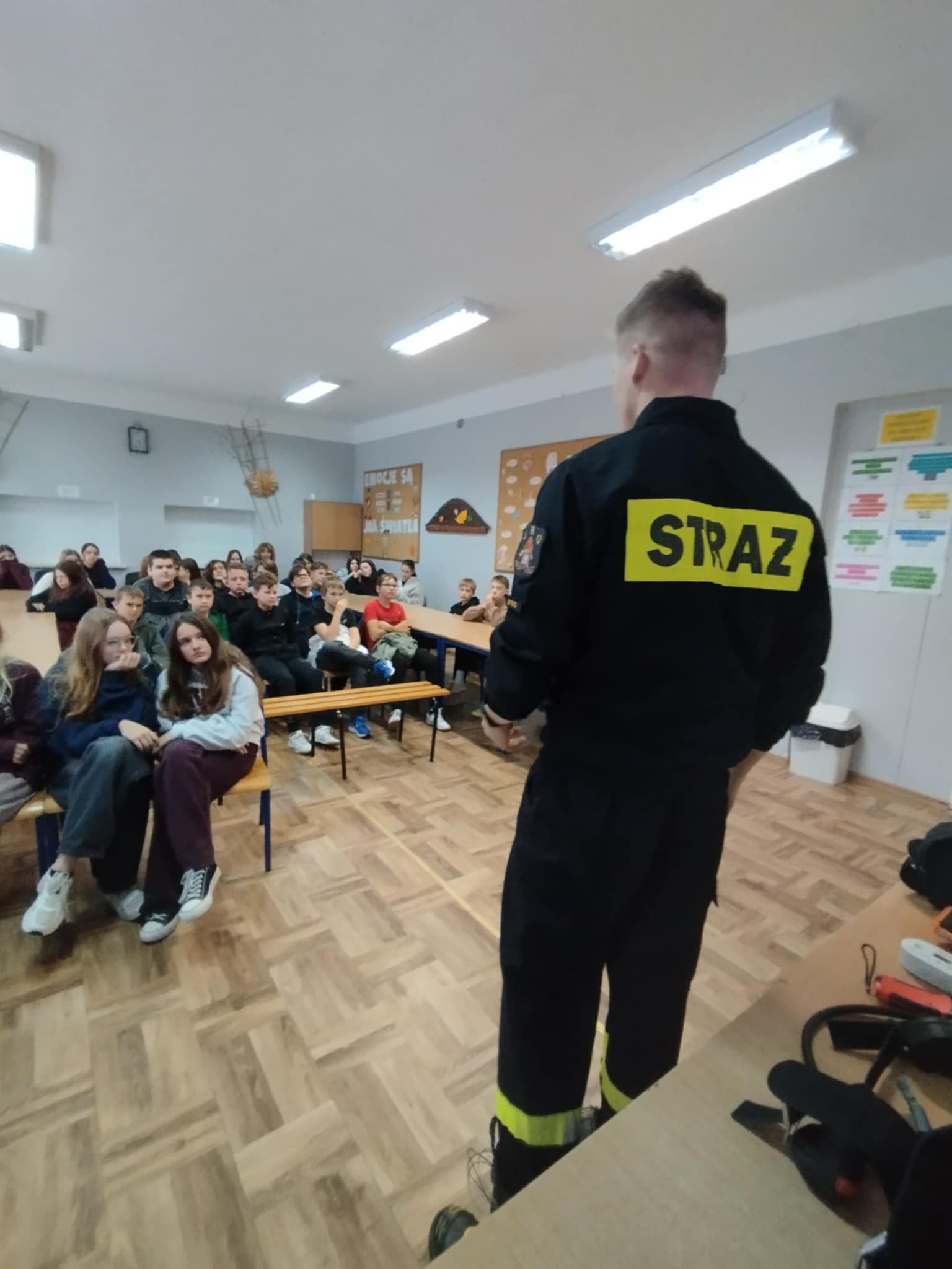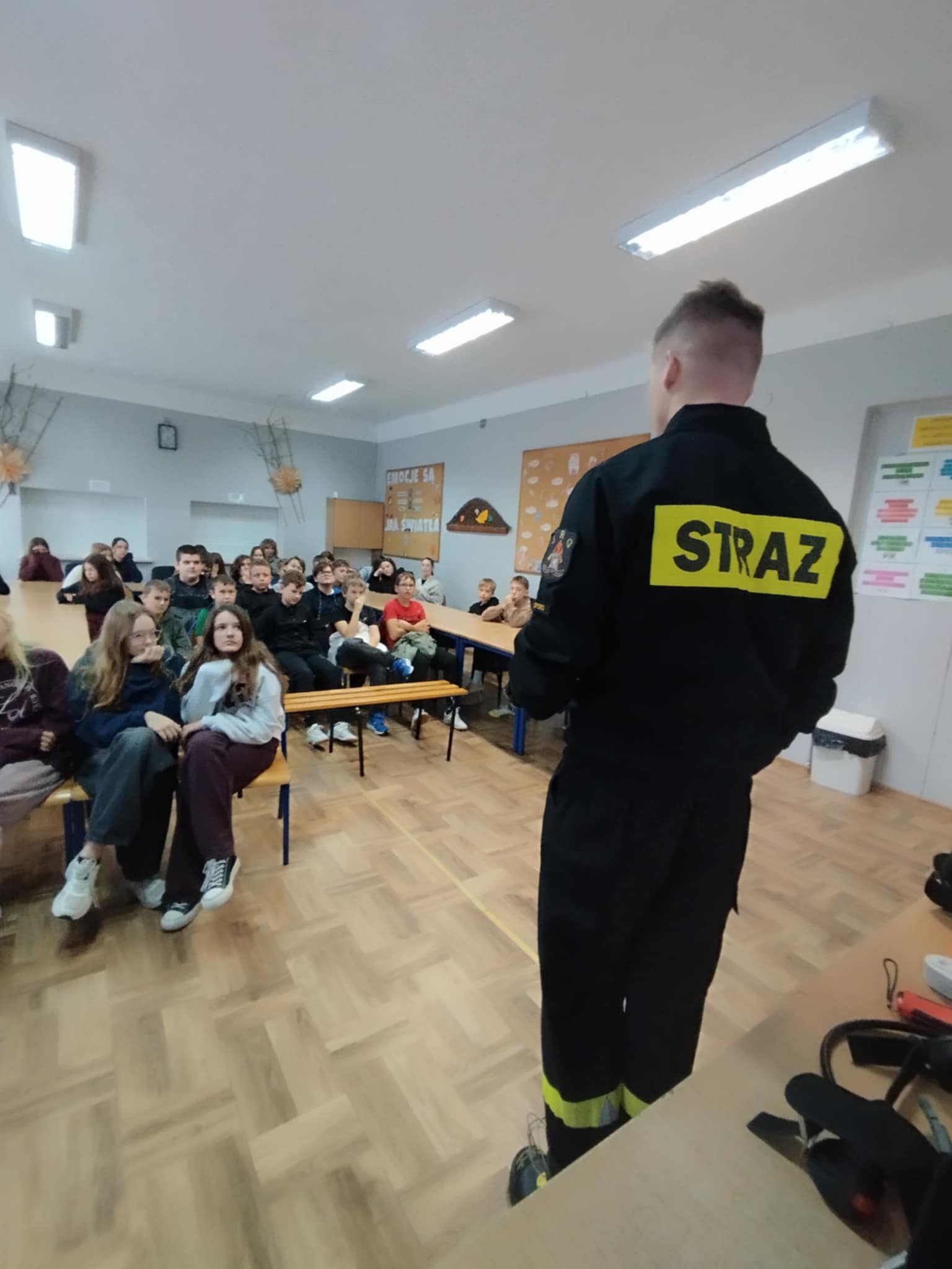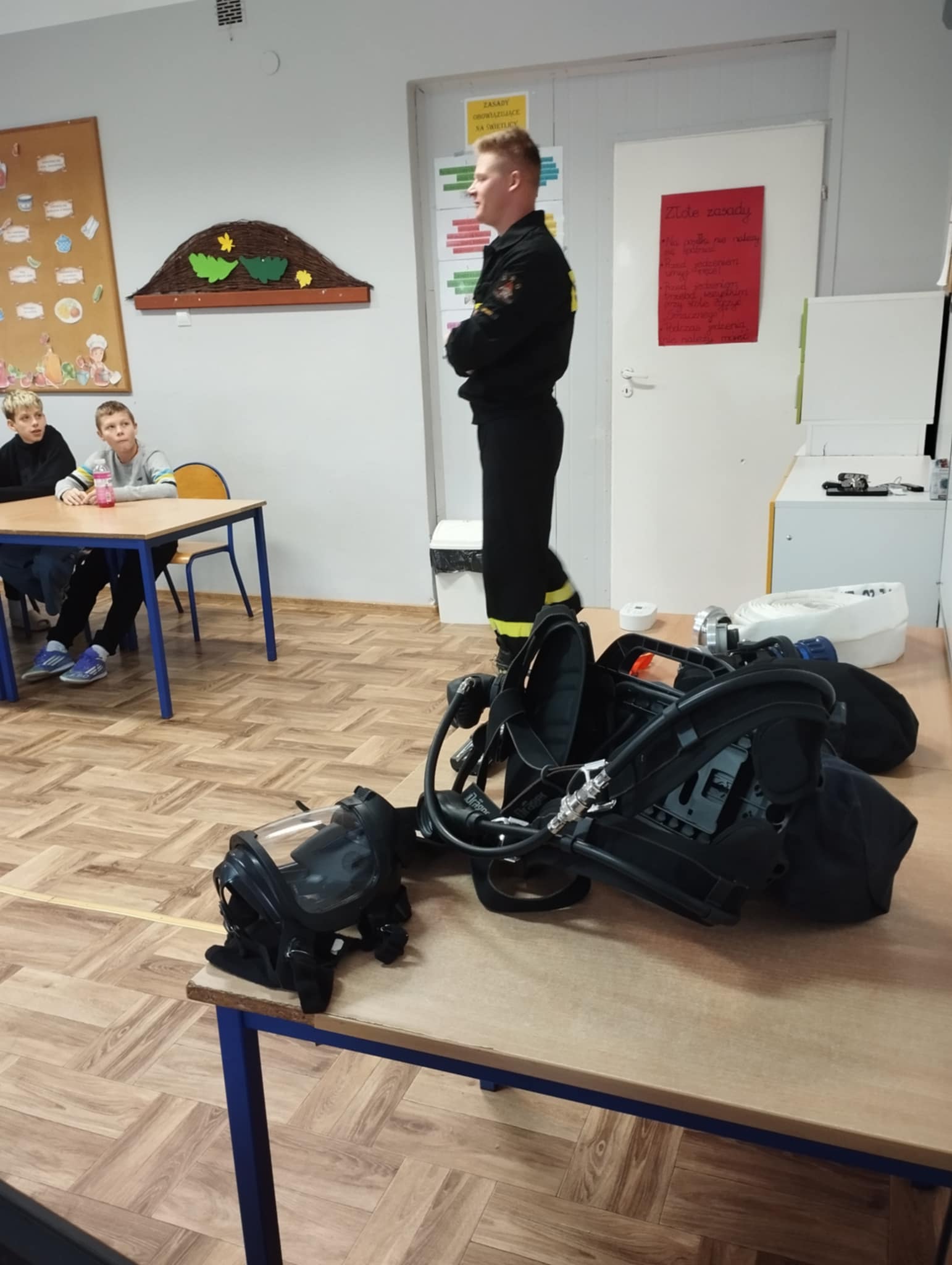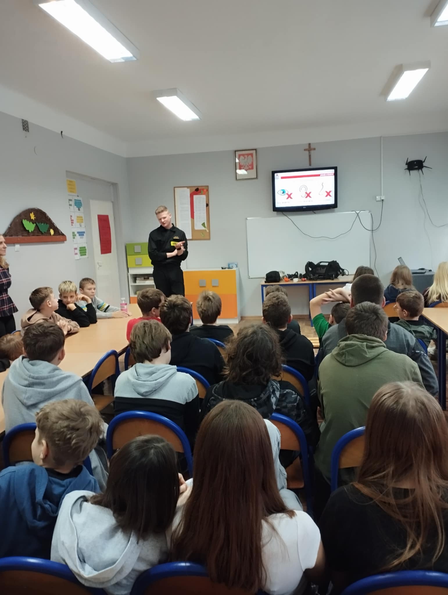 Dziś w naszej szkole odbyły się wyjątkowe zajęcia edukacyjne przeprowadzone przez funkcjonariusza Państwowej Straży Pożarnej w Lipsku mł. kpt. Pana Dominika Kominka. Była to niezwykle cenna lekcja bezpieczeństwa, która pokazała uczniom, jak ważna jest wiedza i odpowiednie reakcje w sytuacjach zagrożenia. Podczas prelekcji Pan strażak opowiedział o swojej codziennej pracy, sprzęcie oraz najczęstszych przyczynach pożarów. Szczególnie dużo uwagi poświecił czujkom dymu – urządzeniom, które mogą uratować życie. Uczniowie dowiedzieli się: jak działa czujka dymu, gdzie powinna być zamontowana, jak często należy sprawdzać jej działanie, dlaczego jest ważnym elementem bezpieczeństwa domowego. Uczniowie przypomnieli sobie również podstawowe zasady postępowania w przypadku pożaru, sposoby wzywania pomocy oraz konieczności zachowania spokoju w sytuacjach kryzysowych. Zajęcia były urozmaicone pokazem sprzętu oraz praktycznymi wskazówkami które na długo zapadną naszym uczniom w pamięci. Serdecznie dziękujemy, Panu Dominikowi za poświęcony czas, profesjonalizm i zaangażowanie w edukację naszych uczniów.