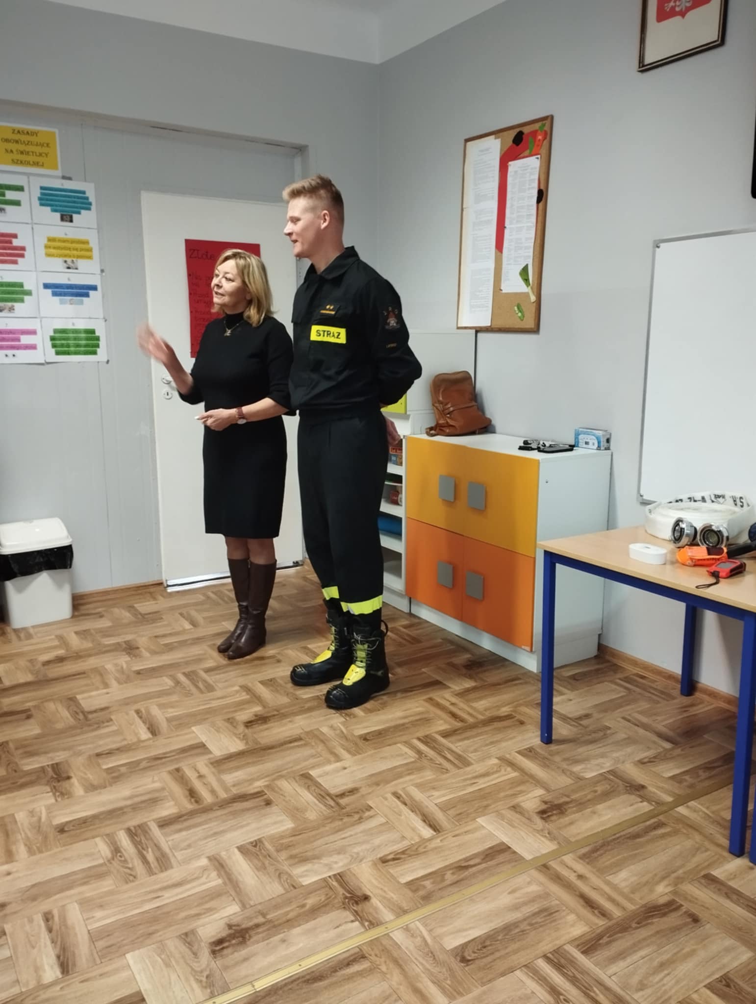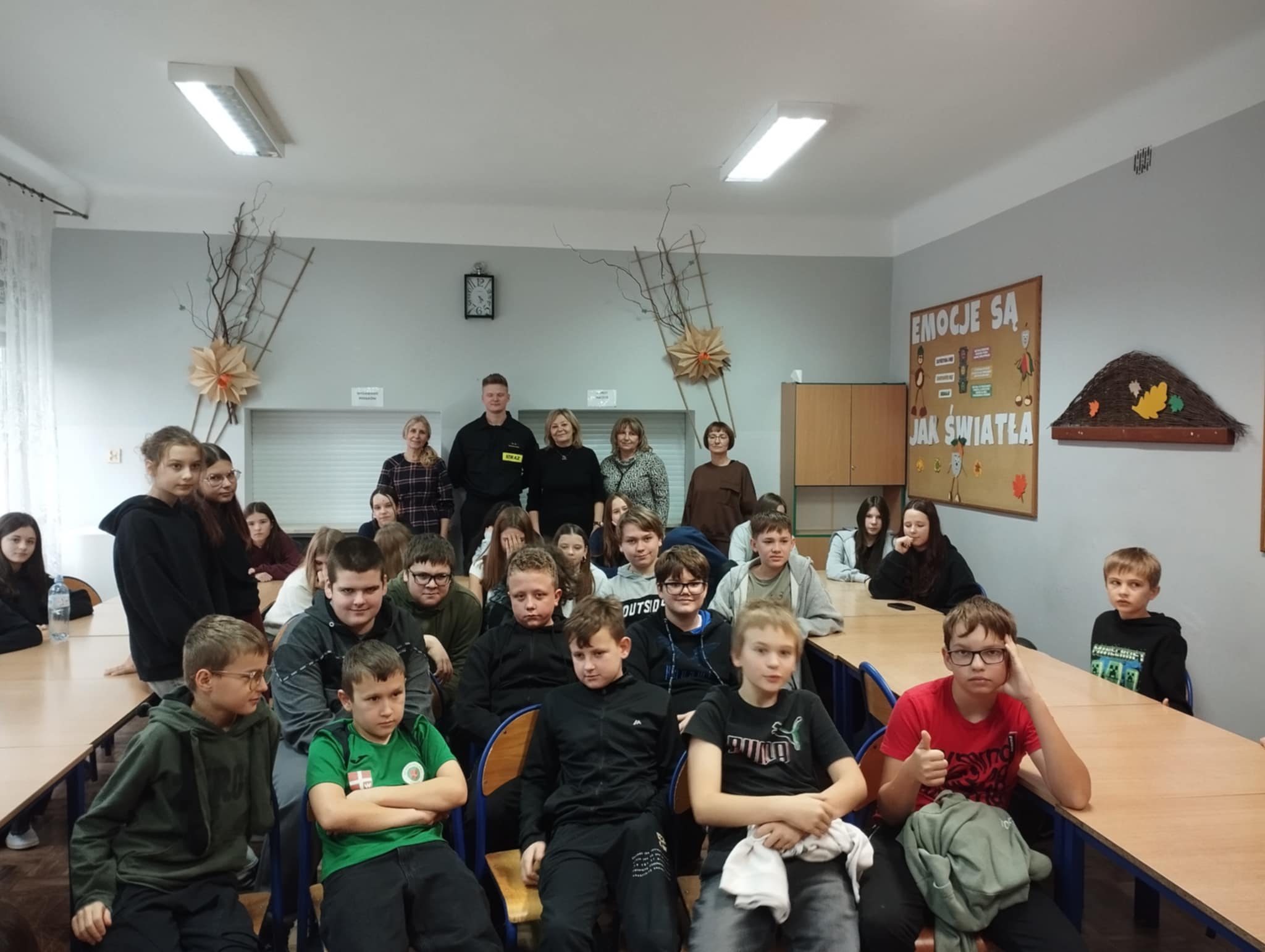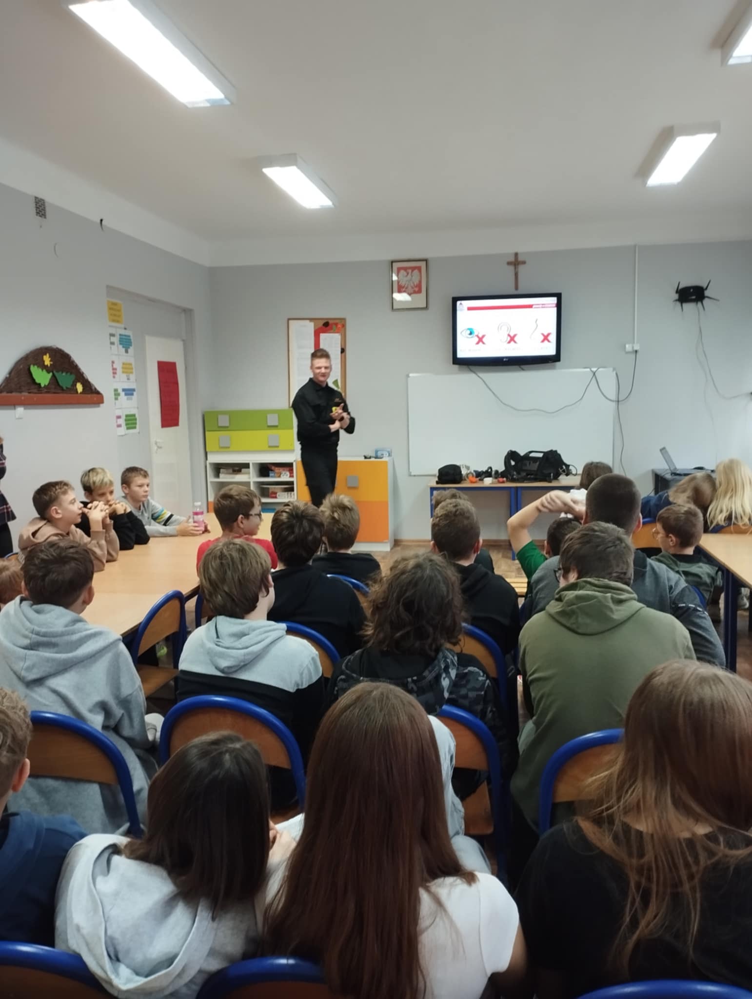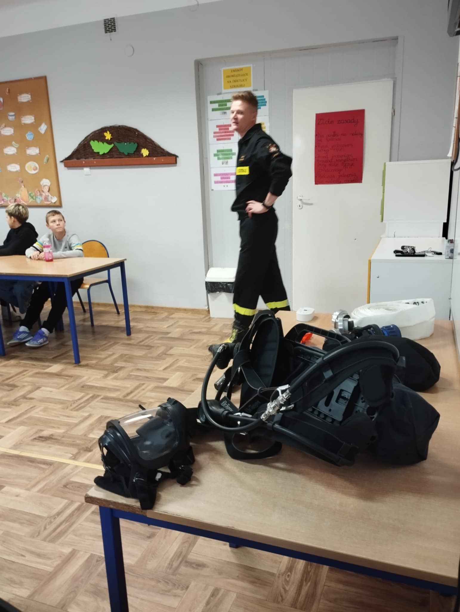 Dziś w naszej szkole odbyły się wyjątkowe zajęcia edukacyjne przeprowadzone przez funkcjonariusza Państwowej Straży Pożarnej w Lipsku mł. kpt. Pana Dominika Kominka. Była to niezwykle cenna lekcja bezpieczeństwa, która pokazała uczniom, jak ważna jest wiedza i odpowiednie reakcje w sytuacjach zagrożenia. Podczas prelekcji Pan strażak opowiedział o swojej codziennej pracy, sprzęcie oraz najczęstszych przyczynach pożarów. Szczególnie dużo uwagi poświecił czujkom dymu – urządzeniom, które mogą uratować życie. Uczniowie dowiedzieli się: jak działa czujka dymu, gdzie powinna być zamontowana, jak często należy sprawdzać jej działanie, dlaczego jest ważnym elementem bezpieczeństwa domowego. Uczniowie przypomnieli sobie również podstawowe zasady postępowania w przypadku pożaru, sposoby wzywania pomocy oraz konieczności zachowania spokoju w sytuacjach kryzysowych. Zajęcia były urozmaicone pokazem sprzętu oraz praktycznymi wskazówkami które na długo zapadną naszym uczniom w pamięci. Serdecznie dziękujemy, Panu Dominikowi za poświęcony czas, profesjonalizm i zaangażowanie w edukację naszych uczniów.
