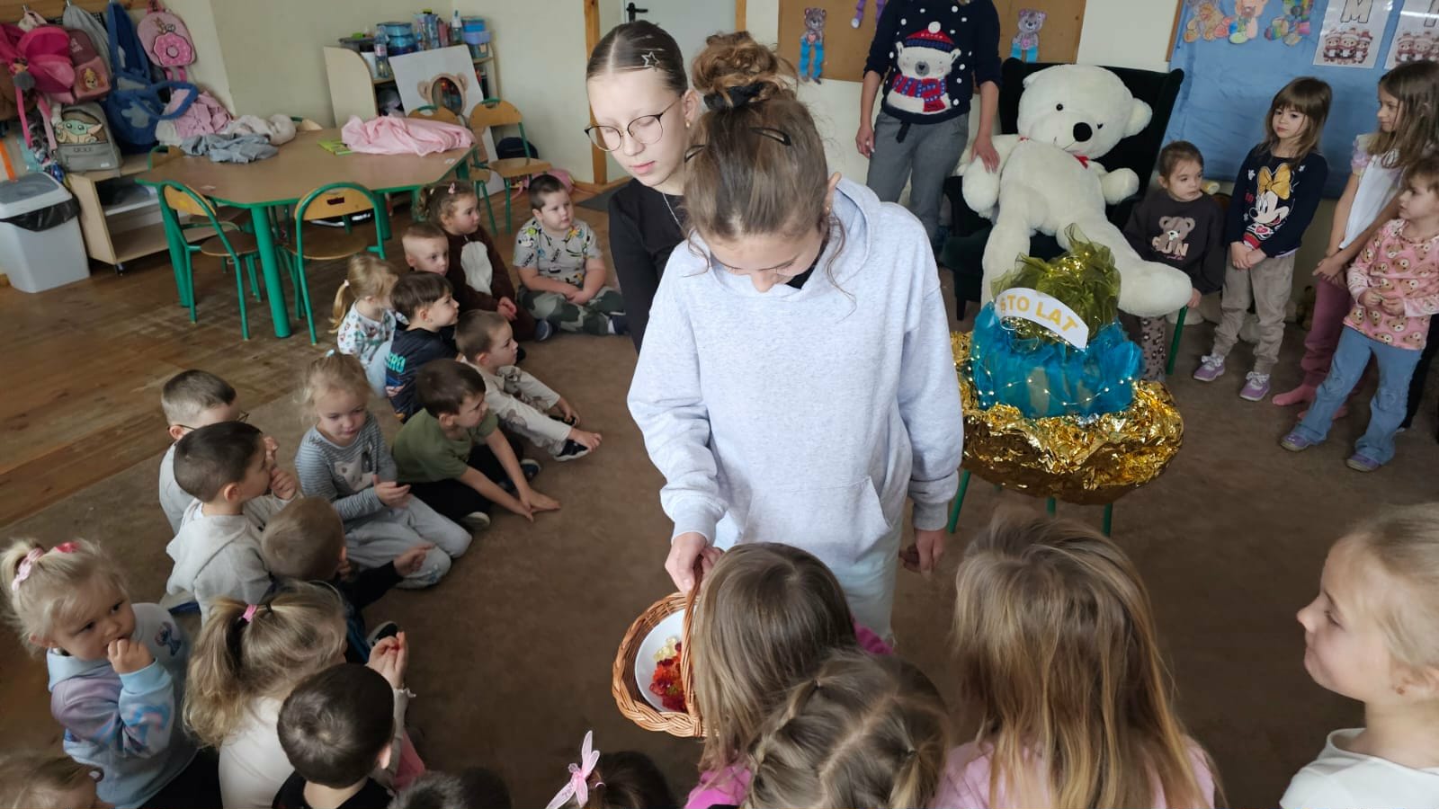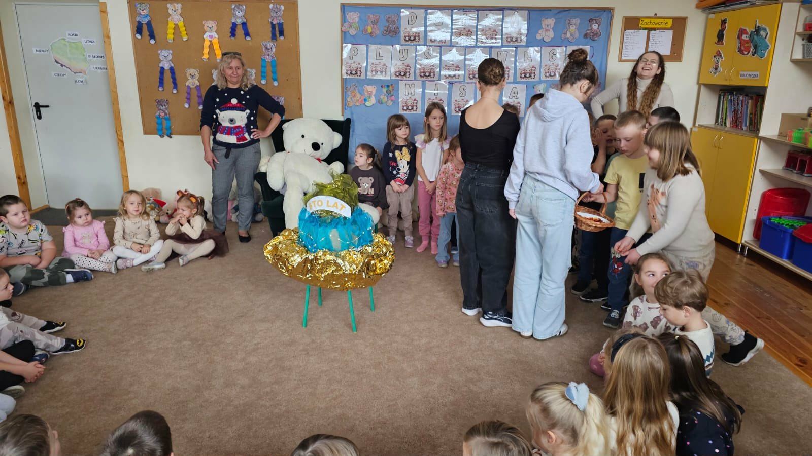 Każdy uczestnik otrzymał odznakę „Przyjaciel Misia” oraz misiowe żelki, które znikały szybciej niż miodek z misiowego garnuszka. A wisienką na torcie… był TORT! I oczywiście gromkie „Sto lat”, które obudziłoby nawet największego śpiocha-misia!