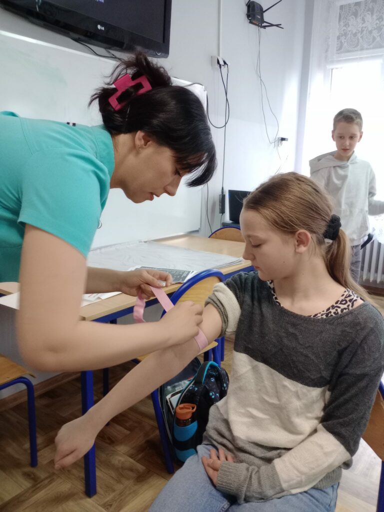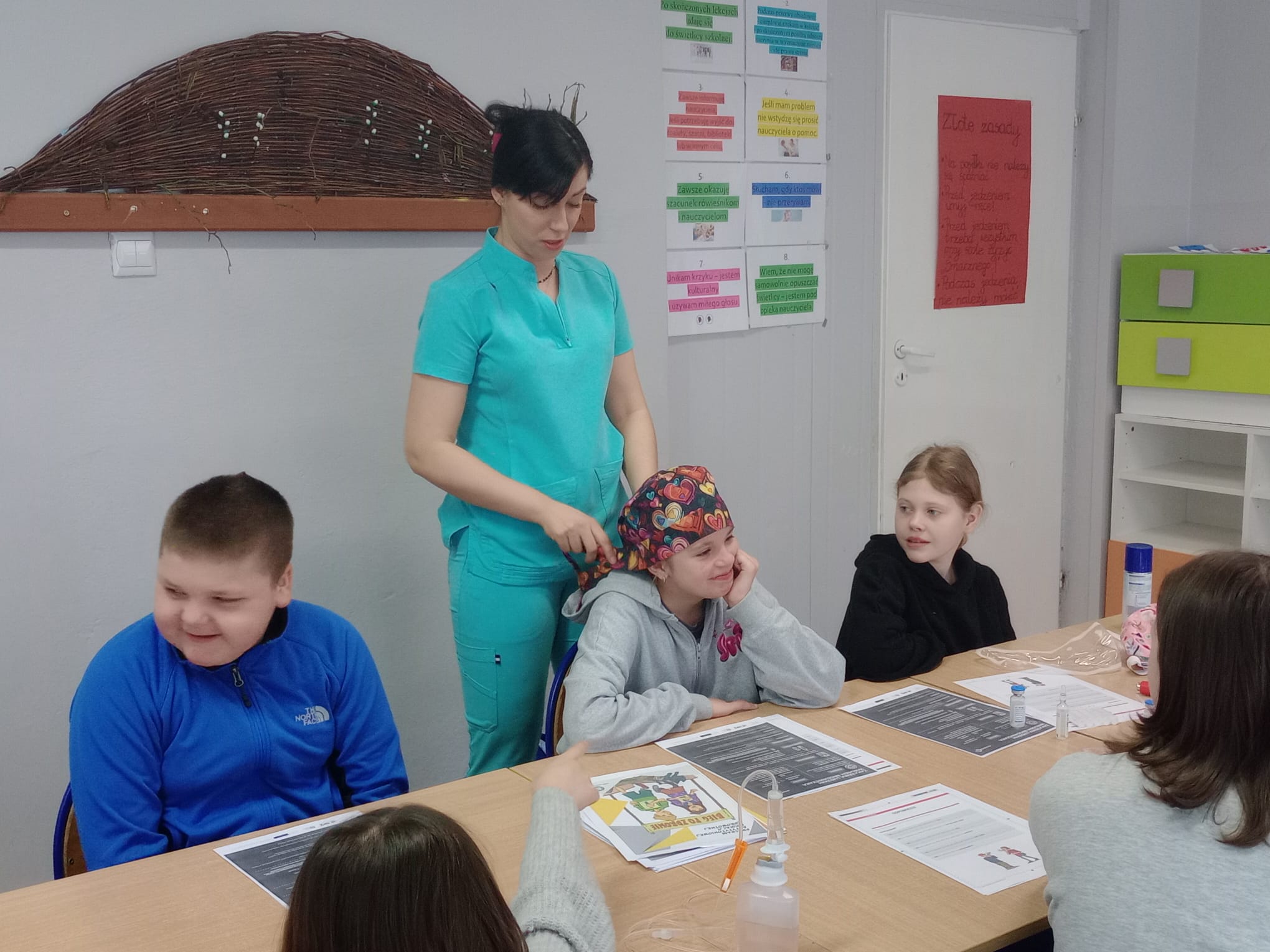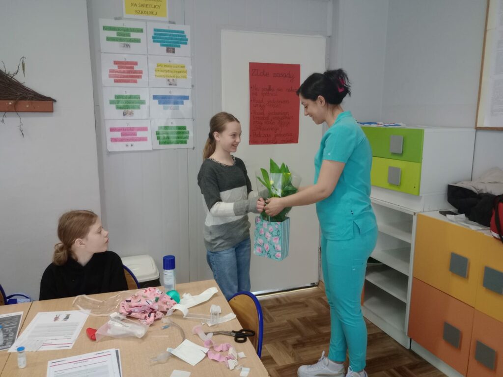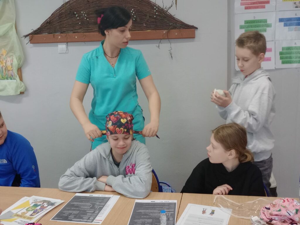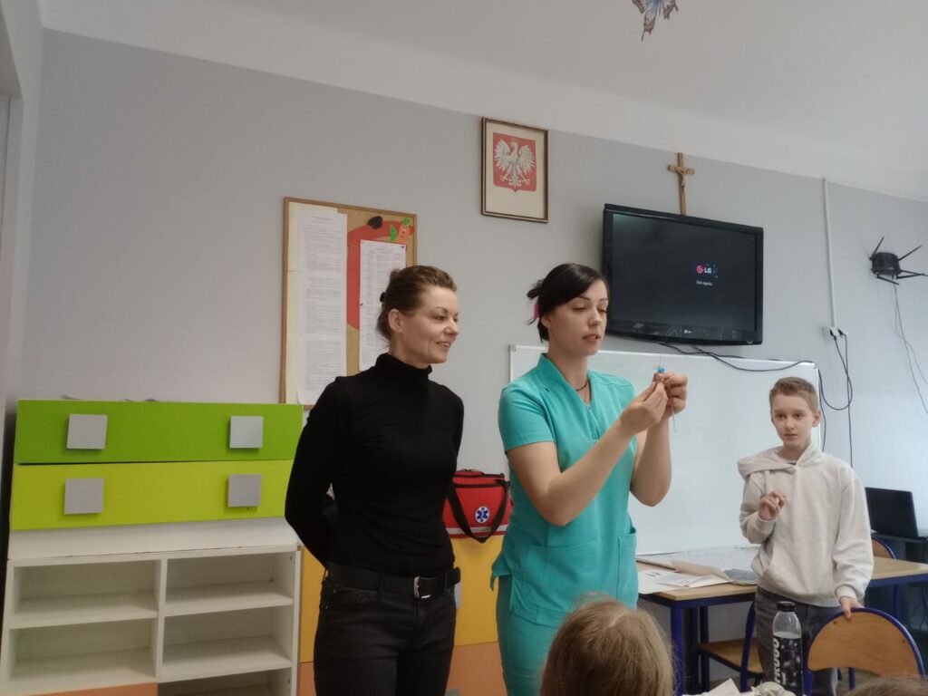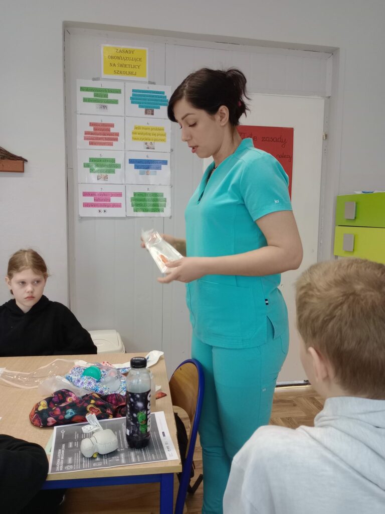 Nasz gość opowiedział uczniom czwartej klasy o swoim zawodzie, podkreślając, jak ważna i odpowiedzialna jest praca pielęgniarki. Dowiedzieliśmy się, jak wygląda codzienna pomoc pacjentom, troska o ich zdrowie oraz wsparcie w trudnych chwilach.