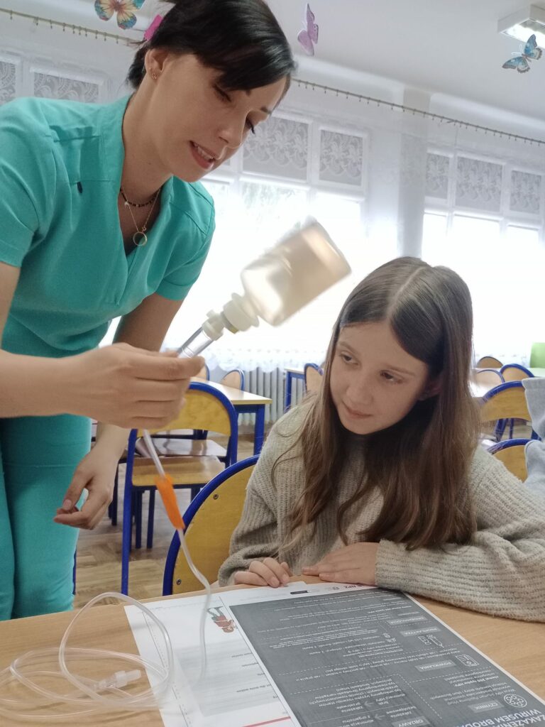 15.04.2026r. w naszej szkole odbyło się spotkanie z Panią Karoliną Pękalą pielęgniarką, magister ze specjalizacją z anestezjologii i intensywnej terapii, która na co dzień pracuje w SPZZOZ w Lipsku, na Oddziale Anestezjologii i Intensywnej Terapii.