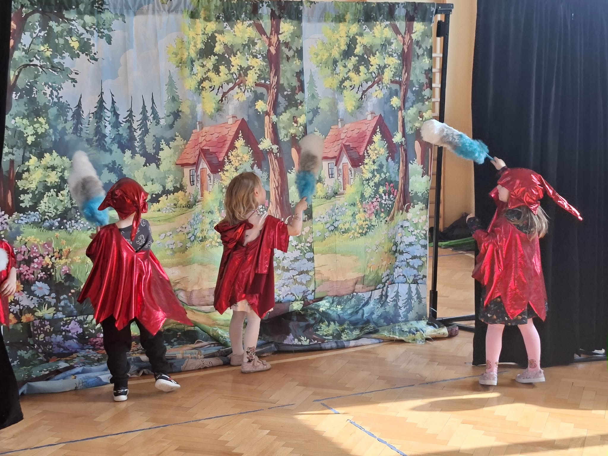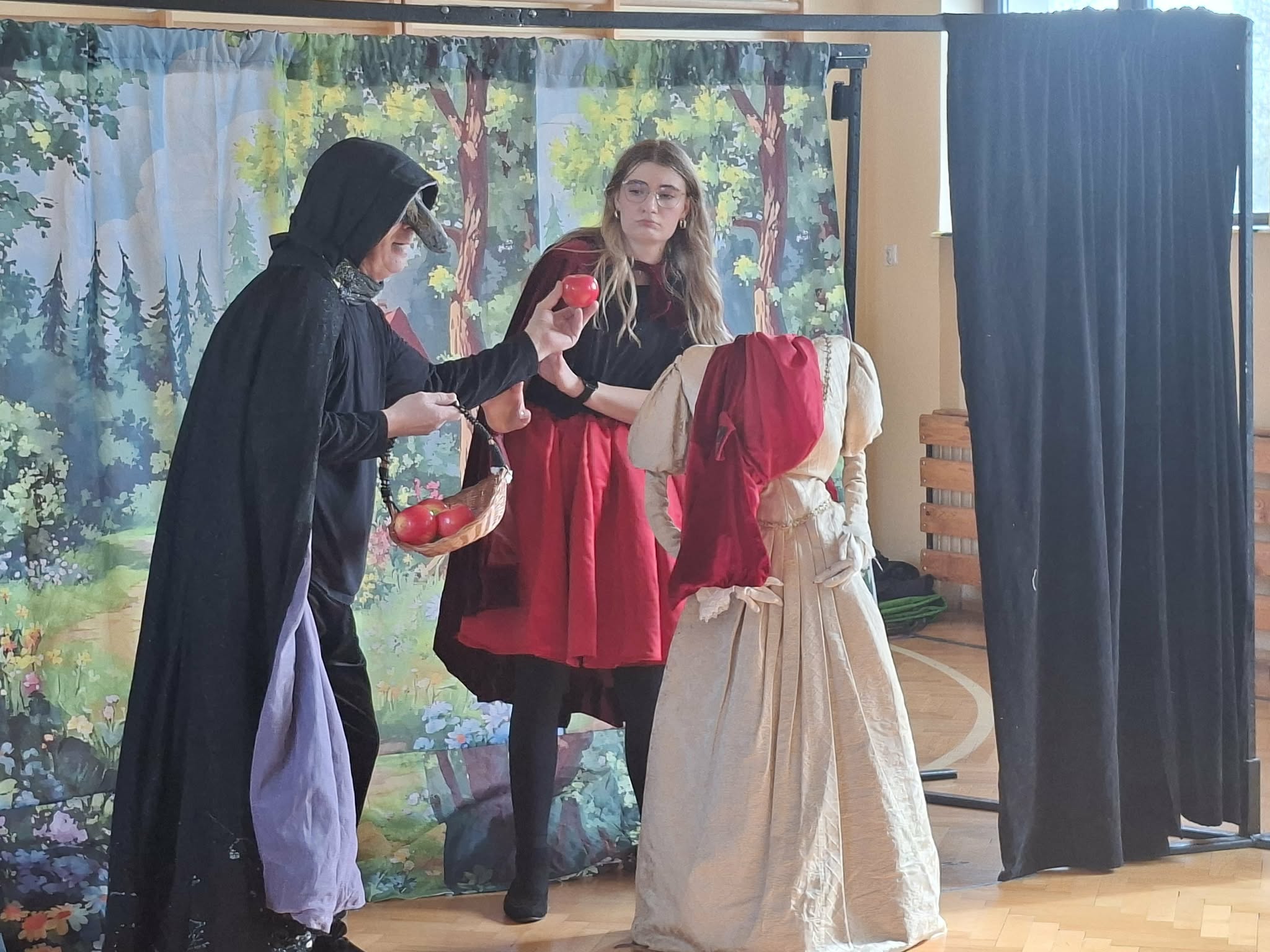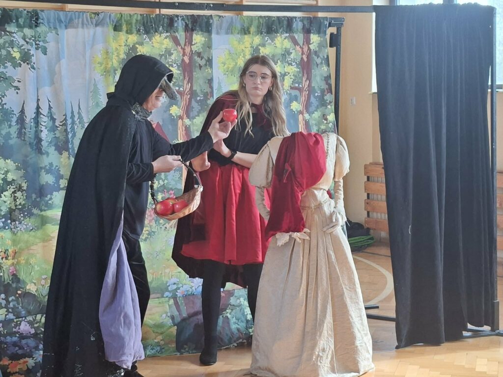 Gdy lustro odrzekło, że to Śnieżka jest najpiękniejsza- postanowiła się jej pozbyć. I tak dziewczynka trafiła do chatki krasnoludków w role których wcielili się nasi najmłodsi uczniowie. Historia- jak to w baśni- zakończyła się szczęśliwie, a przedstawienie bardzo podobało się dzieciom. Starannie przygotowane stroje, bogata scenografia to świetne uzupełnienie mistrzowskiej gry aktorów. Spontaniczne, żywe reakcje dzieci świadczą o tym, że spektakl był niezwykle udany.
